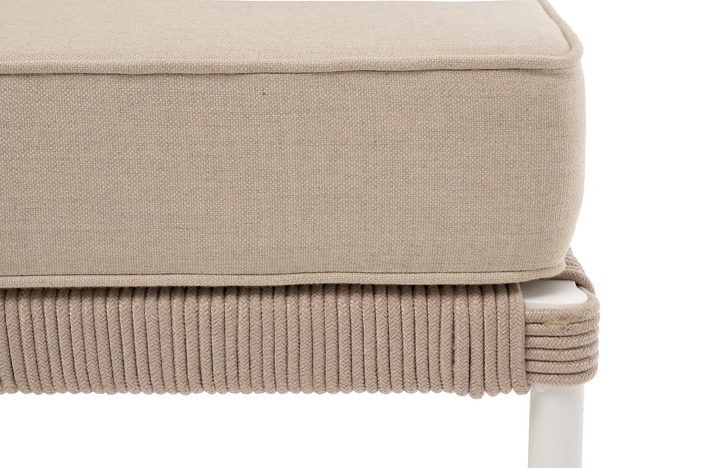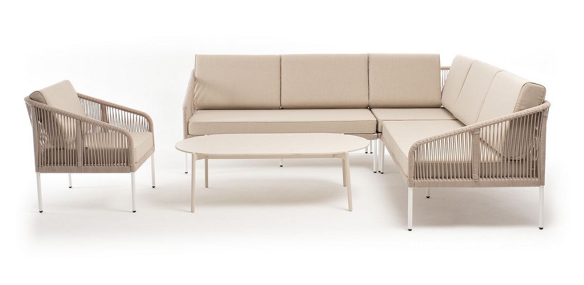 Каркас уличной мебели выполнен из износостойкого алюминия. Его дополняет бежевая ручная оплетка, изготовленная на основе эластичных синтетических лент из полиэфирных волокон высокой прочности (роупа).