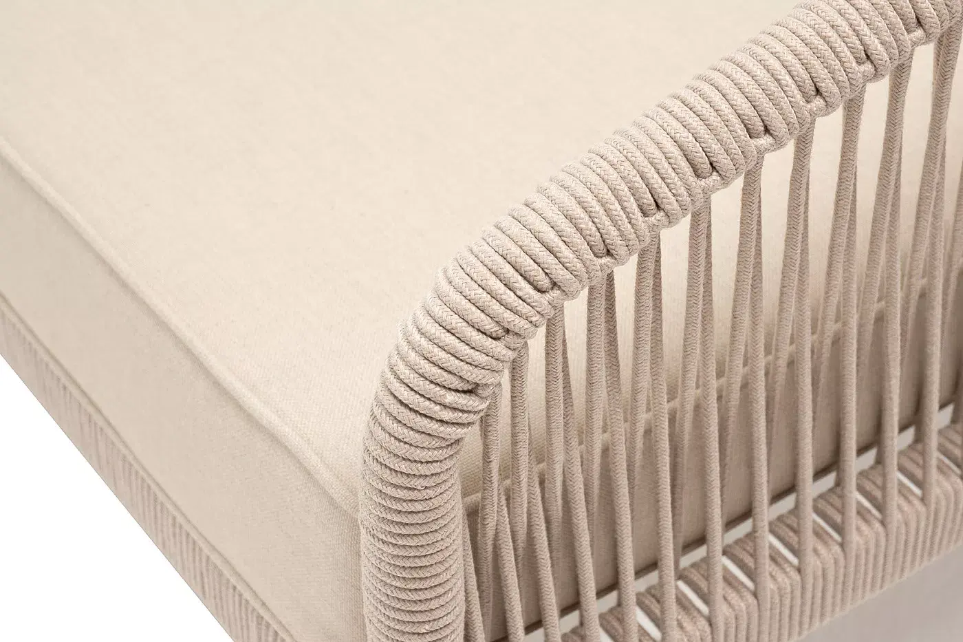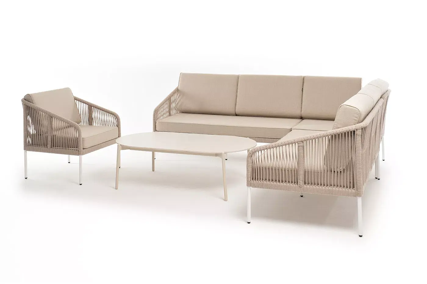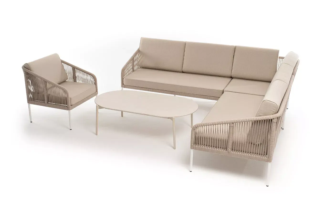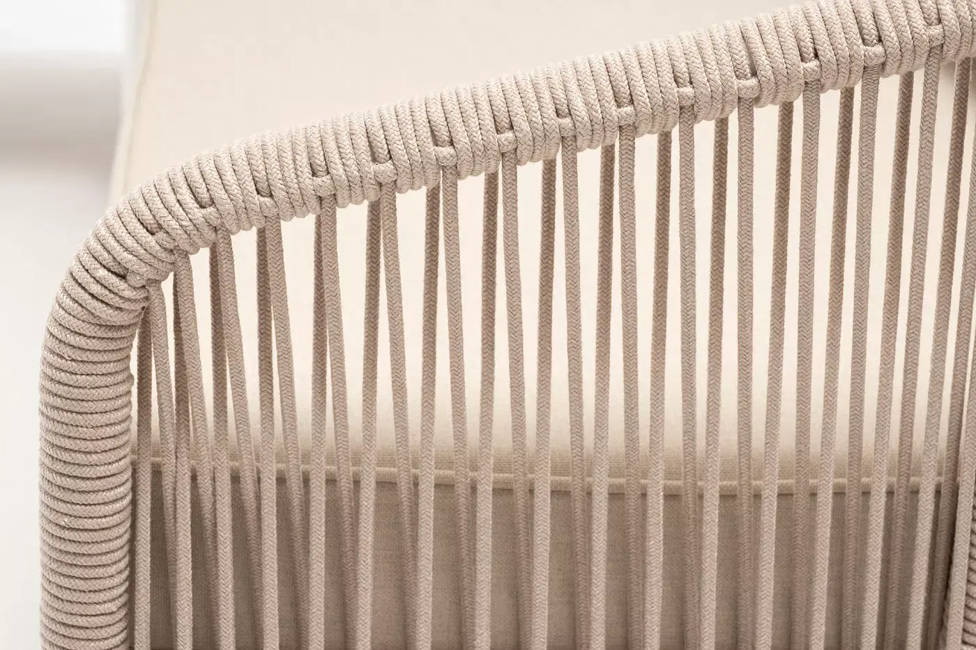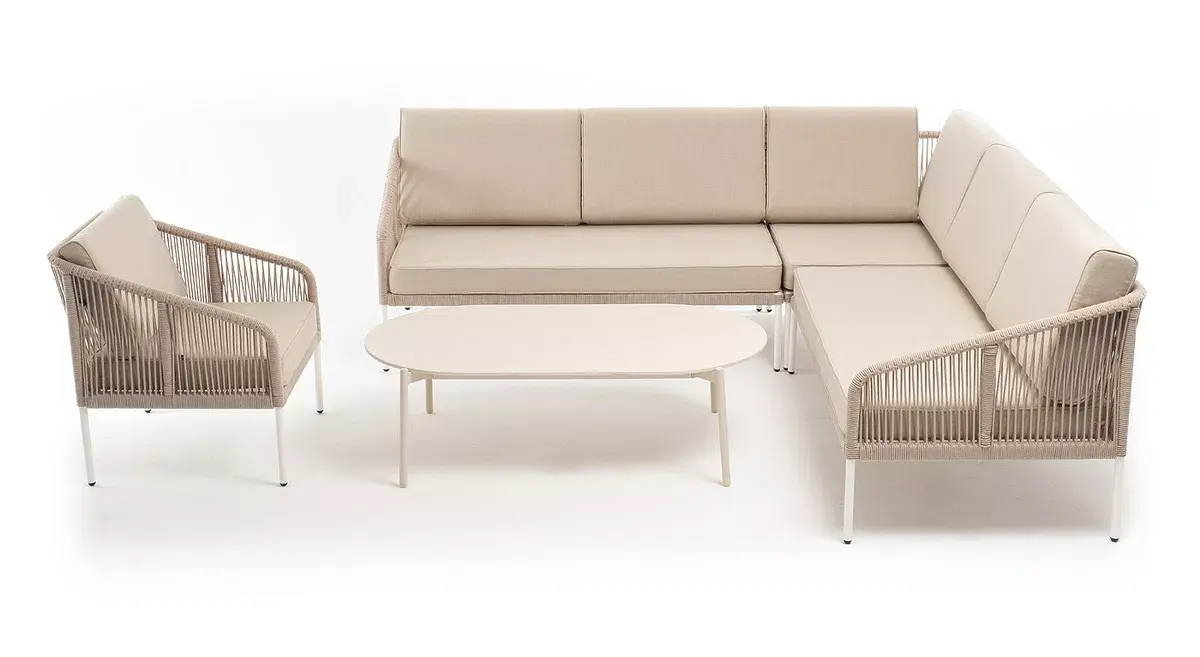 Каркас уличной мебели выполнен из износостойкого алюминия. Его дополняет бежевая ручная оплетка, изготовленная на основе эластичных синтетических лент из полиэфирных волокон высокой прочности (роупа).