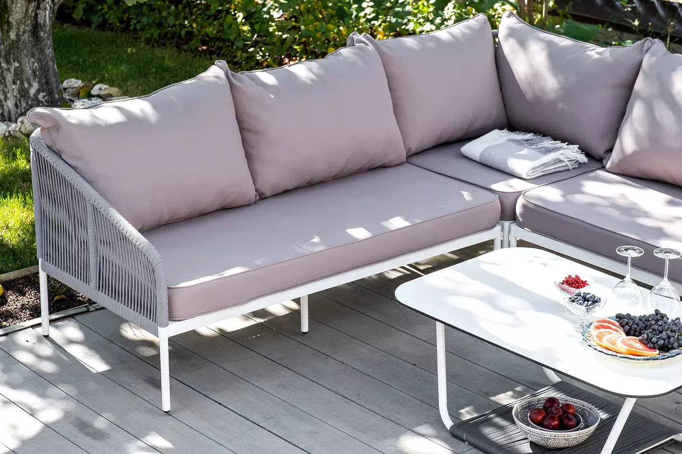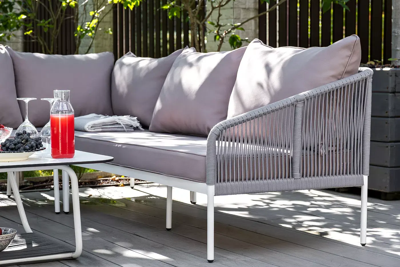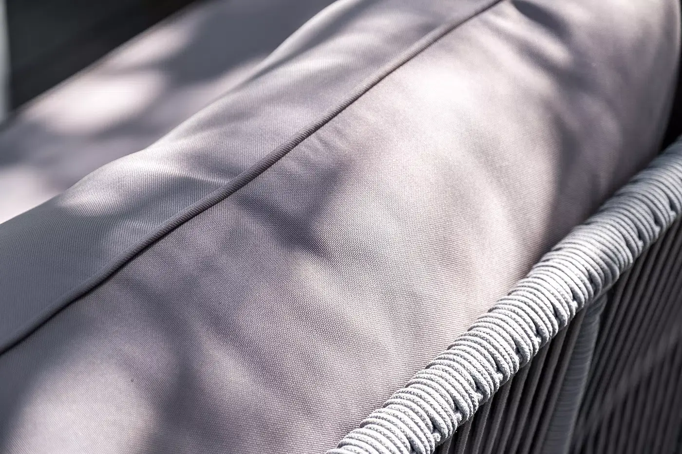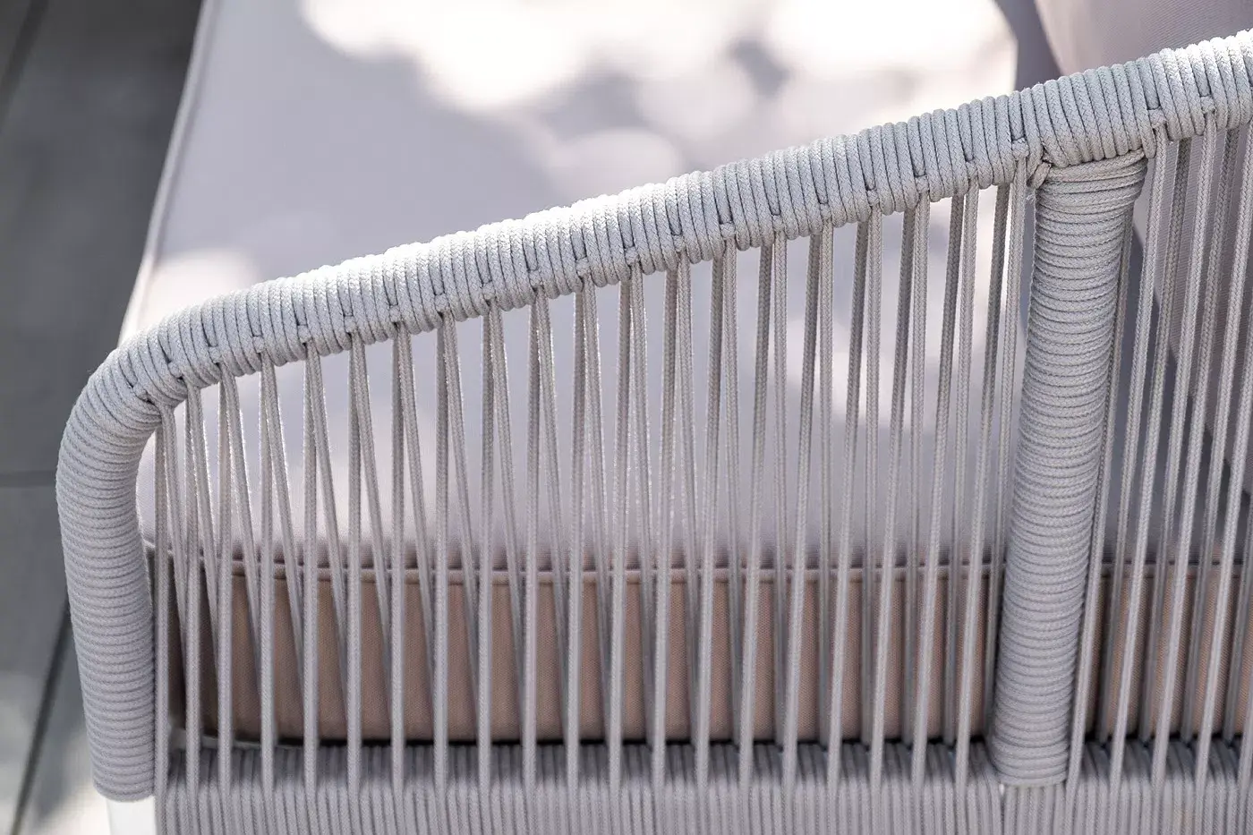 Каркас уличной мебели выполнен из износостойкого алюминия. Его дополняет светло-серая ручная оплетка, изготовленная на основе эластичных синтетических лент из полиэфирных волокон высокой прочности (роупа).