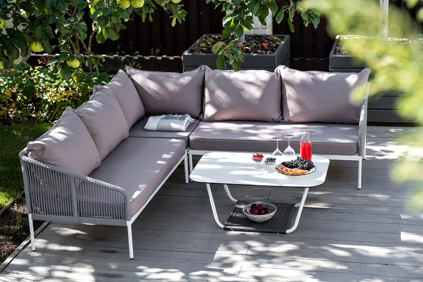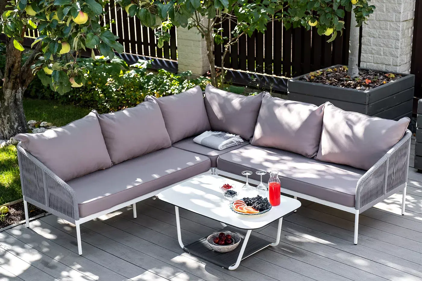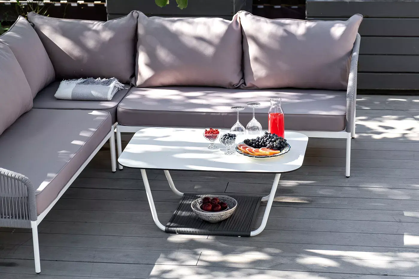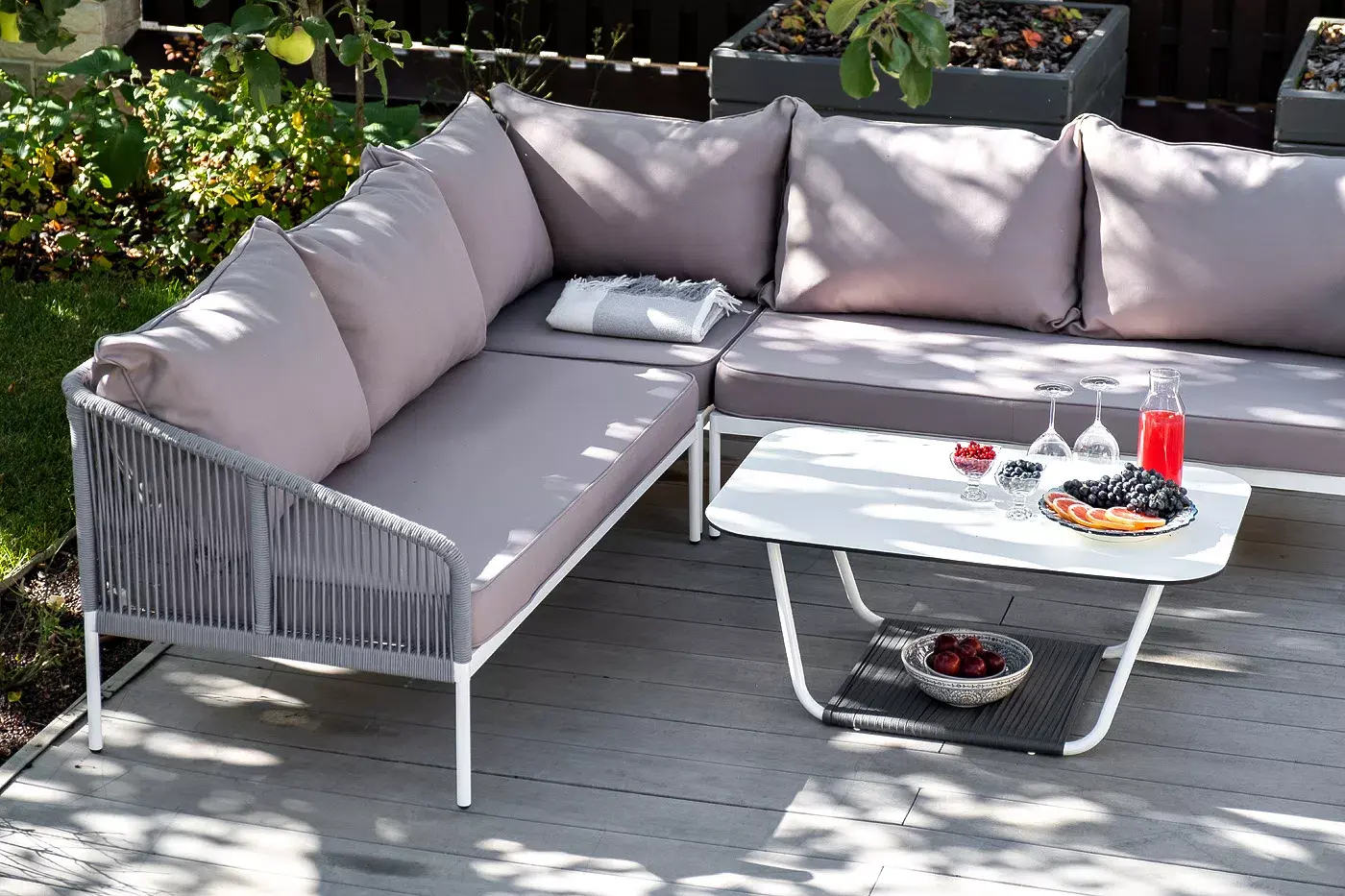 Каркас уличной мебели выполнен из износостойкого алюминия. Его дополняет светло-серая ручная оплетка, изготовленная на основе эластичных синтетических лент из полиэфирных волокон высокой прочности (роупа).