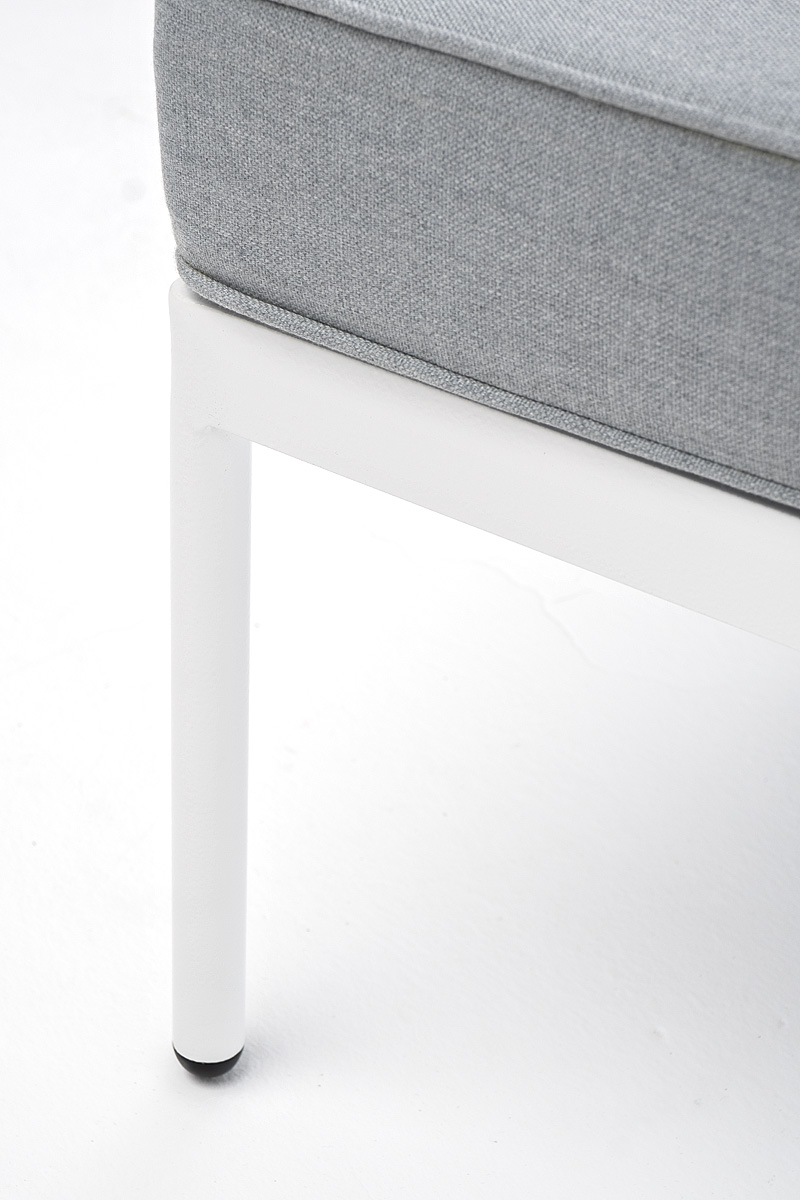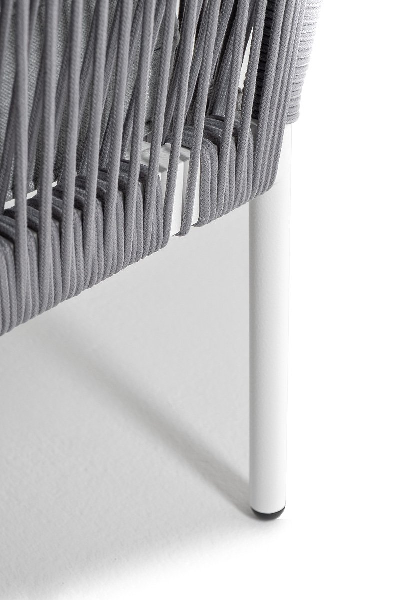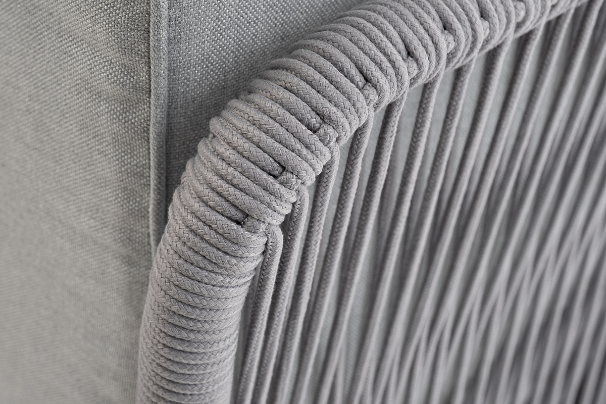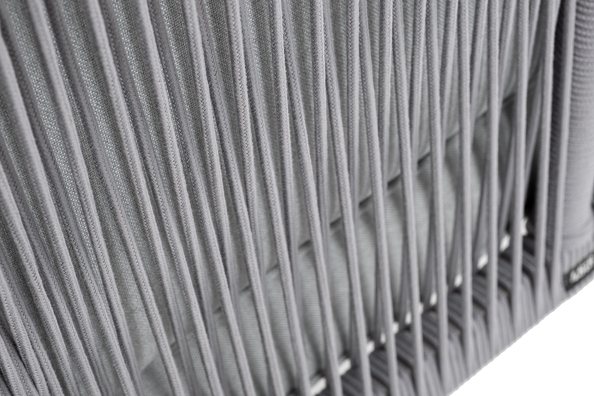 Плетеный модуль имеет алюминиевый каркас, окрашенный порошковой краской в белый цвет. Боковины каркаса вручную оплетены роупом - эластичными синтетическими лентами, изготовленными из высокопрочных полиэфирных волокон. Цвет оплетки - светло-серый.