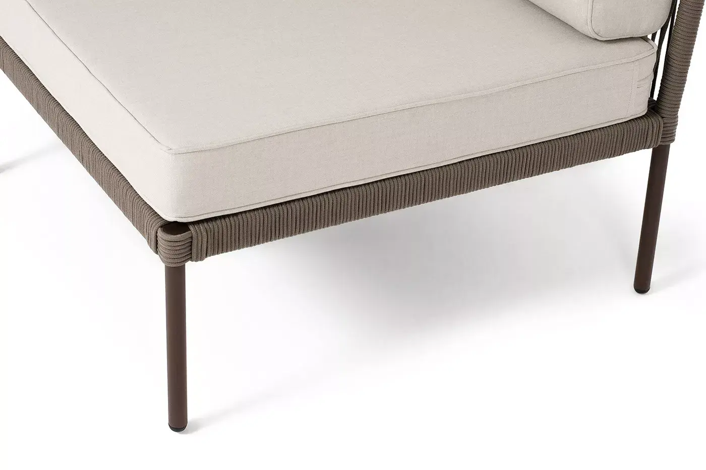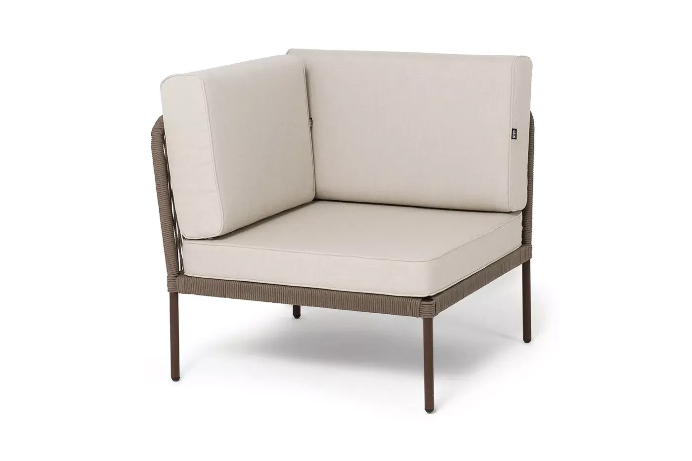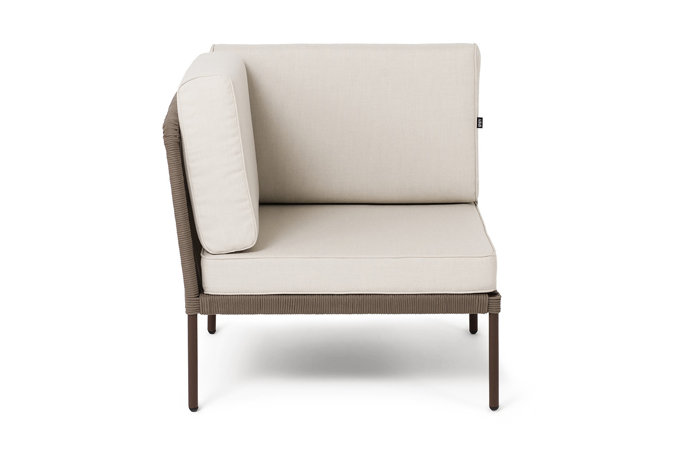 Плетеный модуль имеет алюминиевый каркас, окрашенный порошковой краской в коричневый (RAL8016) цвет. Боковины каркаса вручную оплетены роупом - эластичными синтетическими лентами, изготовленными из высокопрочных полиэфирных волокон. Цвет оплетки - коричневый.