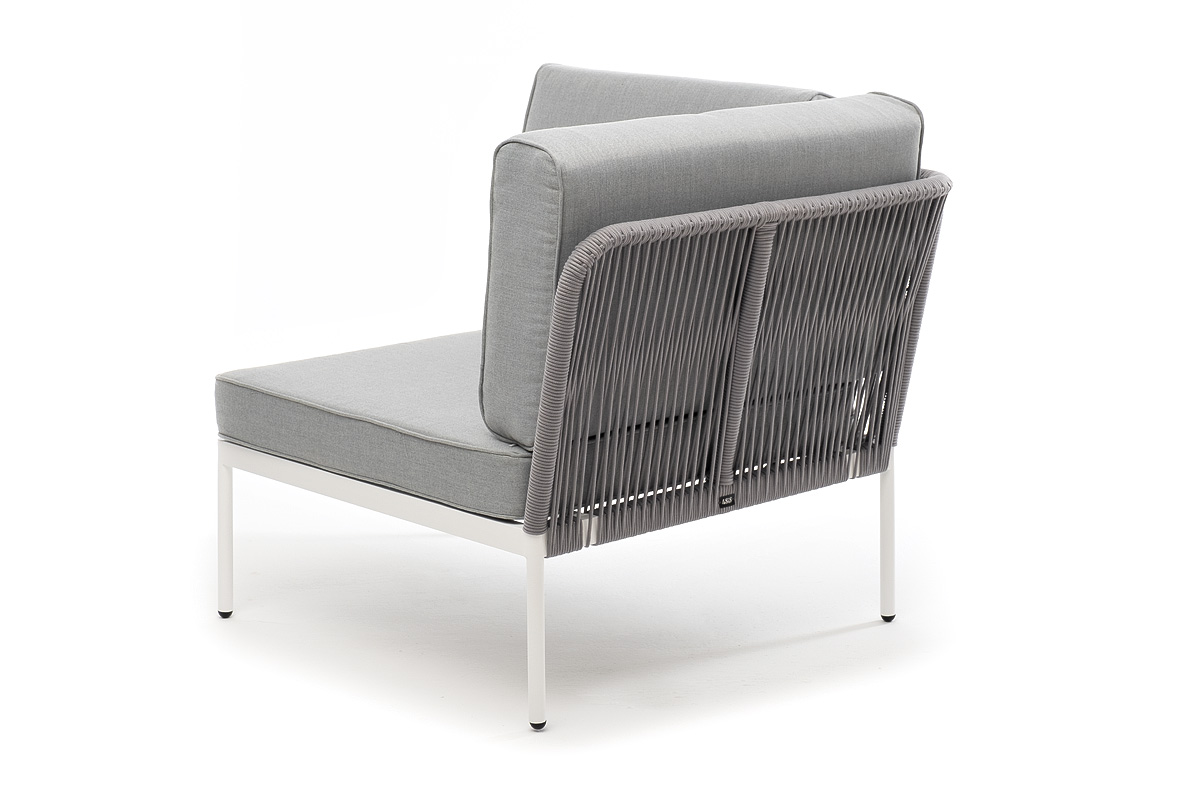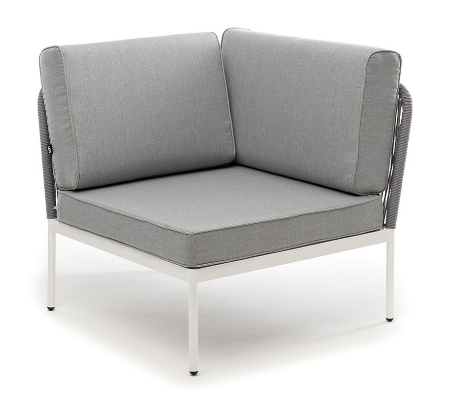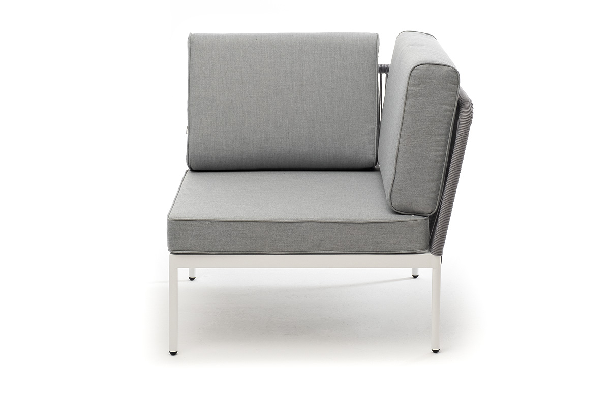 Плетеный модуль имеет алюминиевый каркас, окрашенный порошковой краской в светло-серый (RAL7035) цвет. Боковины каркаса вручную оплетены роупом - эластичными синтетическими лентами, изготовленными из высокопрочных полиэфирных волокон. Цвет оплетки - серый.