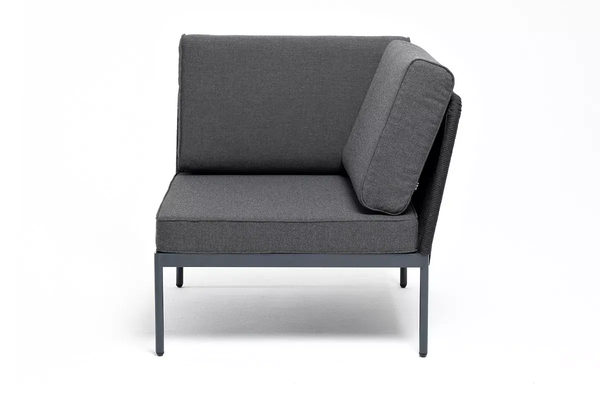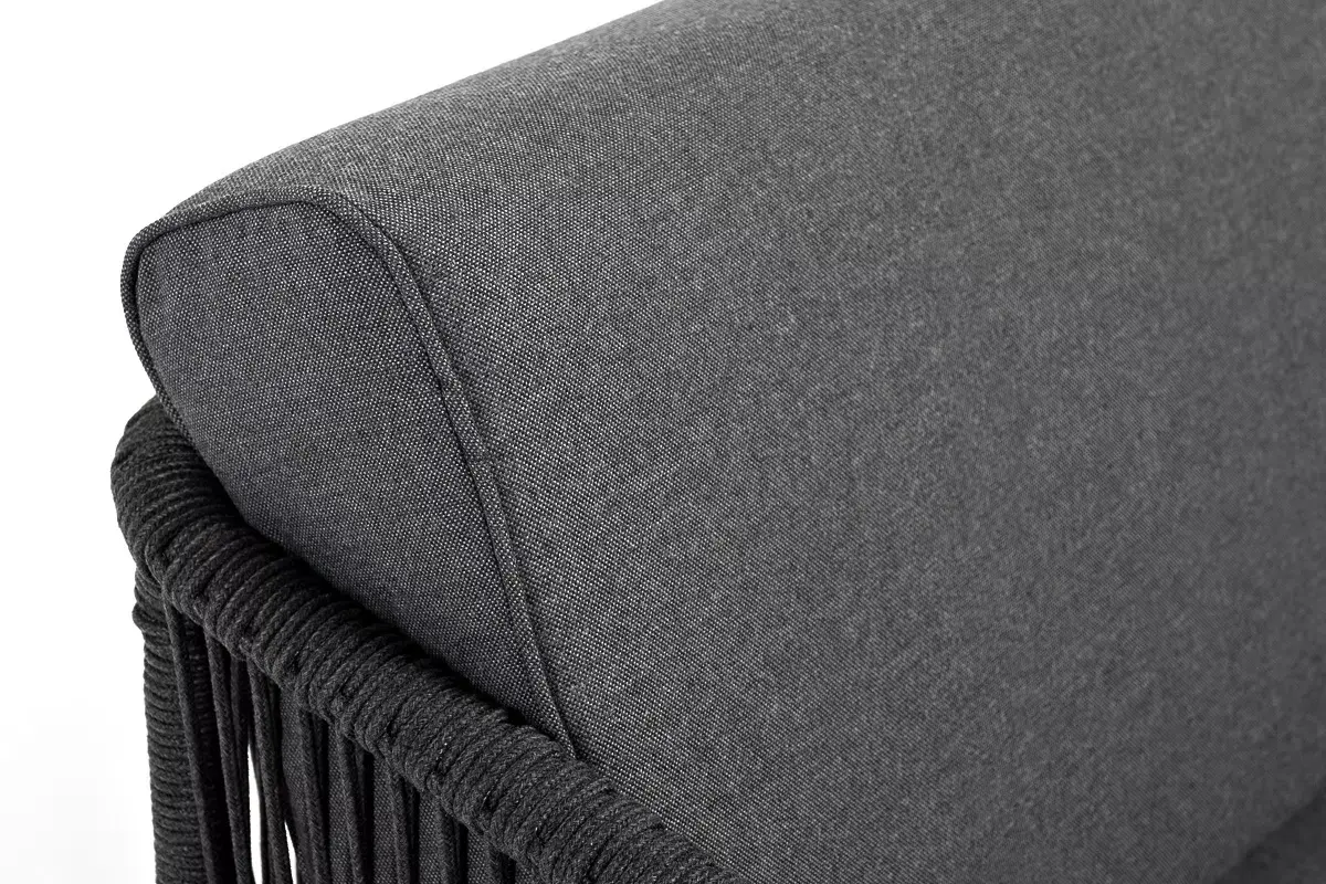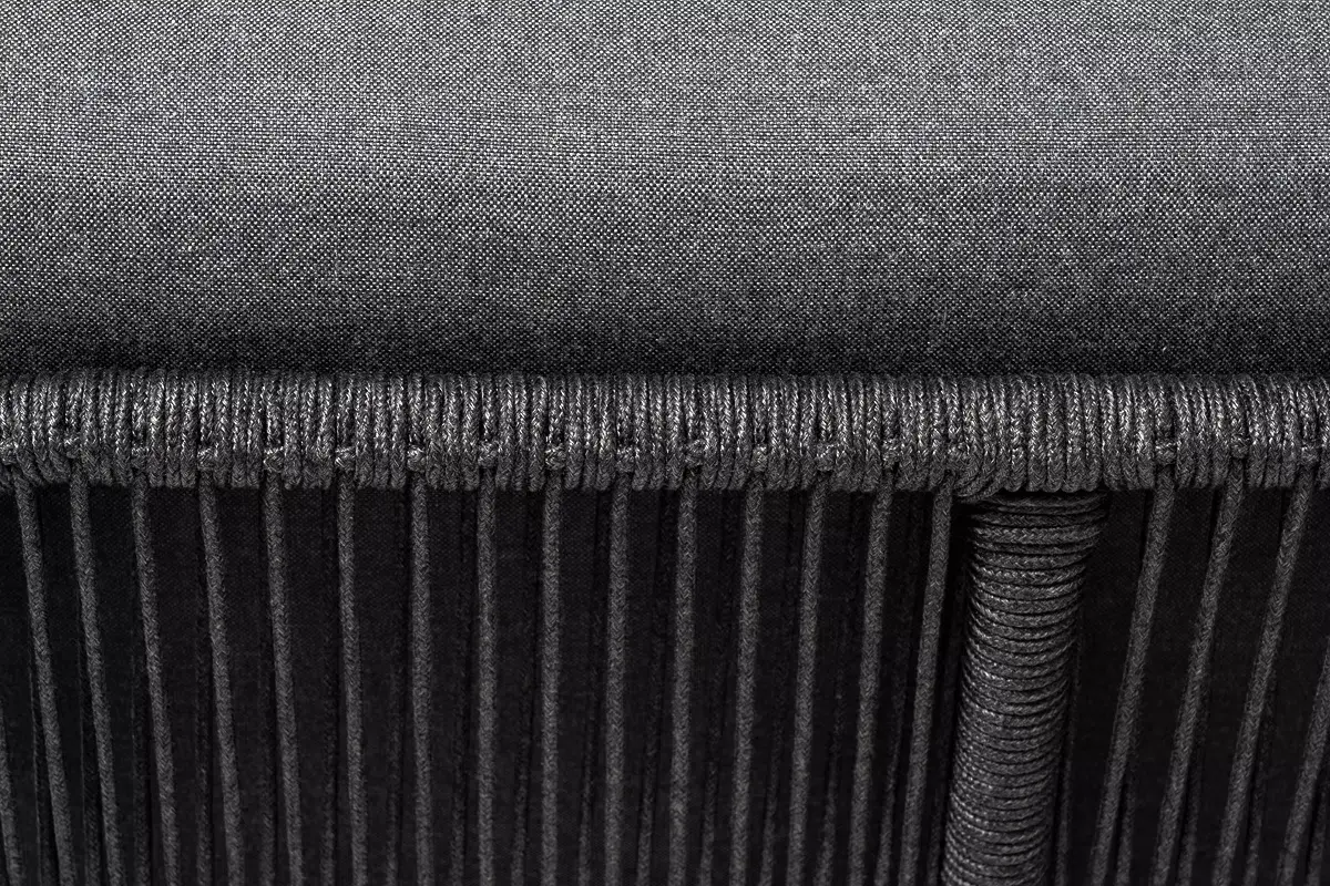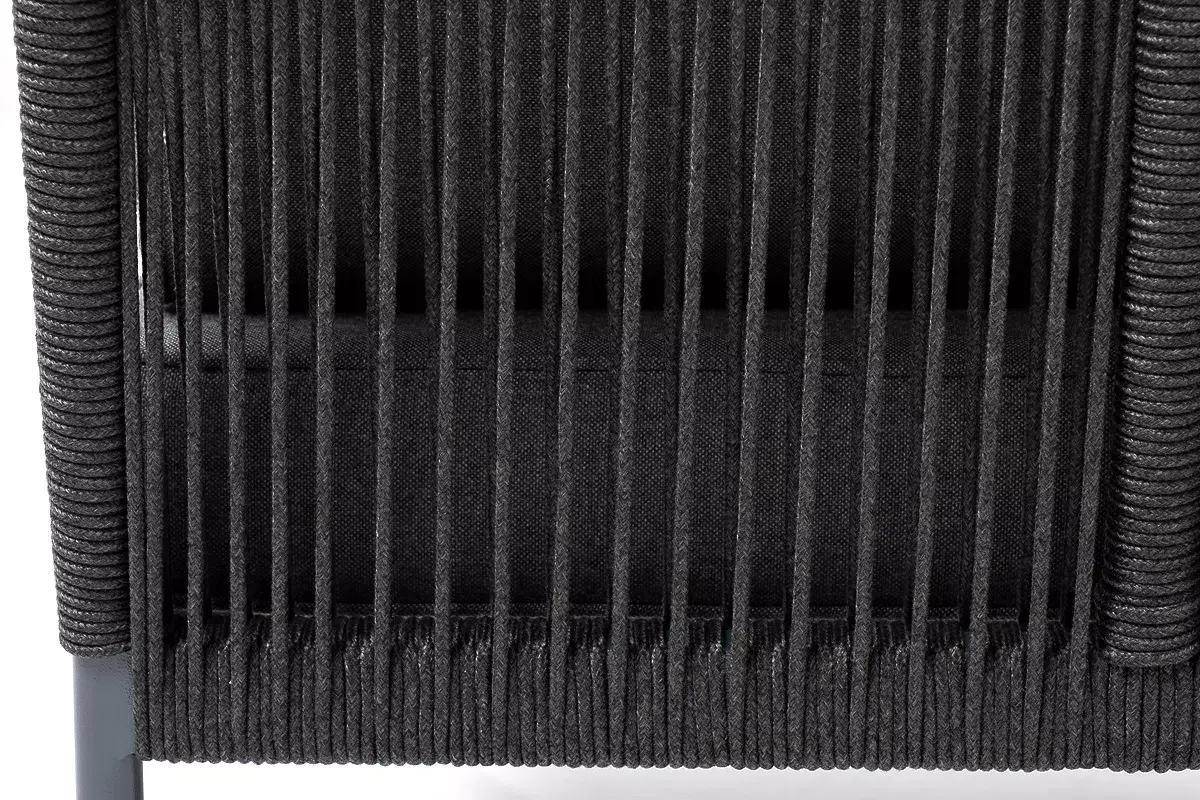 Плетеный модуль имеет алюминиевый каркас, окрашенный порошковой краской в темно-серый (RAL7024) цвет. Боковины каркаса вручную оплетены роупом - эластичными синтетическими лентами, изготовленными из высокопрочных полиэфирных волокон. Цвет оплетки - темно-серый.