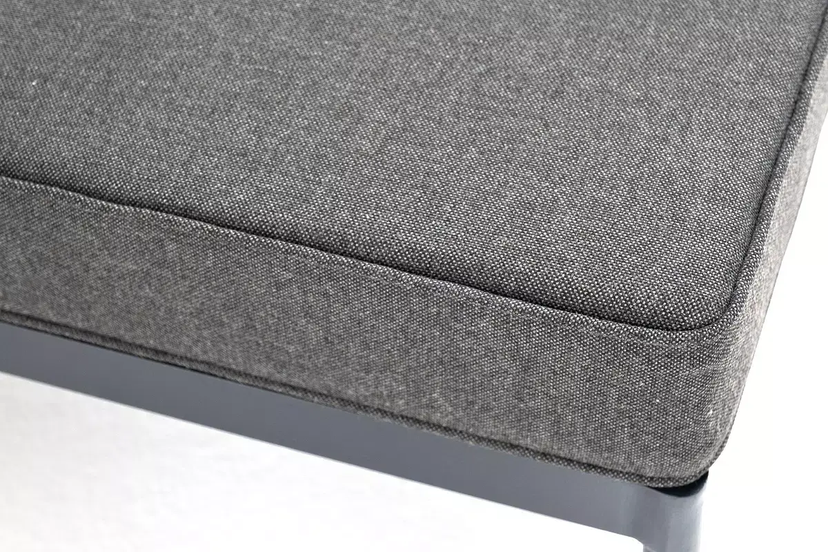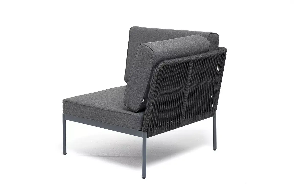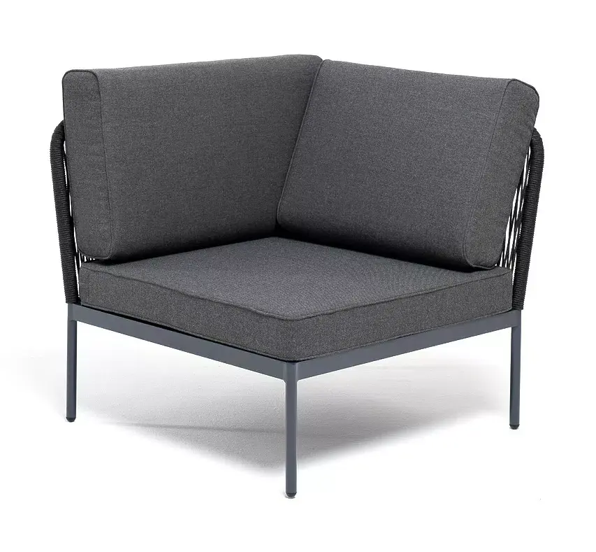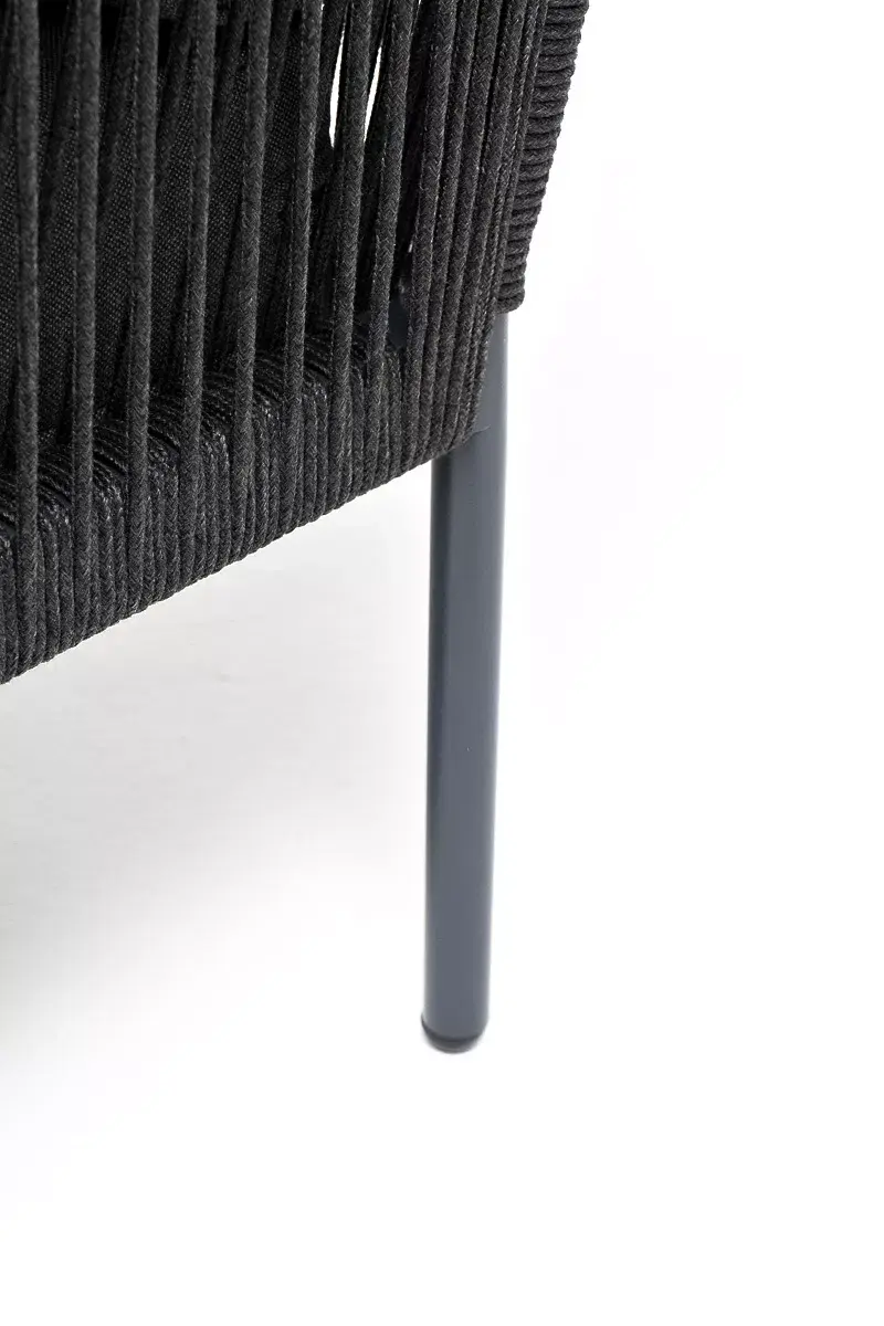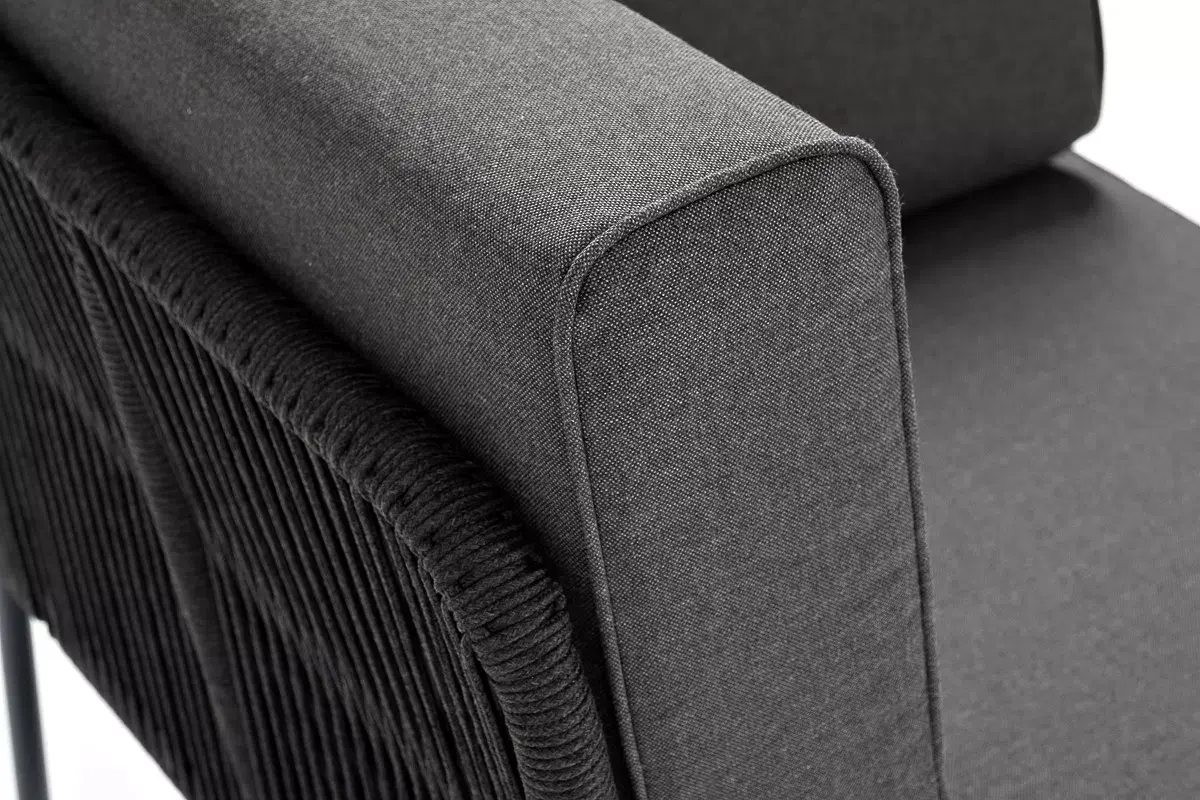 Плетеный модуль имеет алюминиевый каркас, окрашенный порошковой краской в темно-серый (RAL7024) цвет. Боковины каркаса вручную оплетены роупом - эластичными синтетическими лентами, изготовленными из высокопрочных полиэфирных волокон. Цвет оплетки - темно-серый.