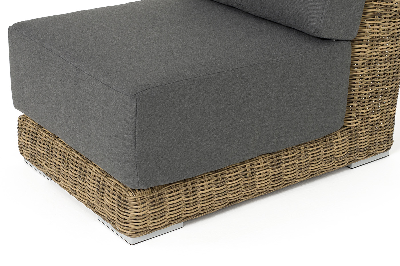 Прямой модуль «Капри», выполненный из круглого искусственного ротанга соломенного оттенка, позволяет использовать не только как самостоятельный элемент, но и быть частью лаунж-зоны, в которую данная модель превосходно интегрируется.