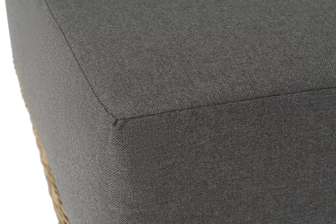 Основа выполнена из алюминиевого каркаса, декорированного вручную оплеткой соломенного цвета. Комплектацией предусмотрены подушки, выпаленные из полиэстера с влагоотталкивающей пропиткой.