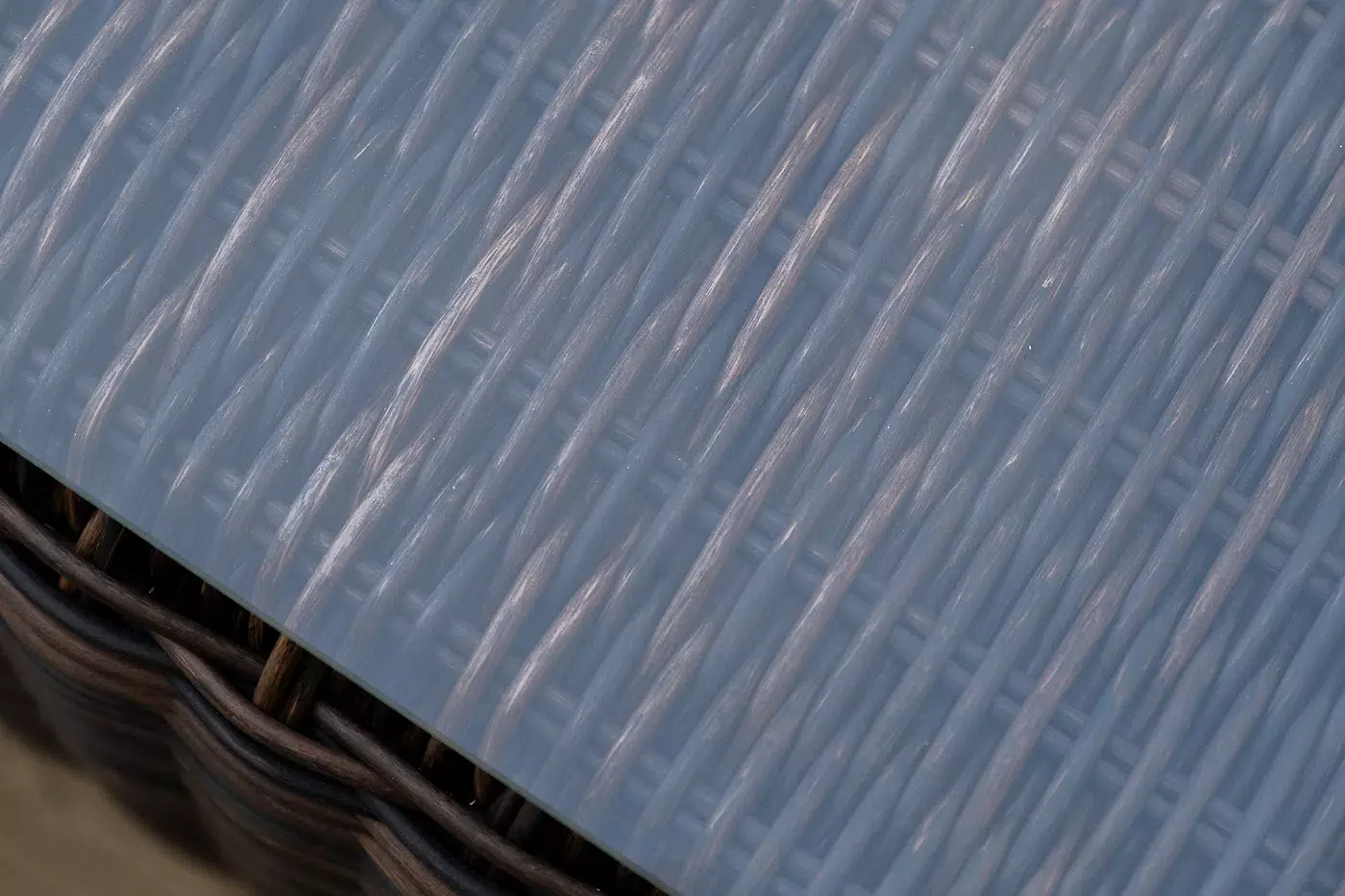 Плетеный столик имеет стеклянную столешницу, изготовленную из прочного закаленного стекла, толщина - 5 мм.