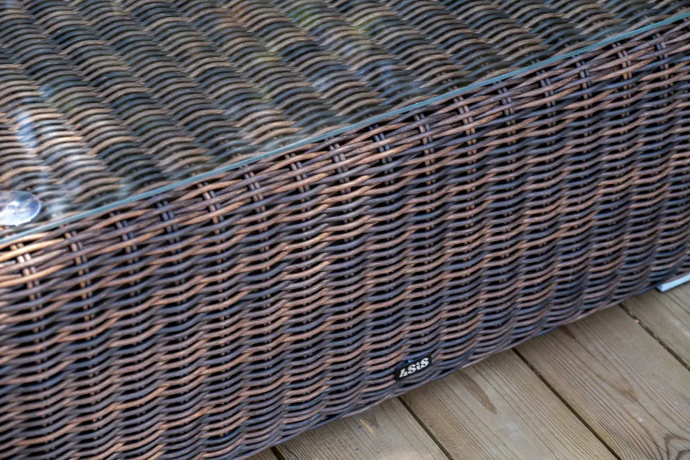 При изготовлении каркаса всех составляющих комплекта используется высокопрочный алюминий. Он дополнен круглым плетением из искусственного ротанга. Цвет – коричневый.