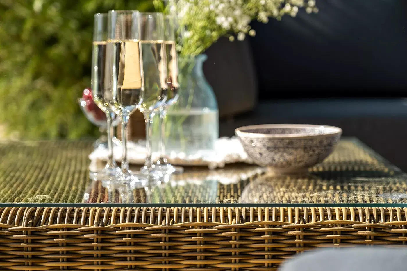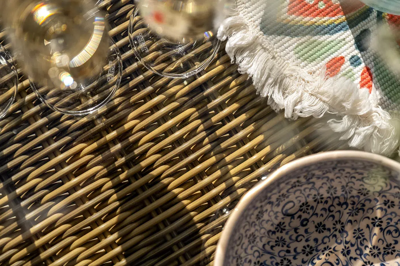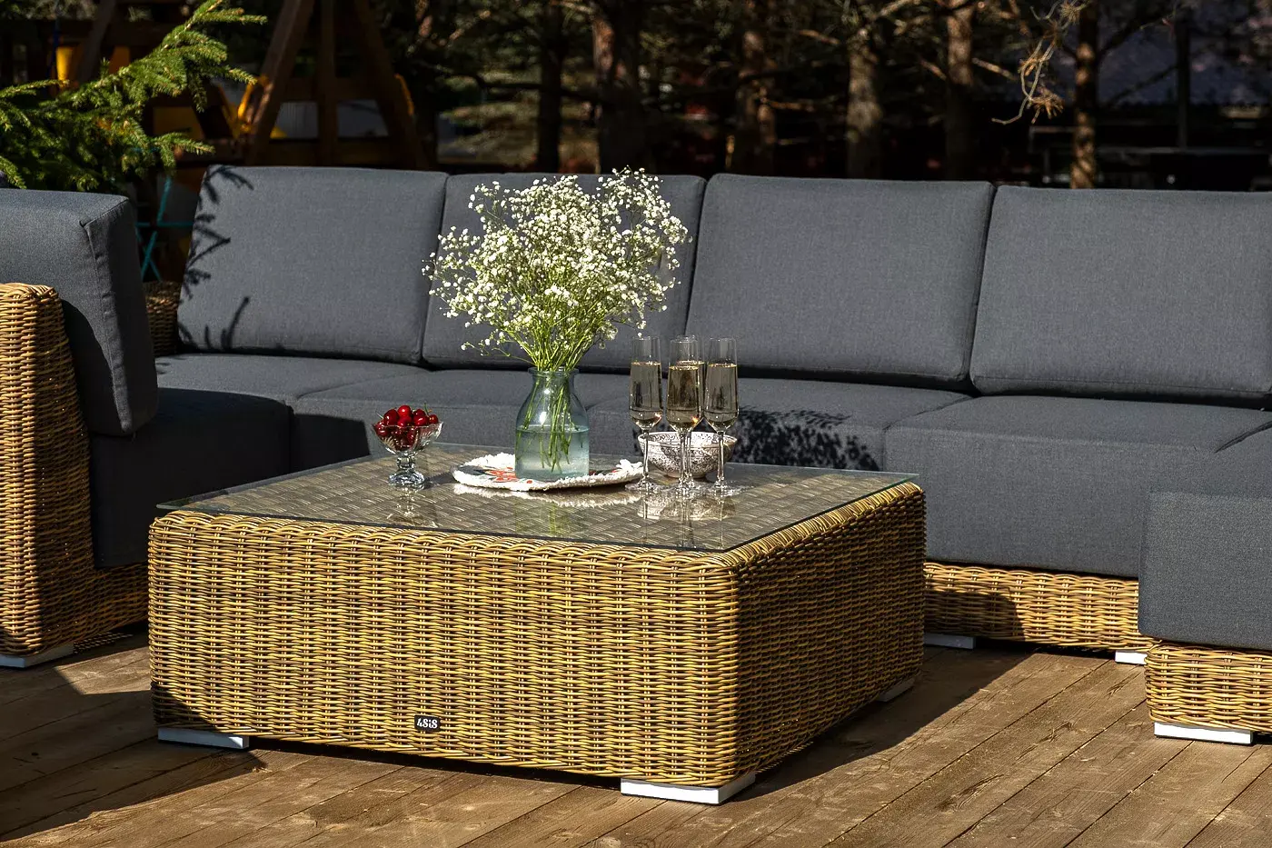 Плетеный столик имеет стеклянную столешницу, изготовленную из прочного закаленного стекла, толщина - 5 мм.