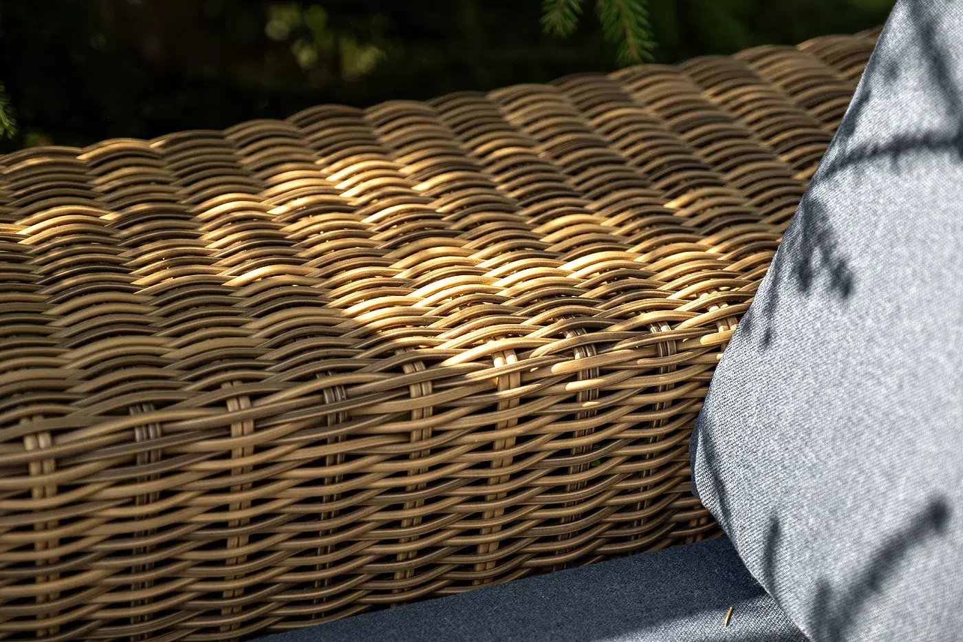 При изготовлении каркаса всех составляющих комплекта используется высокопрочный алюминий. Он дополнен круглым плетением из искусственного ротанга. Цвет – соломенный.