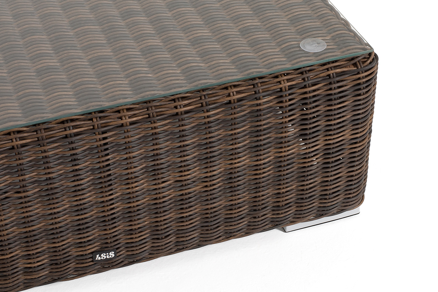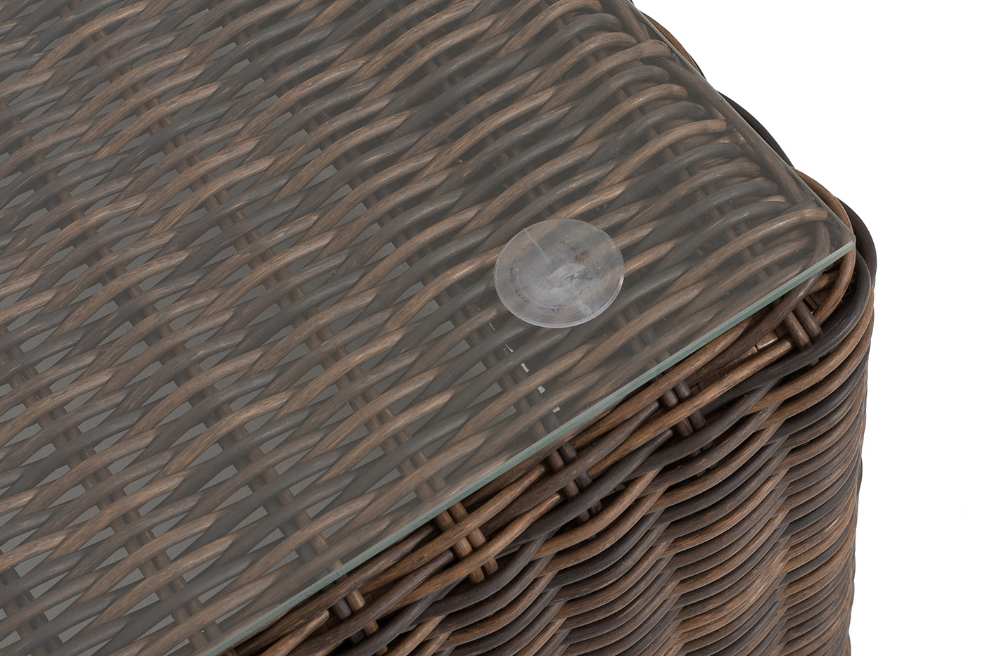 Размер модели – 950×950×370 мм. Ее каркас сделан из высокопрочного алюминия, который оплетен искусственным ротангом с помощью ручного круглого плетения. Столик представлен в коричневом цвете.