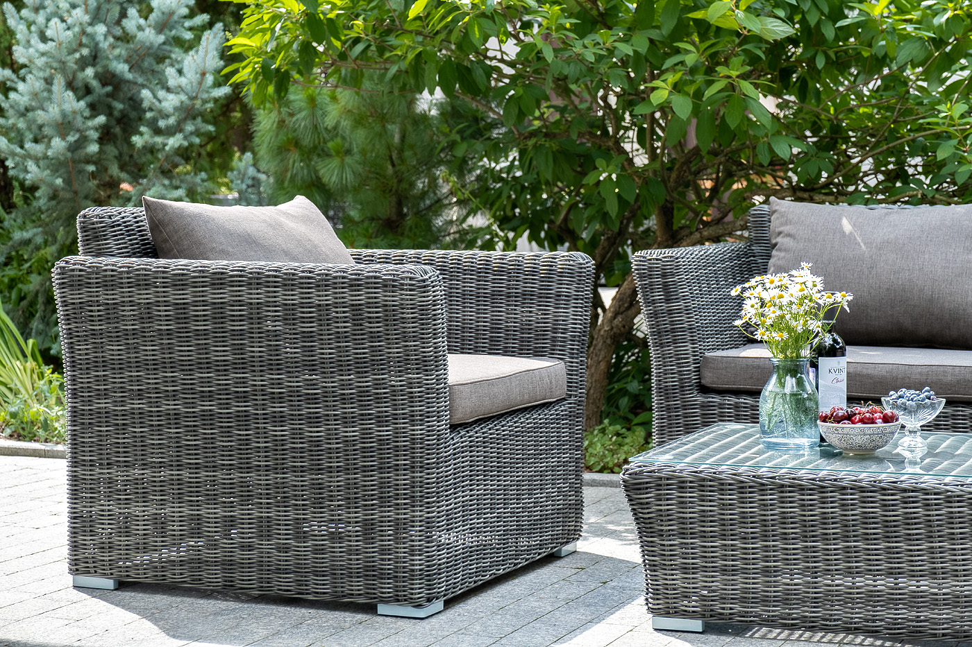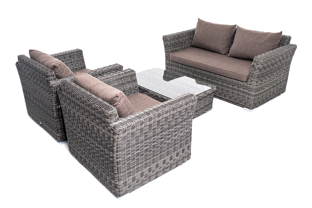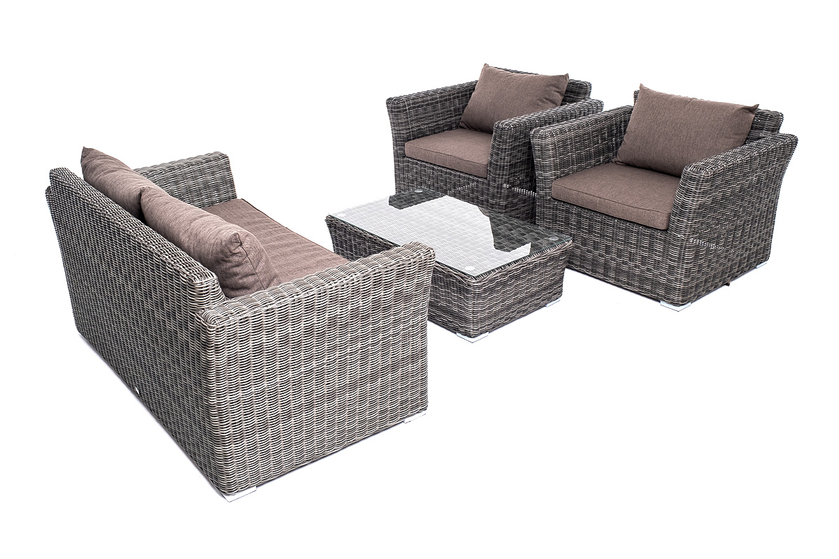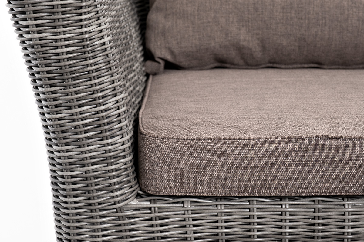 Прочный алюминиевый каркас усиливает устойчивость мебели. Его дополняет плетение в цвете "графит", которое представлено из круглого искусственного ротанга.