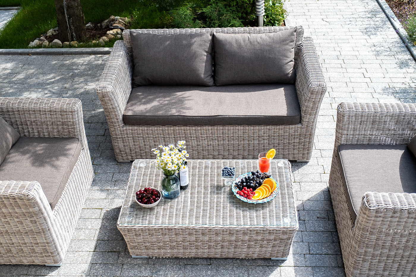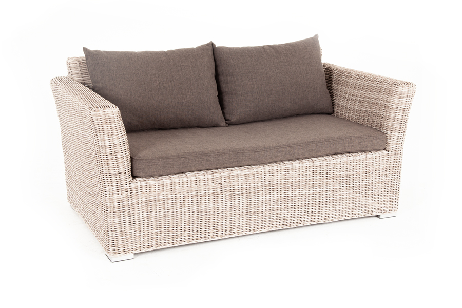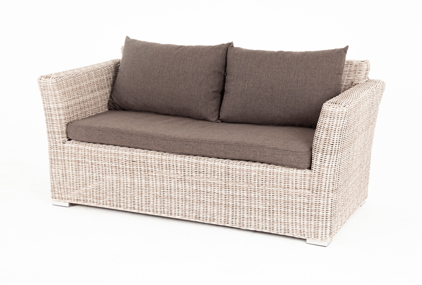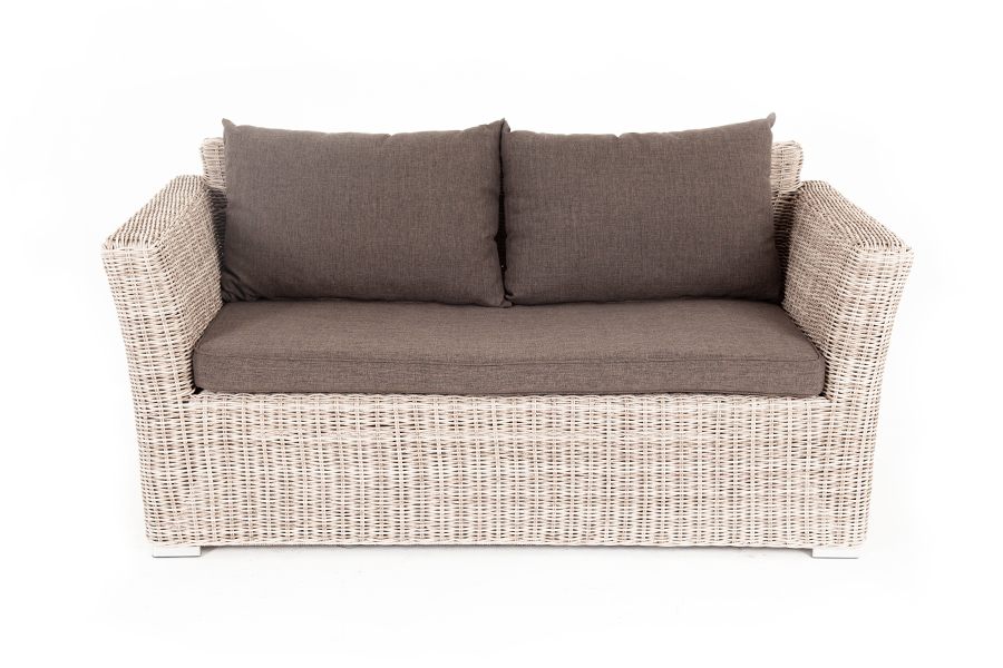 Диван выполнен из искусственного ротанга натурального бежевого цвета с помощью ручного круглого плетения.