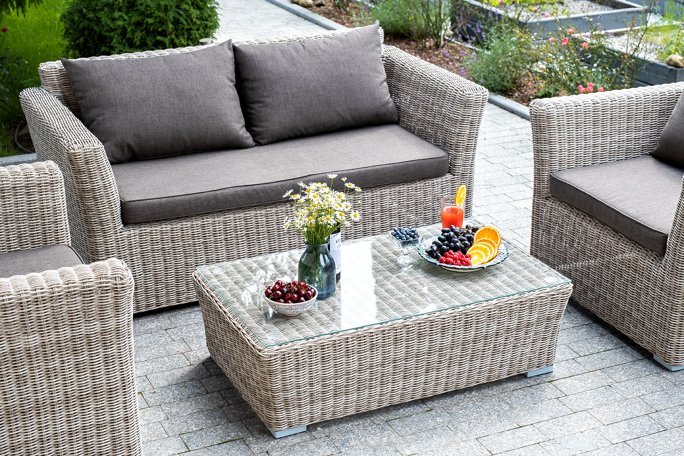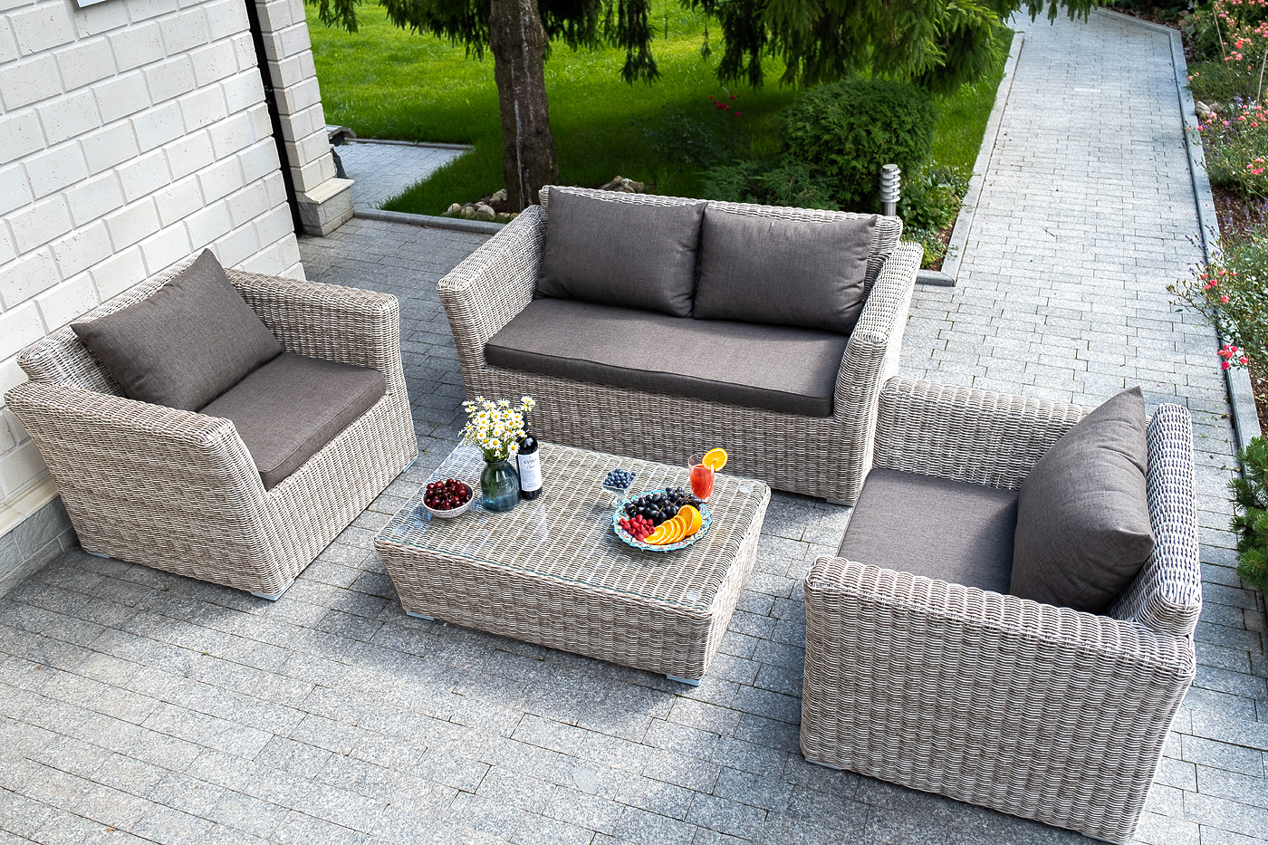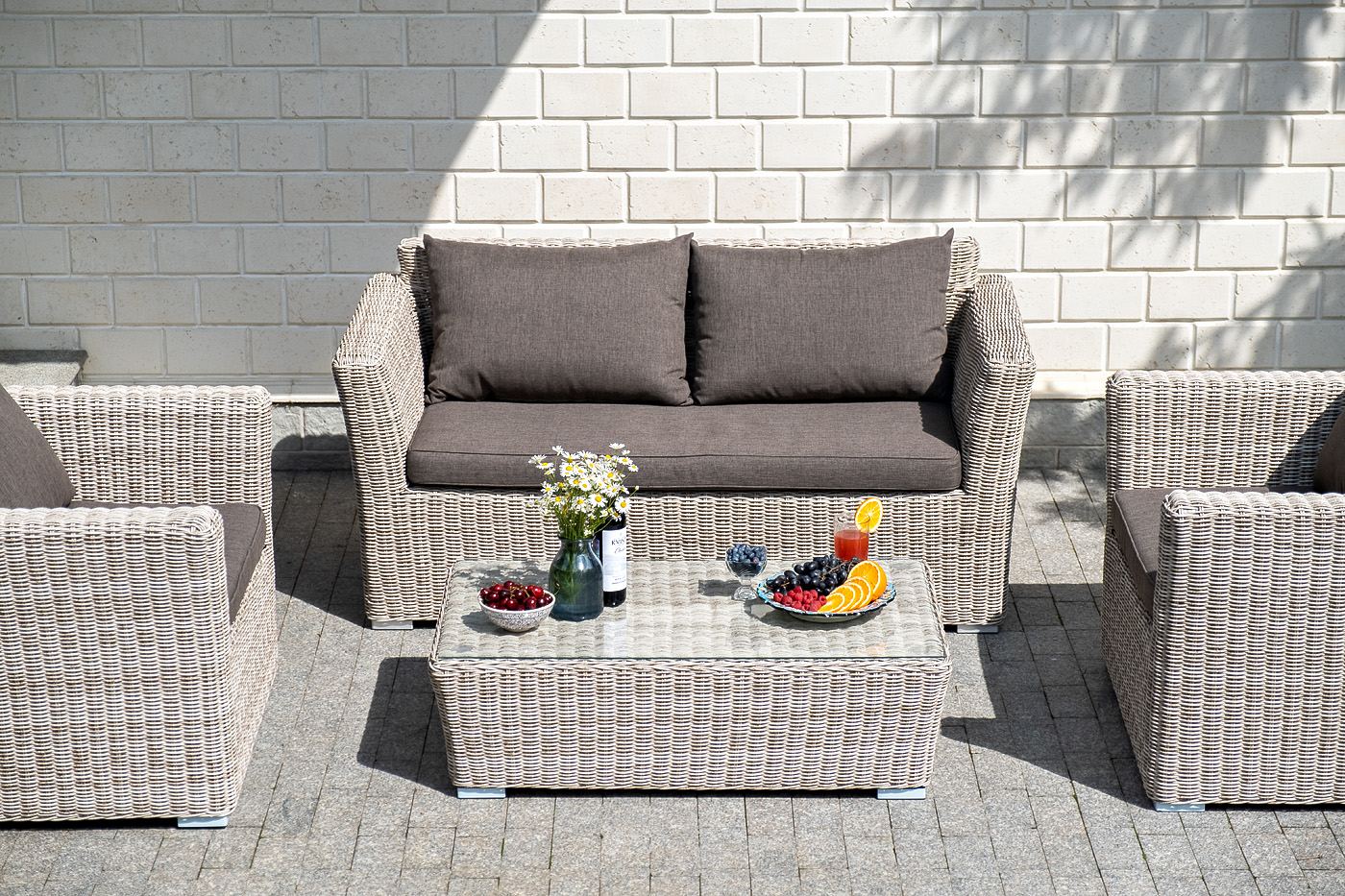 Диван выполнен из искусственного ротанга натурального бежевого цвета с помощью ручного круглого плетения.