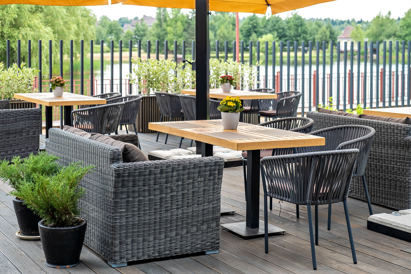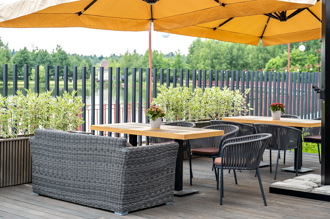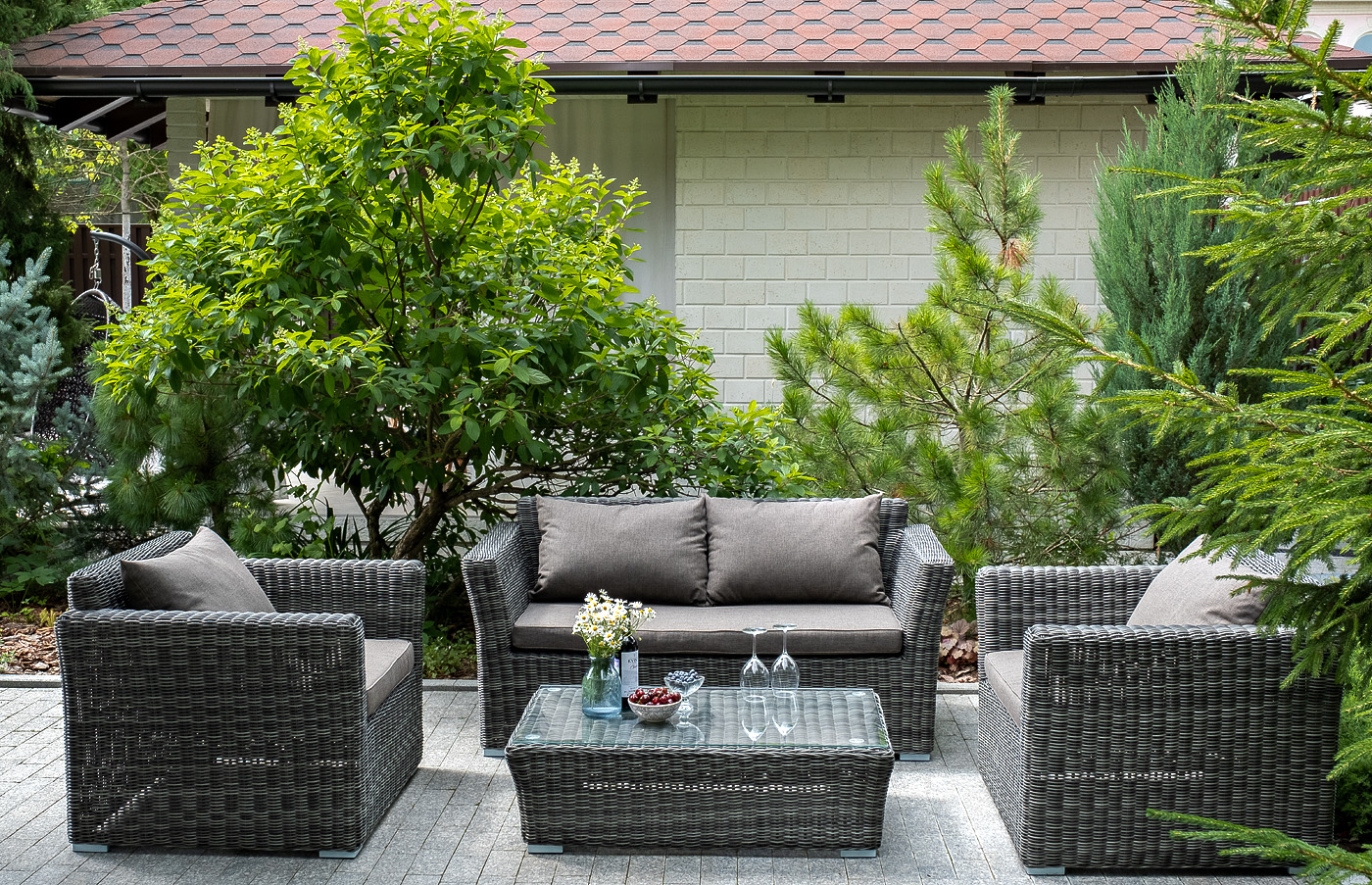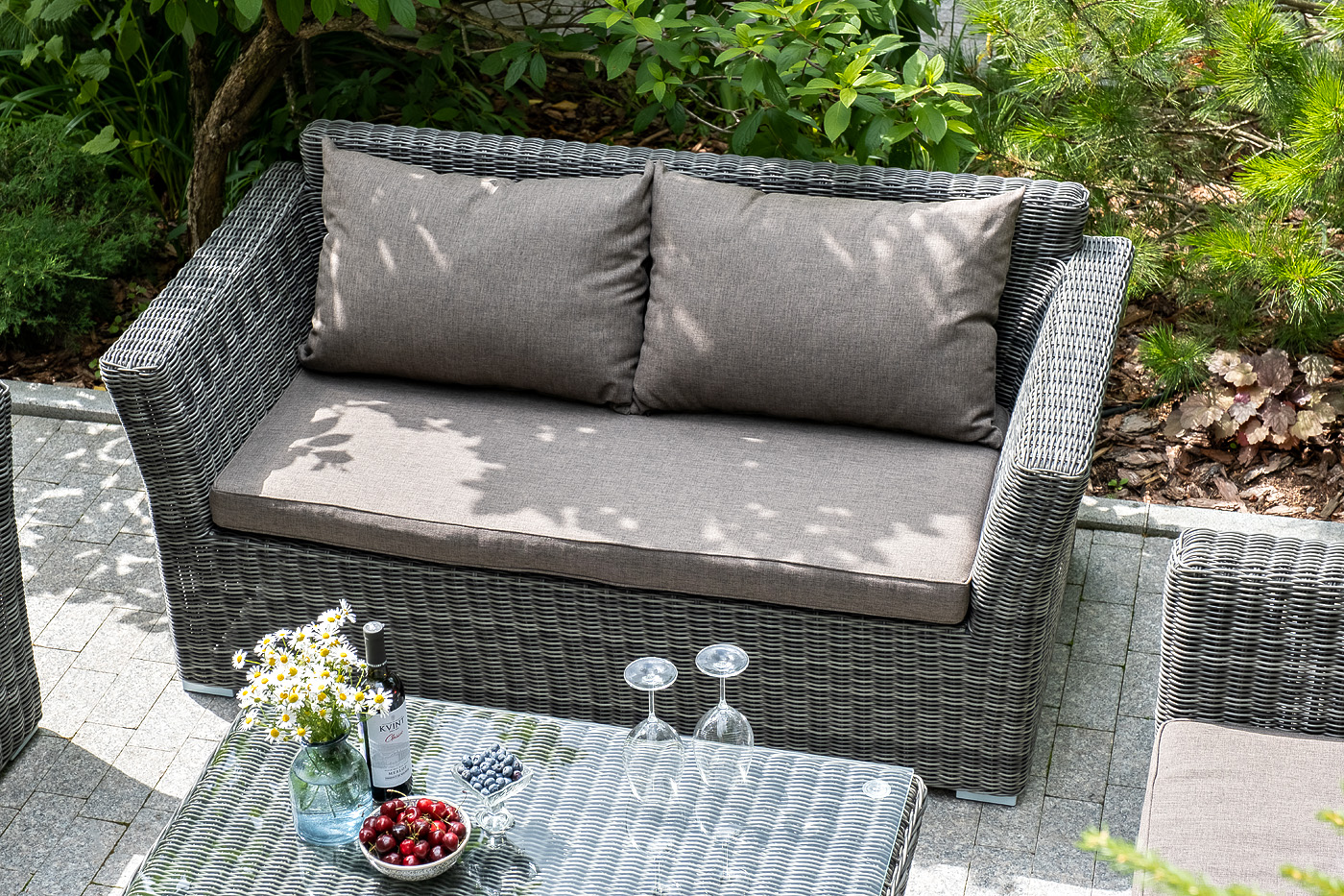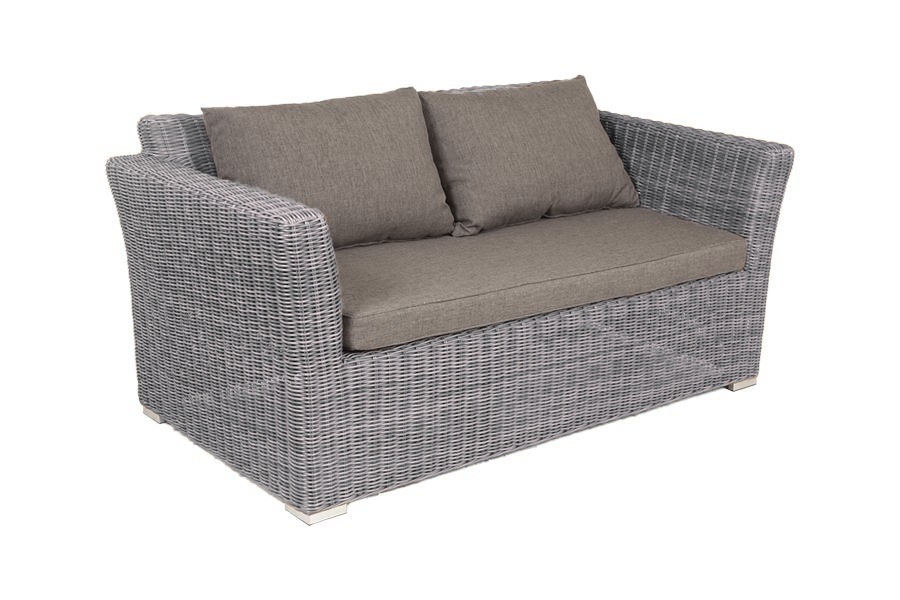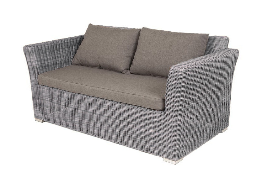 Двухместный диван дополнен несколькими подушками со съёмными чехлами серого цвета. Они изготовлены из прочного полиэстера, плотность которого достигает 300гр/м2. Предусмотрена влагоотталкивающая пропитка ткани для защиты текстильных изделий от намокания.