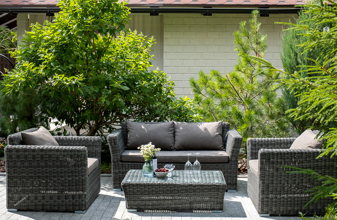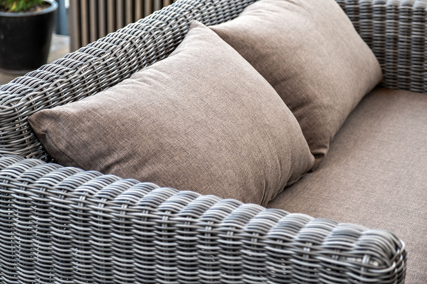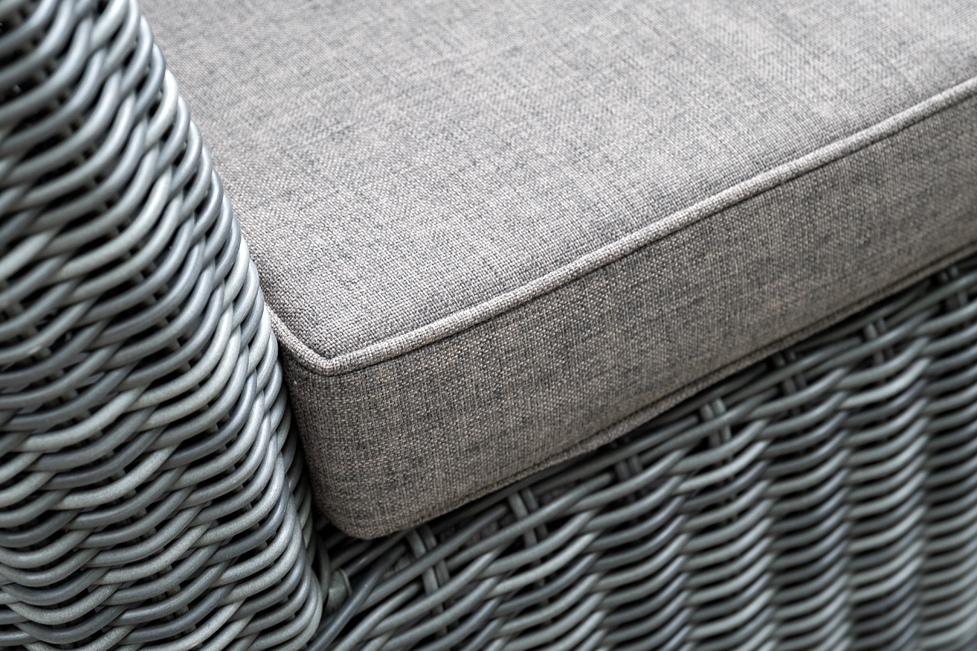 Диван выполнен из круглого искусственного ротанга графитового цвета, оплетенного вручную.