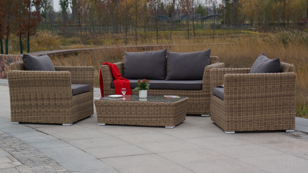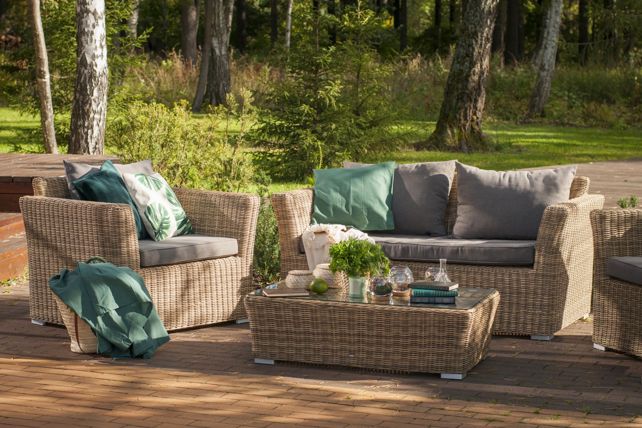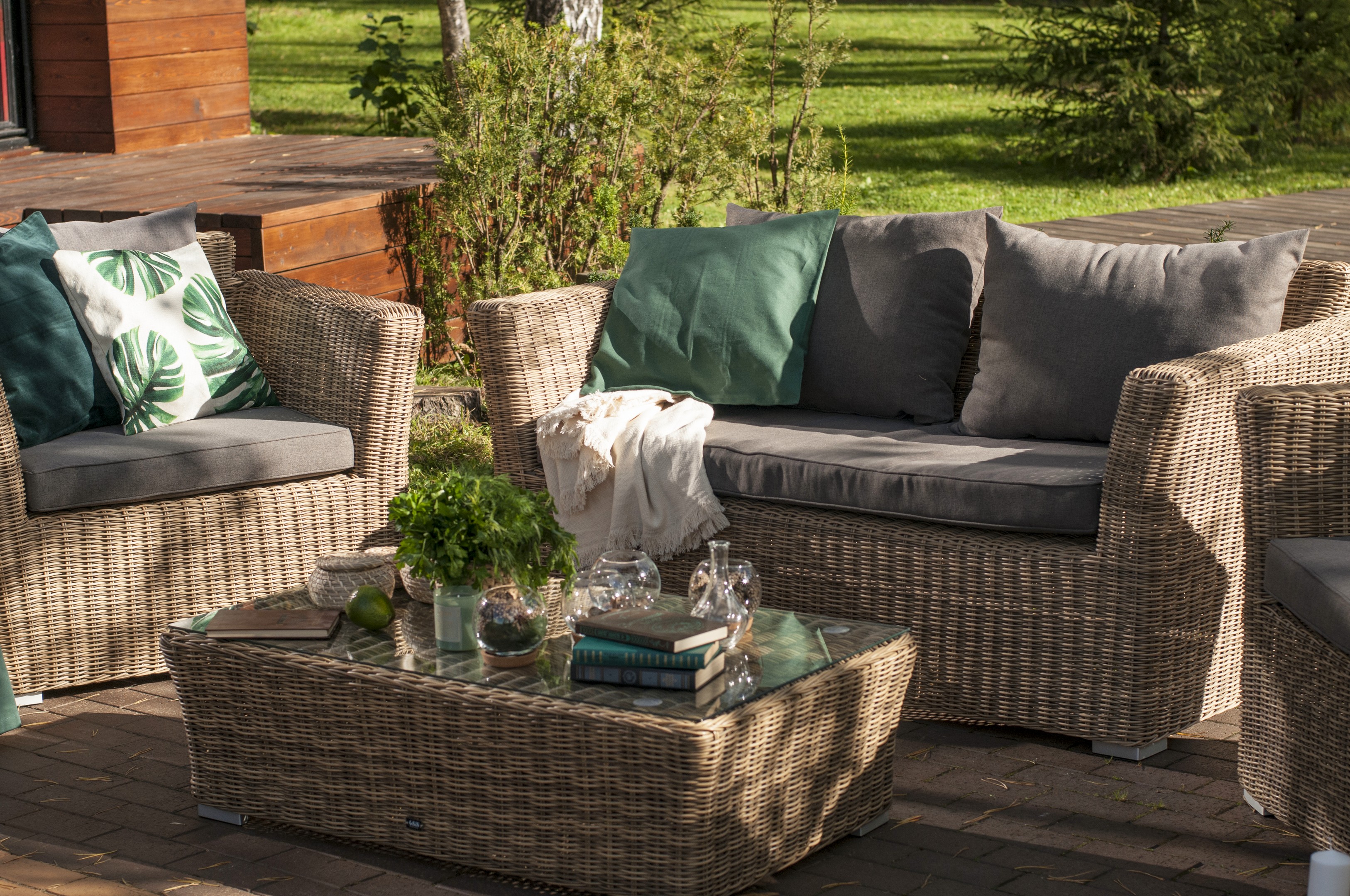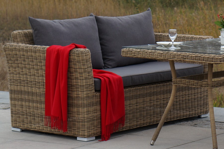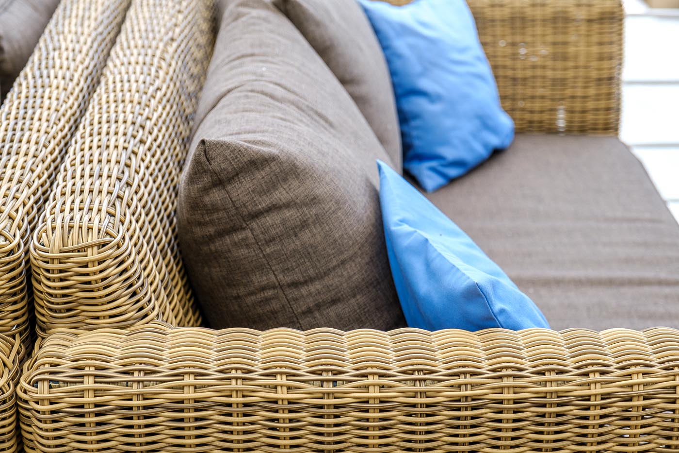 Двухместный диван дополнен несколькими подушками со съёмными чехлами серого цвета. Они изготовлены из прочного полиэстера, плотность которого достигает 300гр/м2. Предусмотрена влагоотталкивающая пропитка ткани для защиты текстильных изделий от намокания.