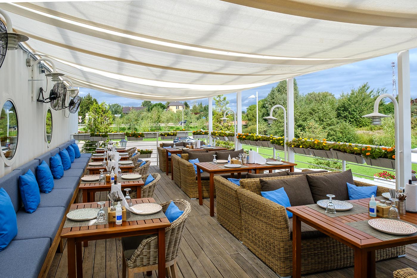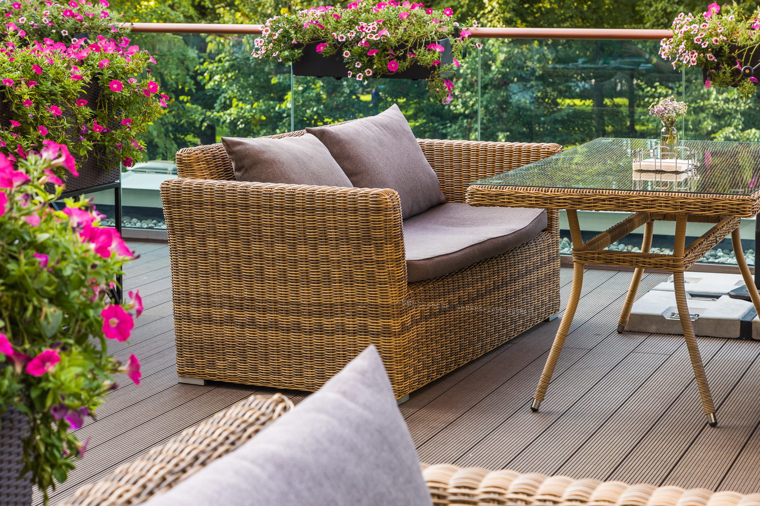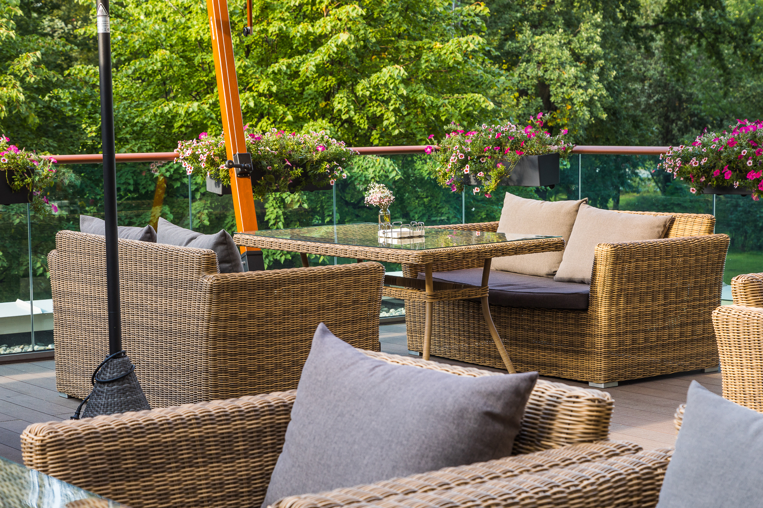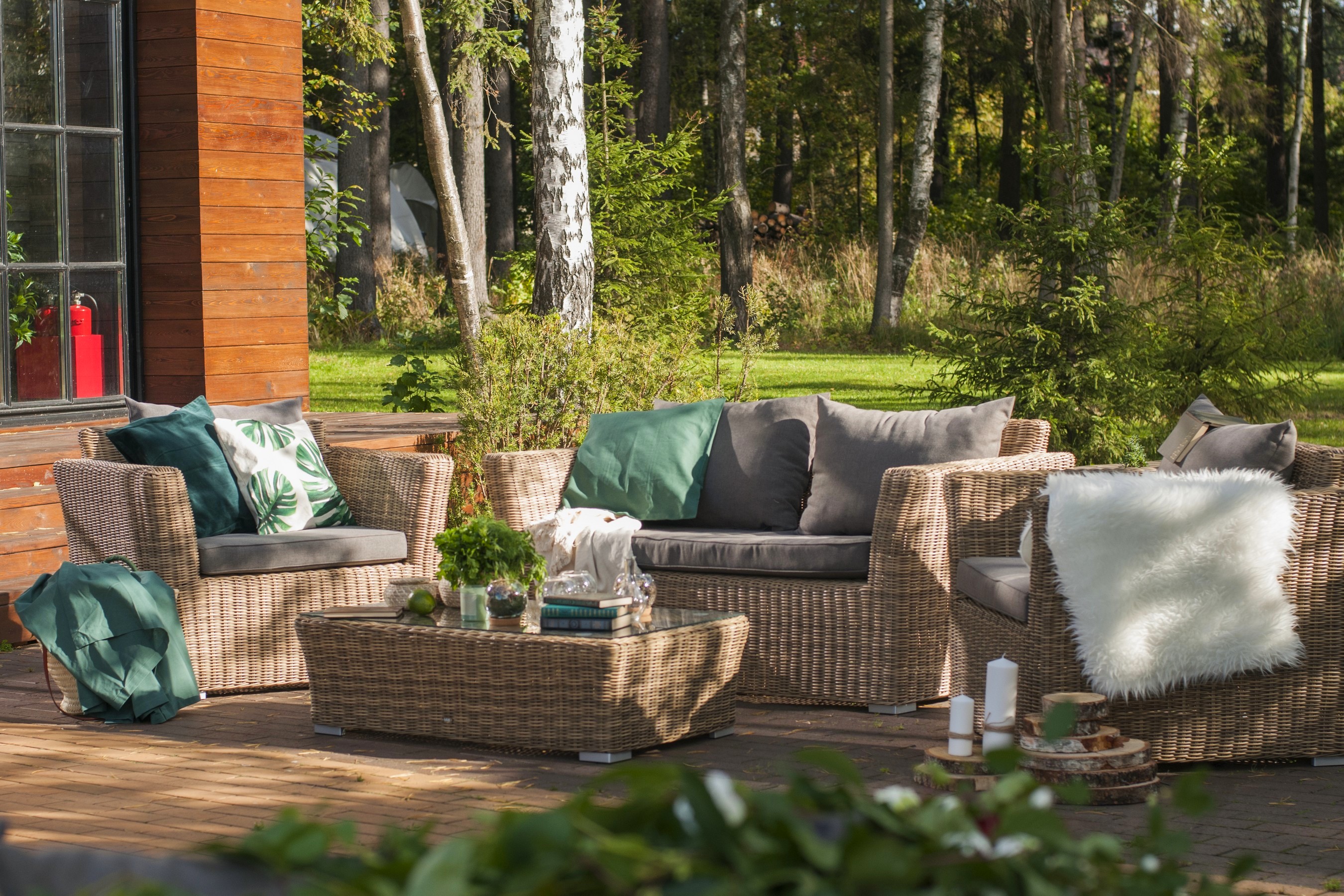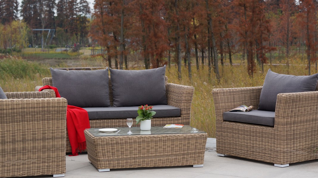 Двухместный диван дополнен несколькими подушками со съёмными чехлами серого цвета. Они изготовлены из прочного полиэстера, плотность которого достигает 300гр/м2. Предусмотрена влагоотталкивающая пропитка ткани для защиты текстильных изделий от намокания.