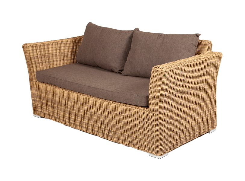 Диван выполнен из круглого искусственного ротанга соломенного цвета, оплетенного вручную.