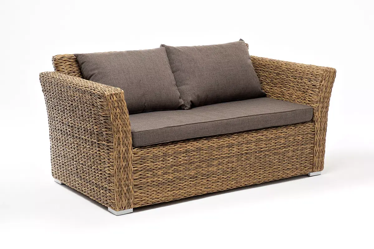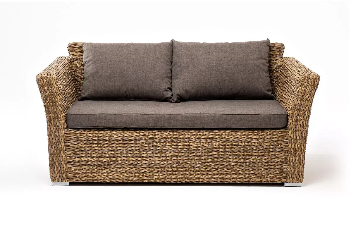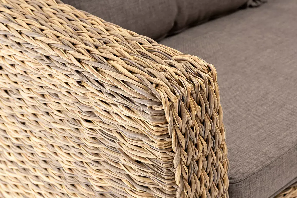 Диван выполнен из искусственного ротанга вида «гиацинт» соломенного цвета, оплетенного вручную.