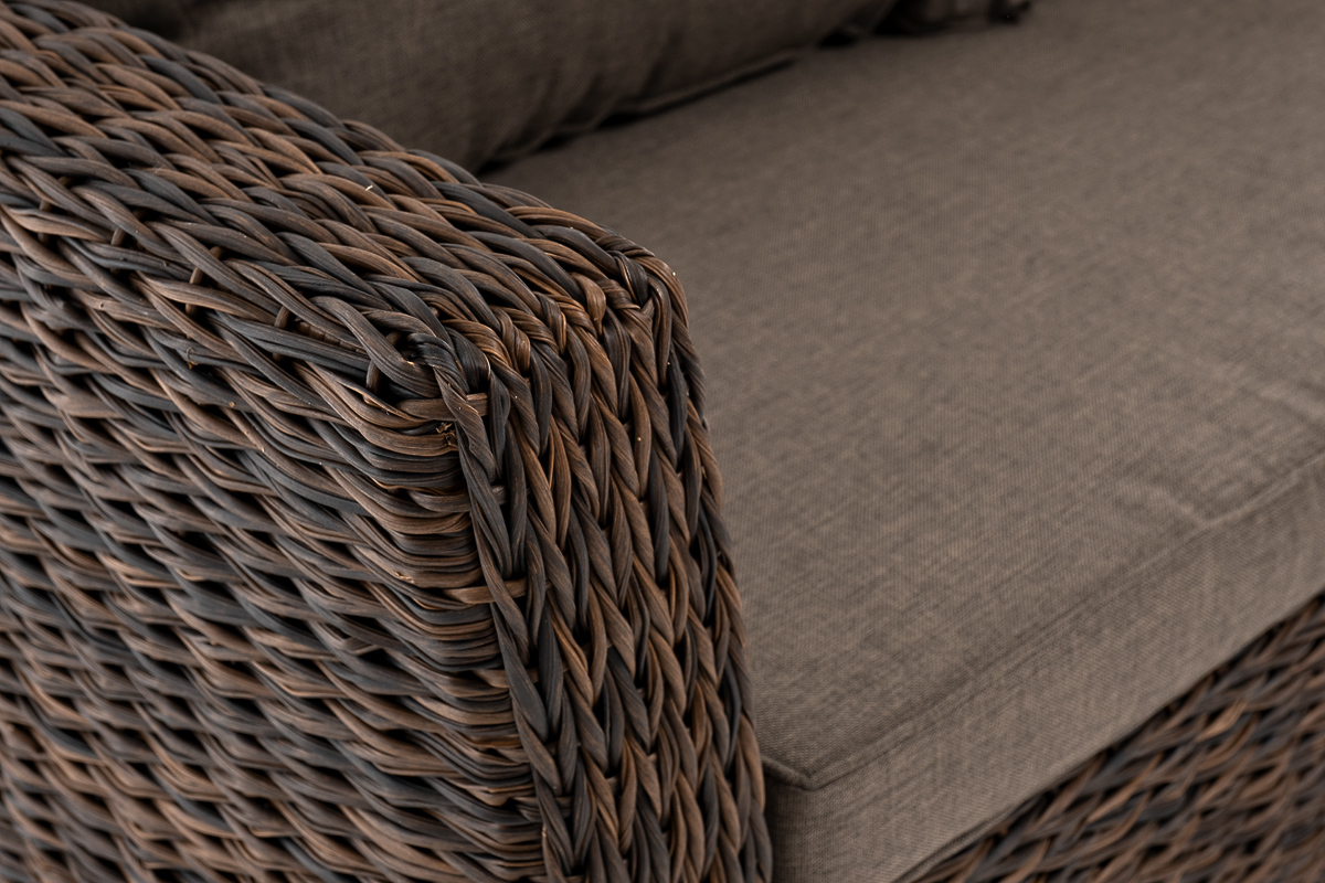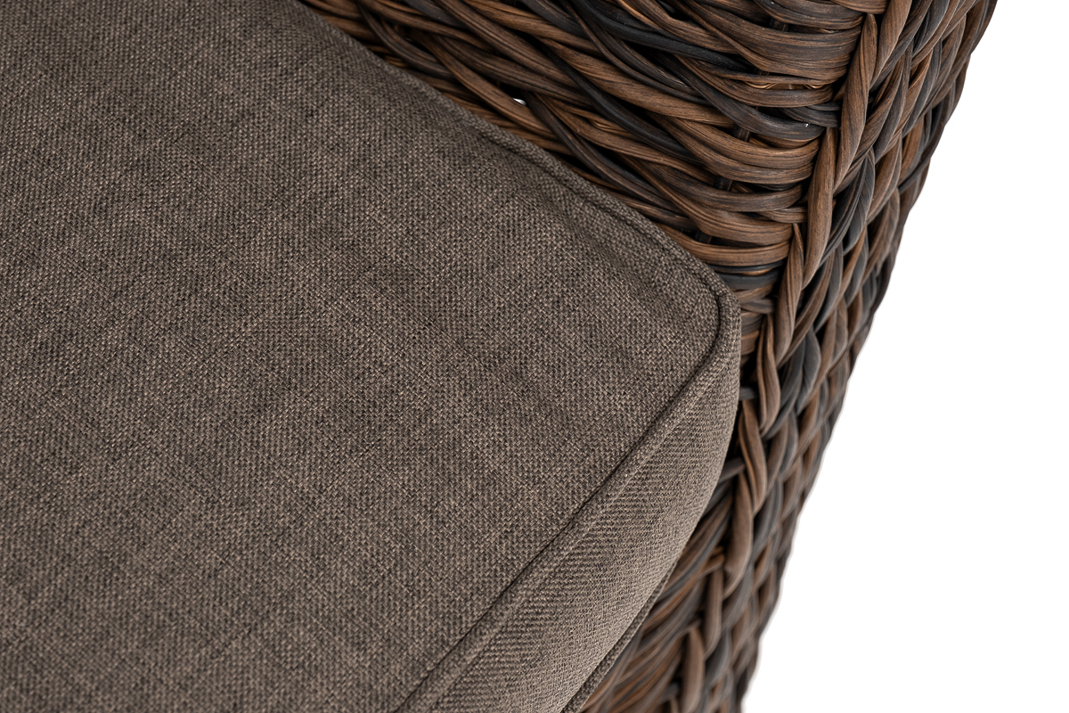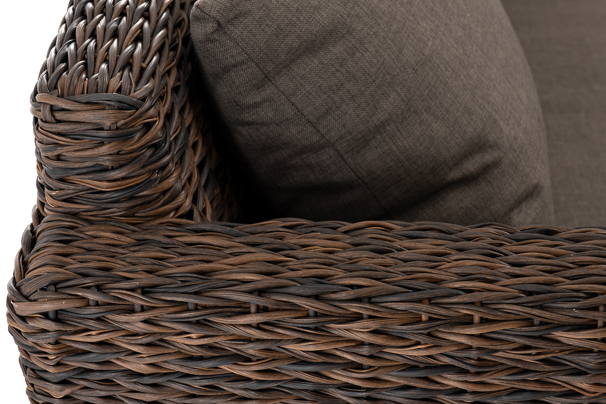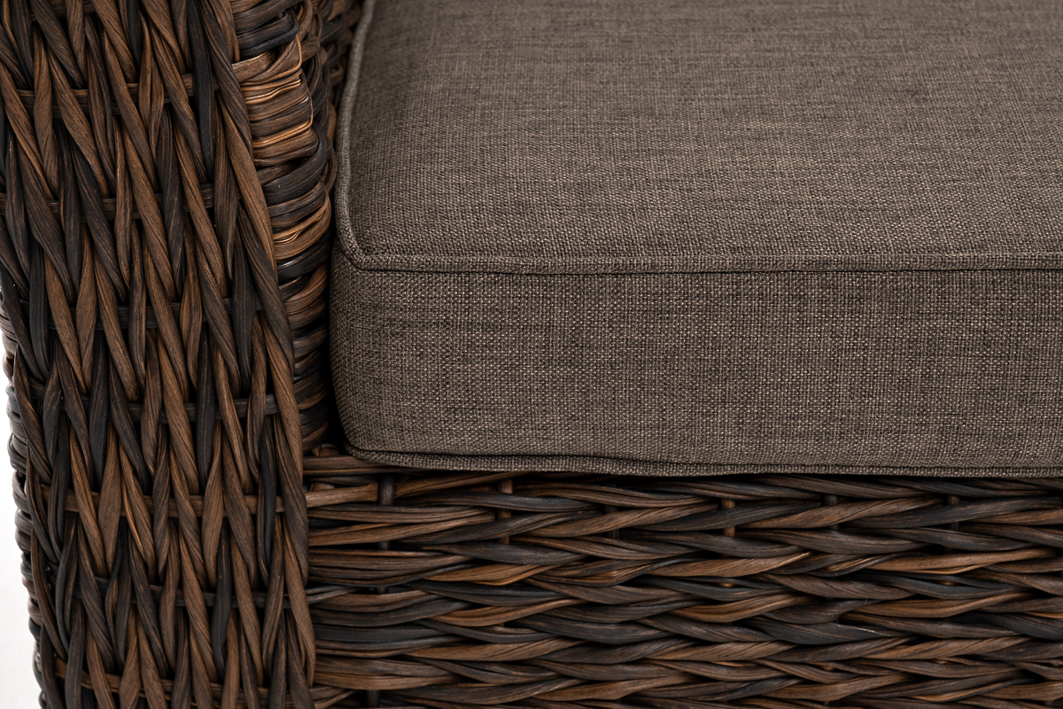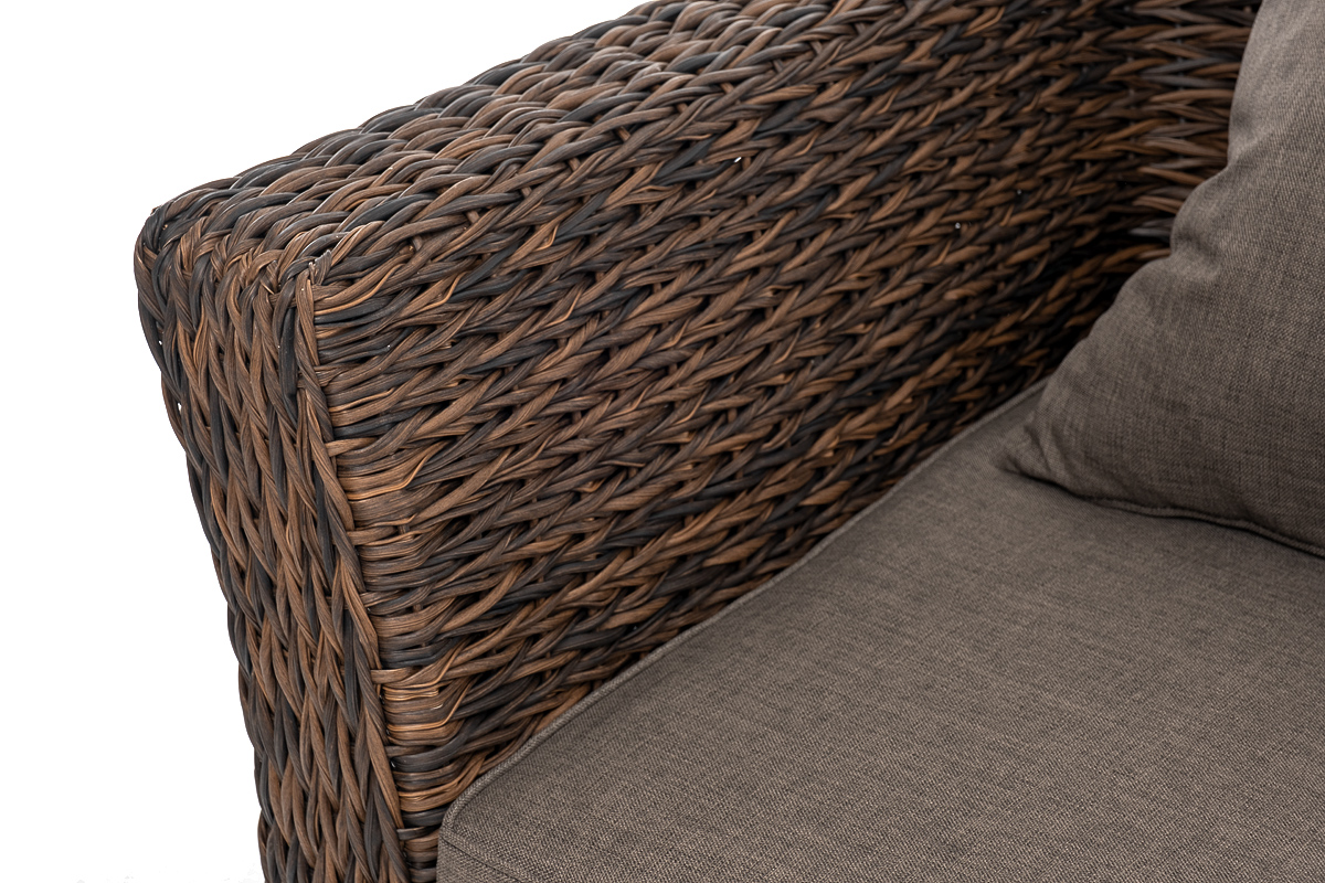 Мебель декорирована ручным плетением, выполненным из искусственного ротанга вида «гиацинт» коричневого цвета.
