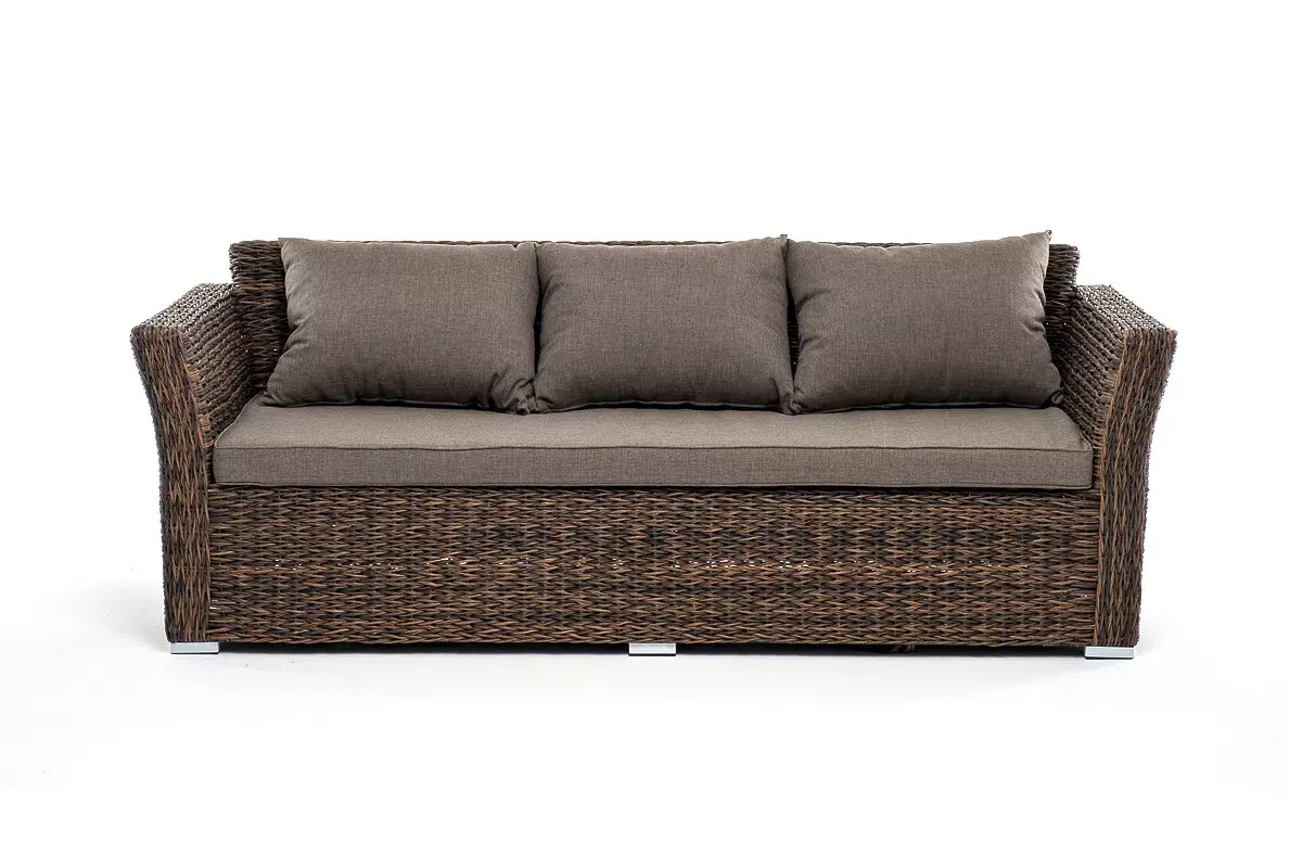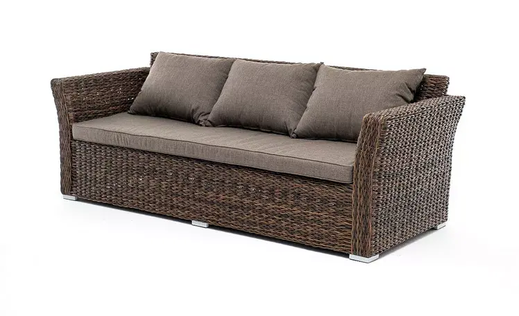 Трехместный диван укомплектован мягкими подушками, которые защищены съёмными чехлами в сером оттенке. При их пошиве используется износостойкий полиэстер, плотность которого достигает 300гр/м2. Предусмотрена влагоотталкивающая пропитка.