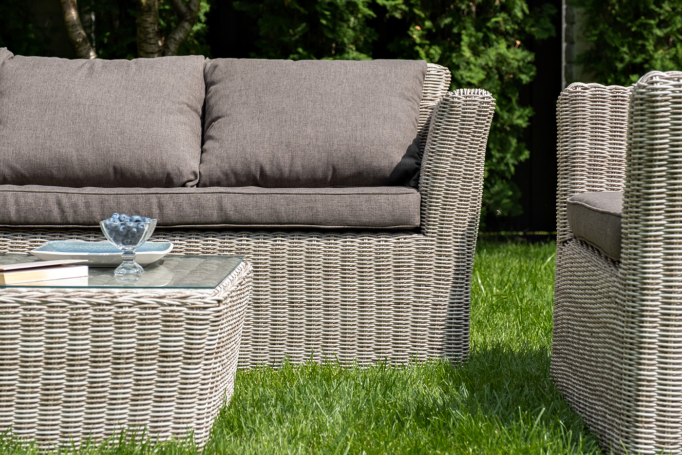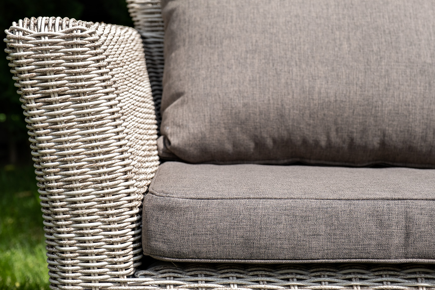 Диван из искусственного ротанга «Капучино» в своей основе имеет каркас из алюминия, который оплетен вручную круглым плетением бежевого цвета.
