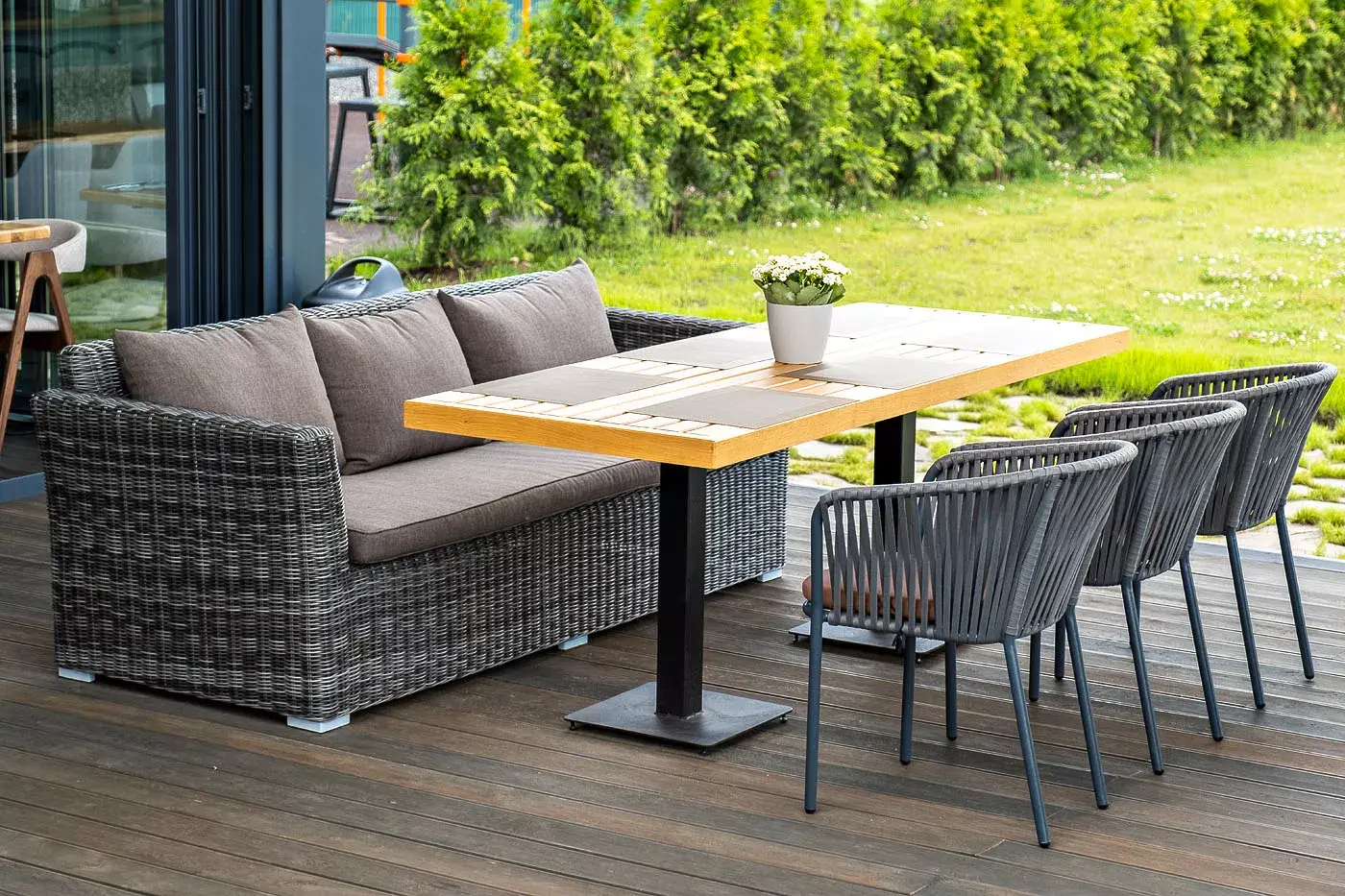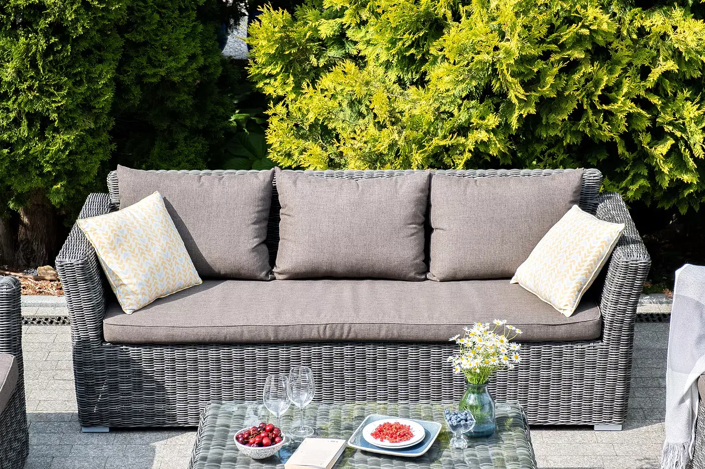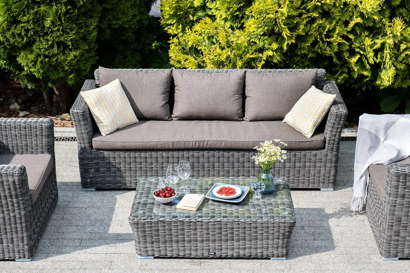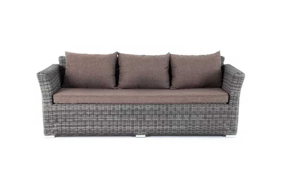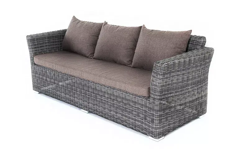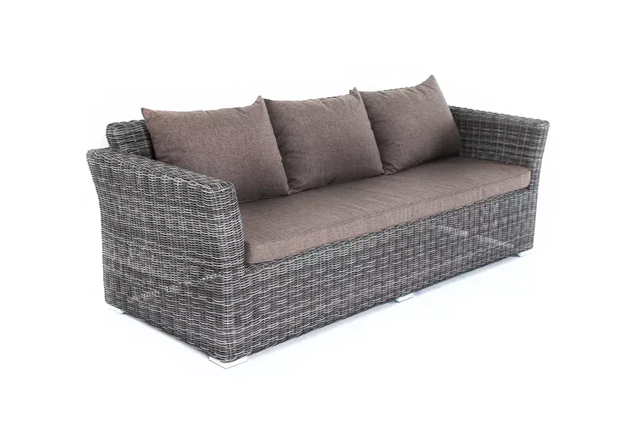 Диван из искусственного ротанга «Капучино» в своей основе имеет каркас из алюминия, который оплетен вручную круглым плетением графитового цвета.