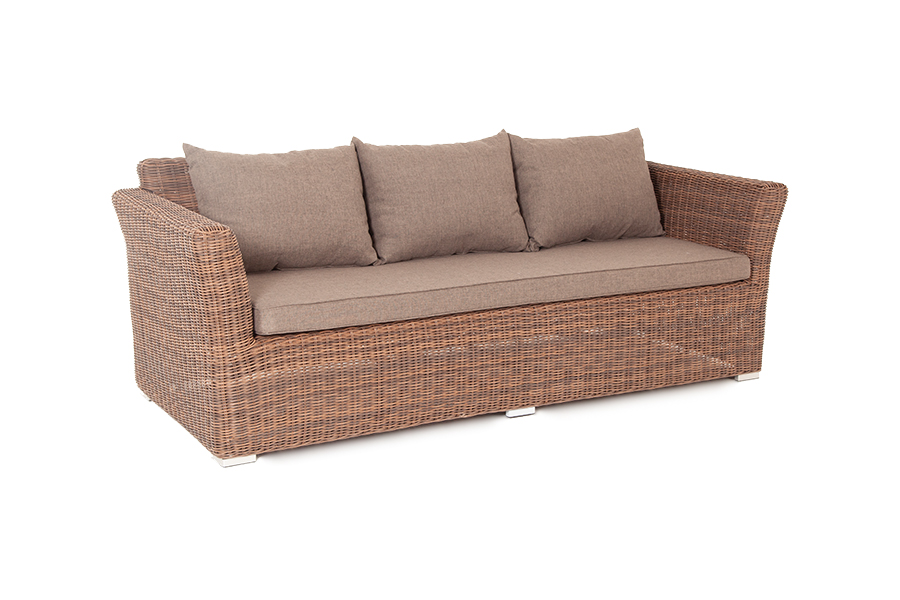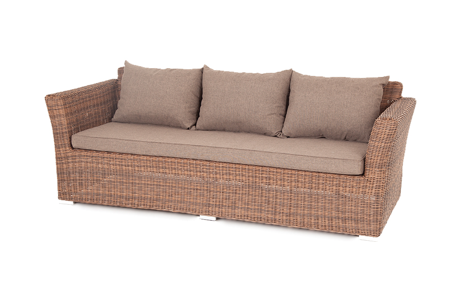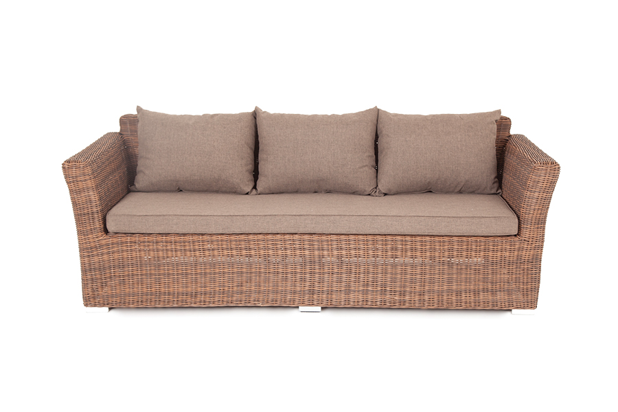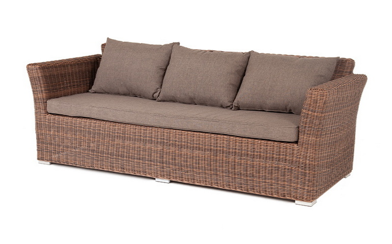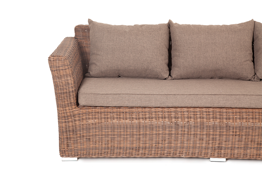 Диван «Капучино» предназначен для трех персон. Его основой является алюминиевый каркас. Размер модели – 2220×865×815 мм. Мебель дополняет круглое ручное плетение из искусственного ротанга. Оно представлено в коричневом цвете.
