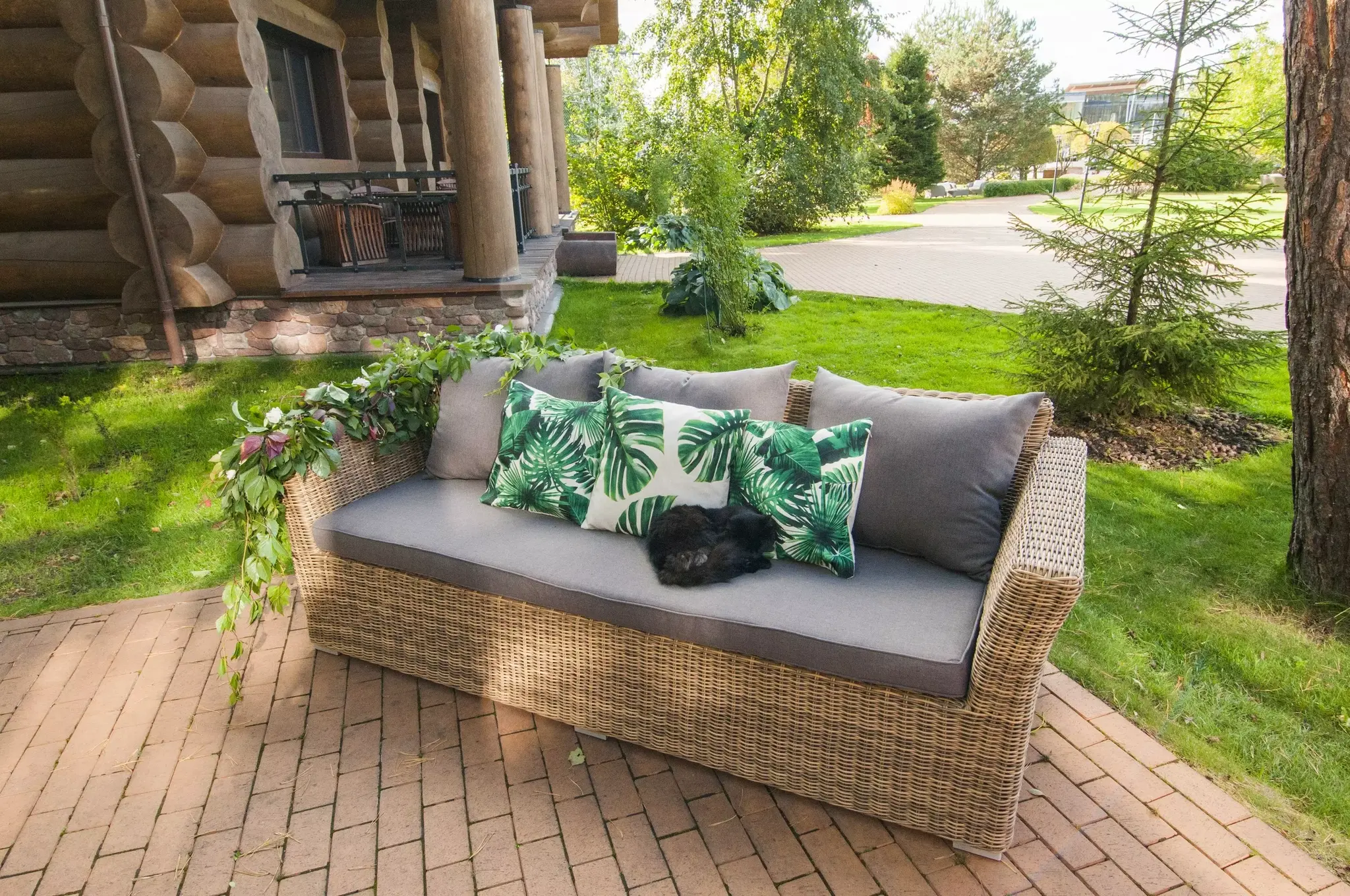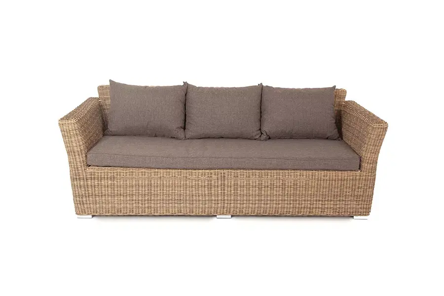 Трехместный диван укомплектован мягкими подушками, которые защищены съёмными чехлами в сером оттенке. При их пошиве используется износостойкий полиэстер, плотность которого достигает 300гр/м2. Предусмотрена влагоотталкивающая пропитка.