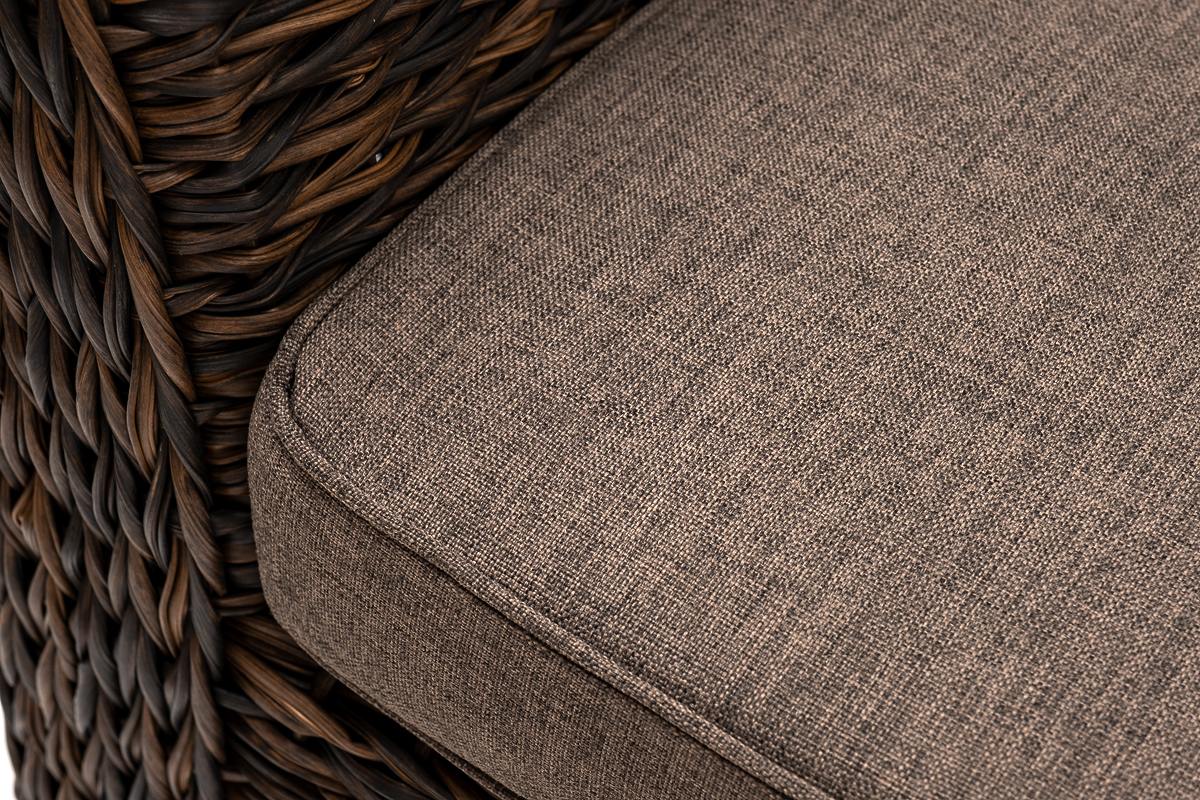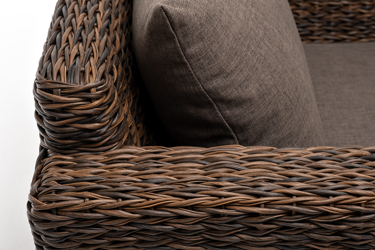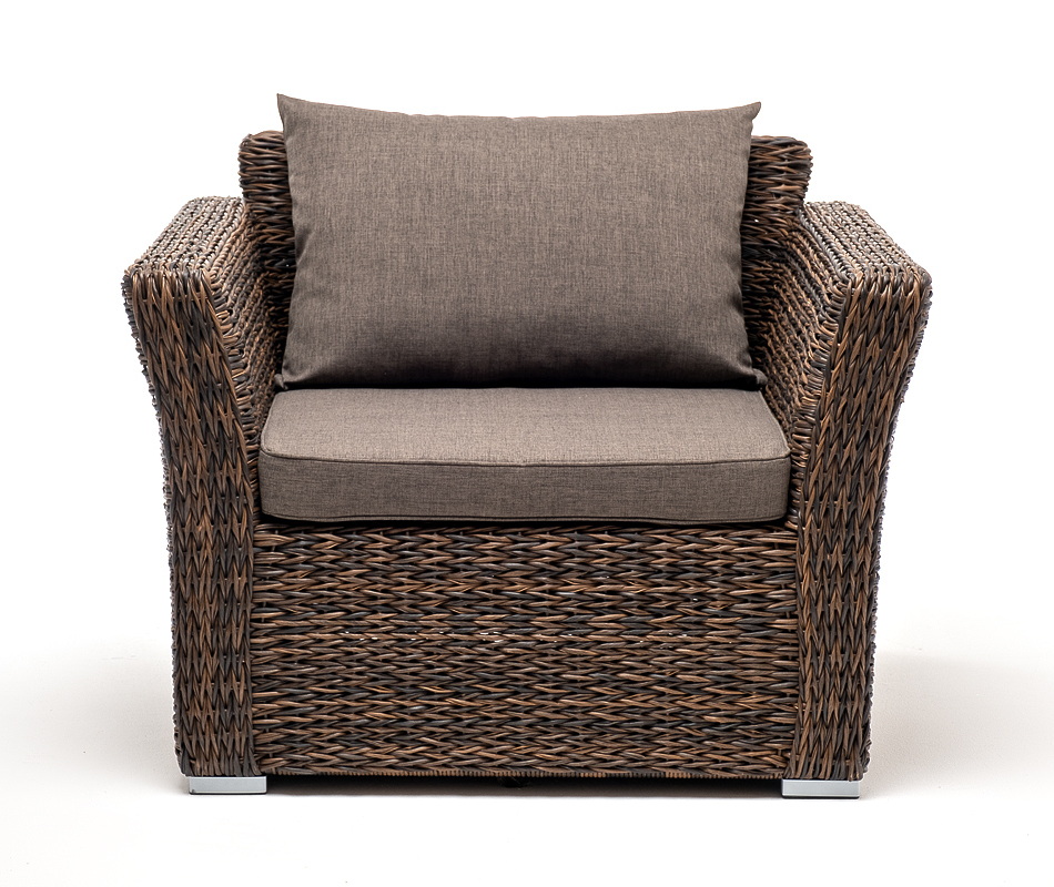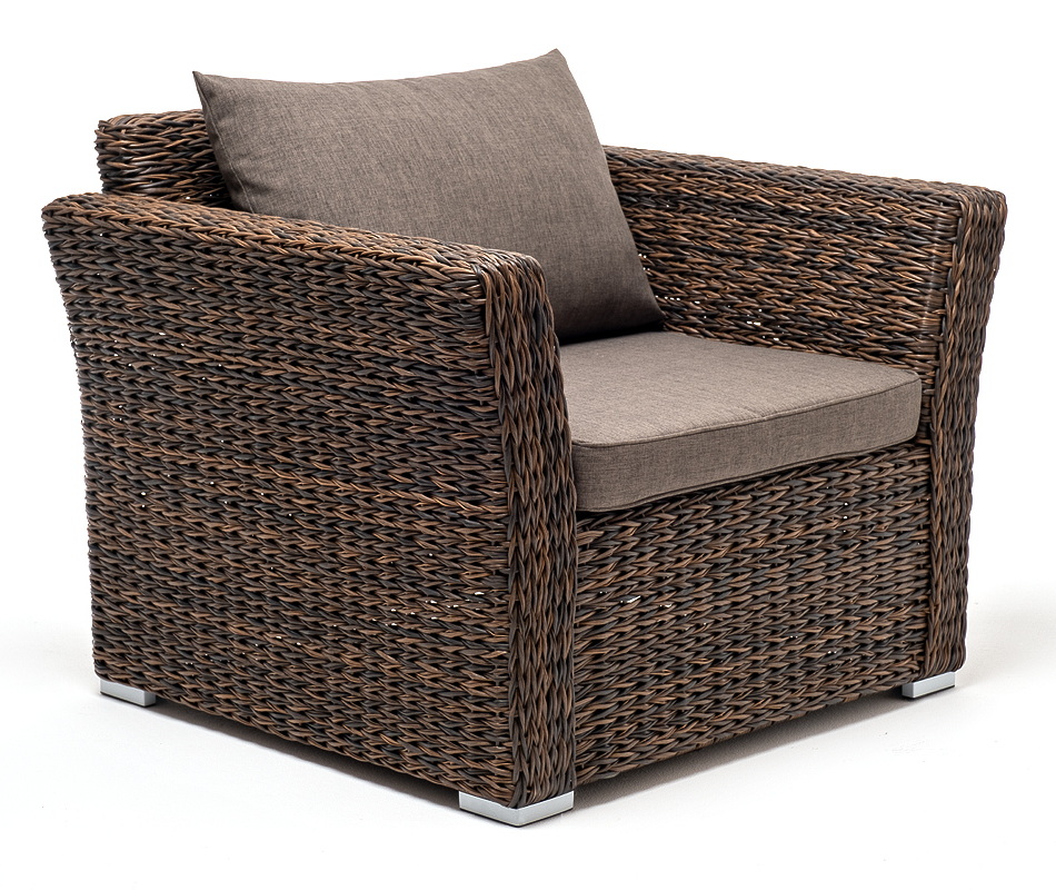 Кресло из искусственного ротанга «Капучино» коричневого цвета, прекрасно подходит для обустройства веранды, а относительно небольшой вес, который составляет 21,5 кг, увеличивает мобильность данной модели. Плетение используется вида «гиацинт».