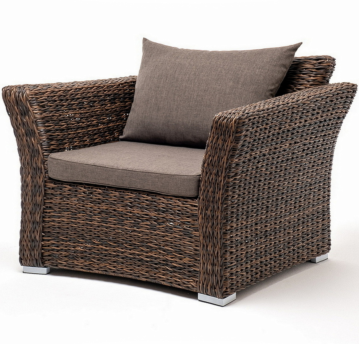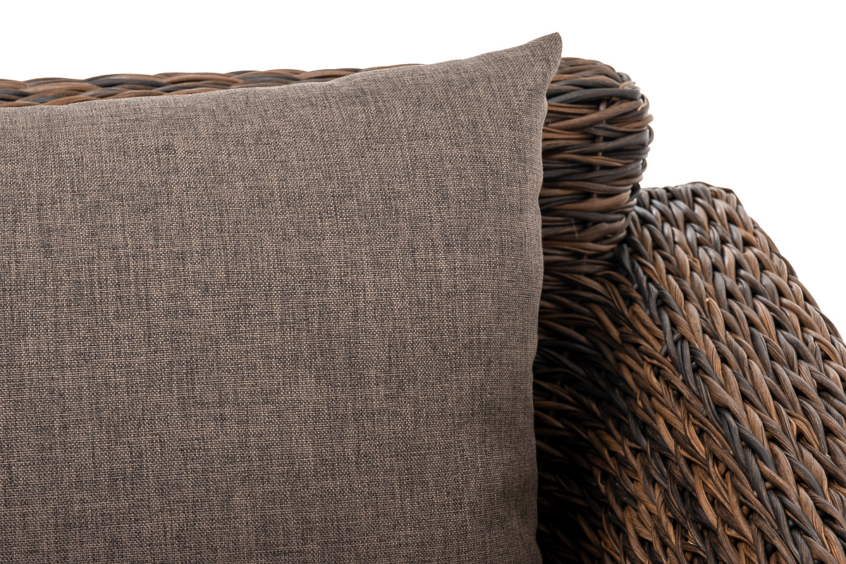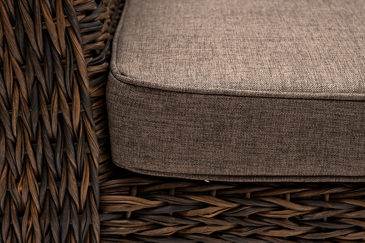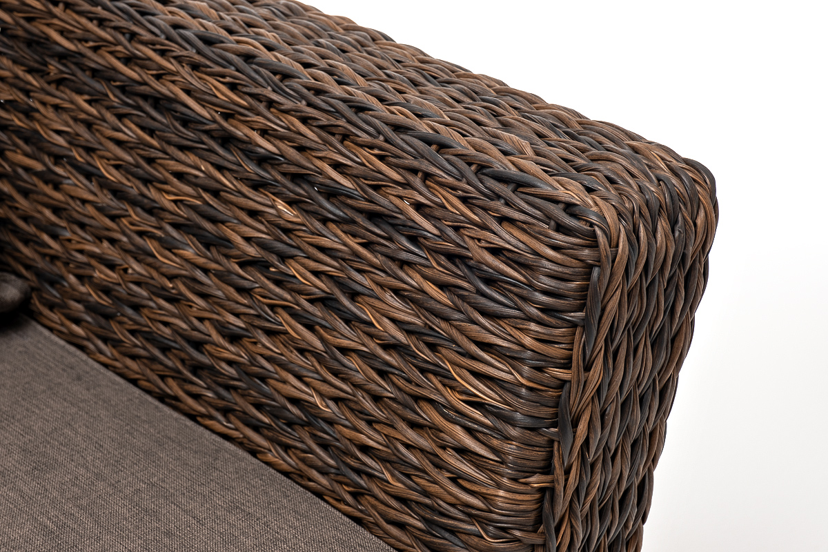 Кресло из искусственного ротанга «Капучино» коричневого цвета, прекрасно подходит для обустройства веранды, а относительно небольшой вес, который составляет 21,5 кг, увеличивает мобильность данной модели. Плетение используется вида «гиацинт».