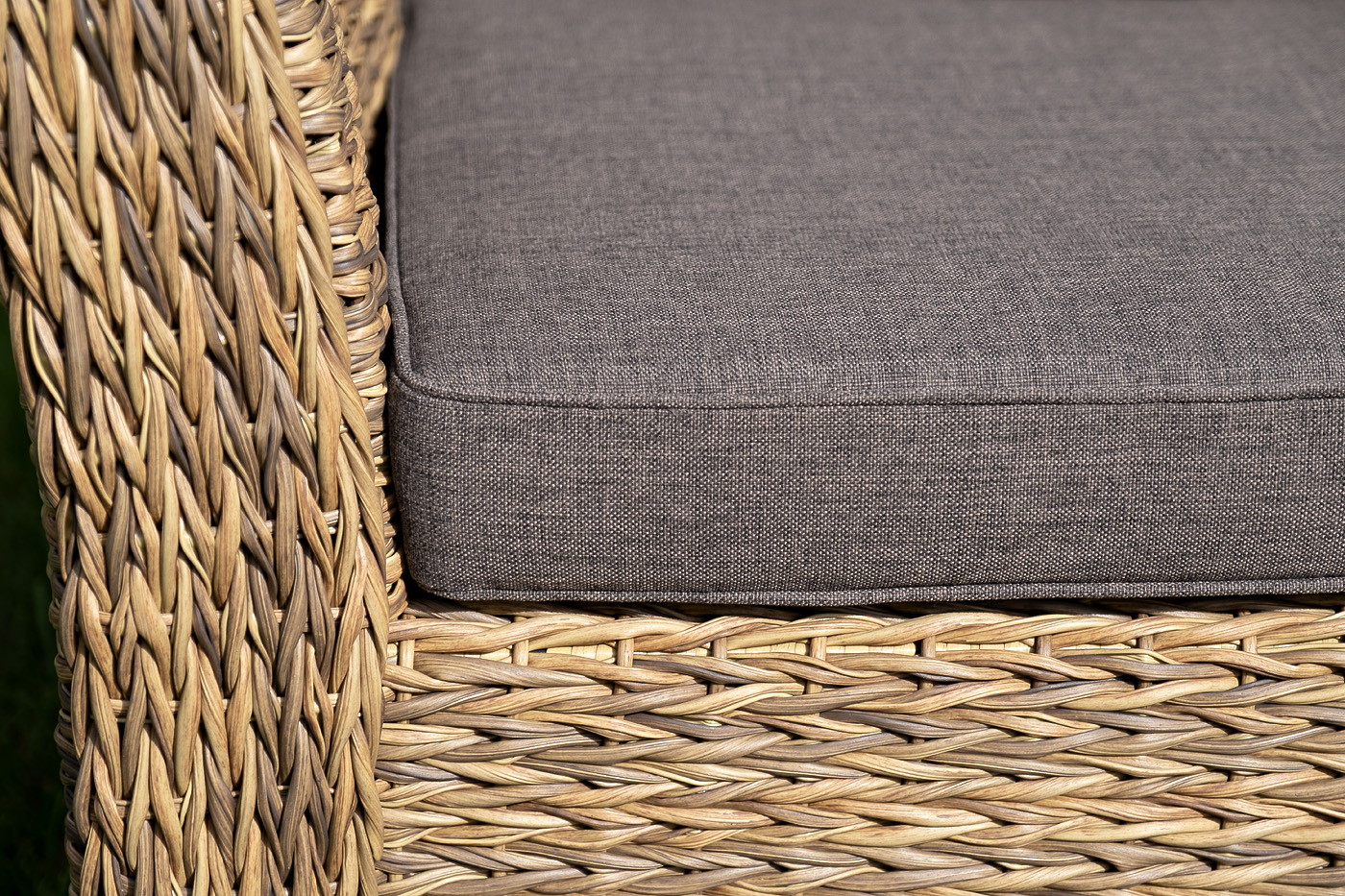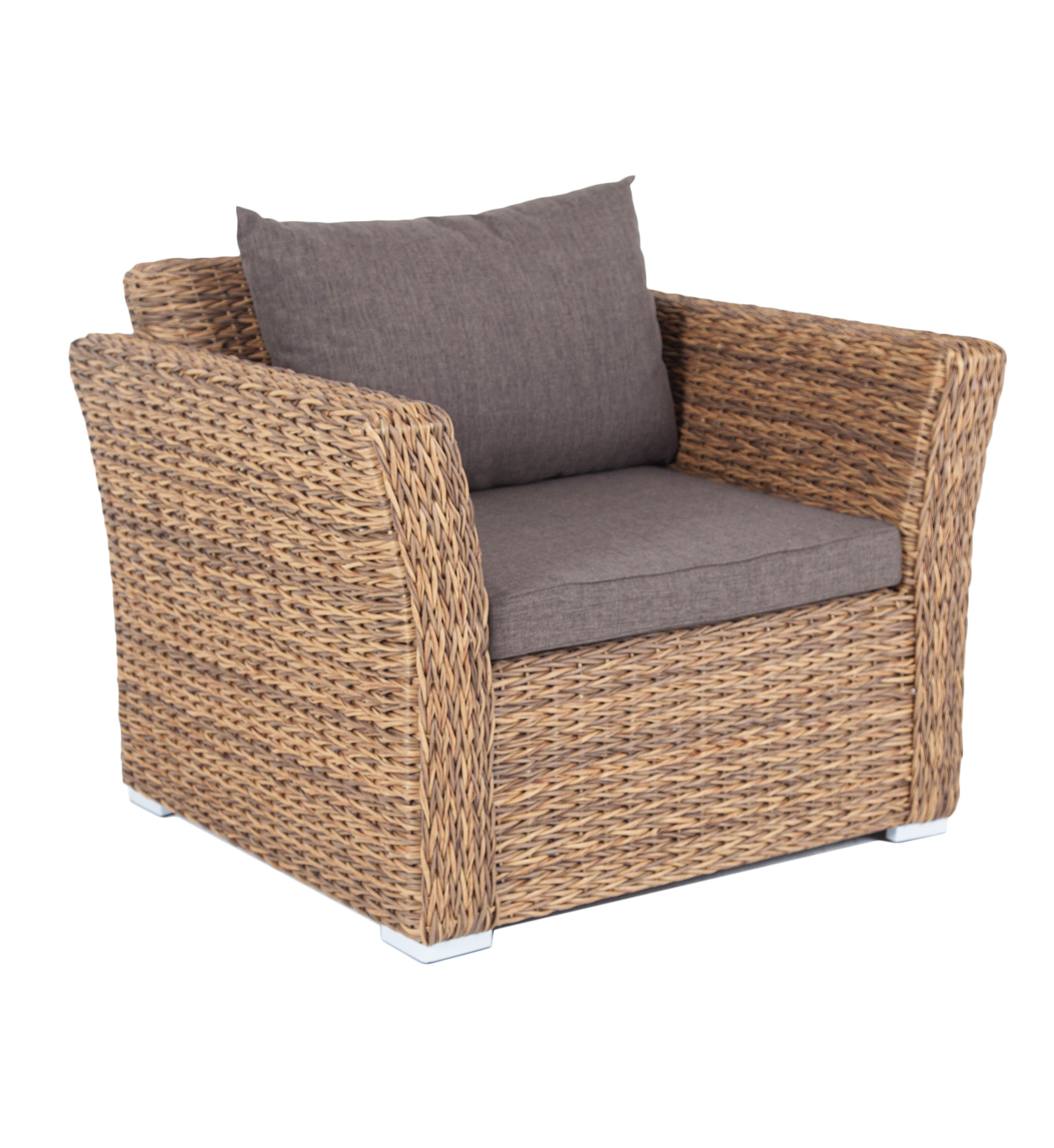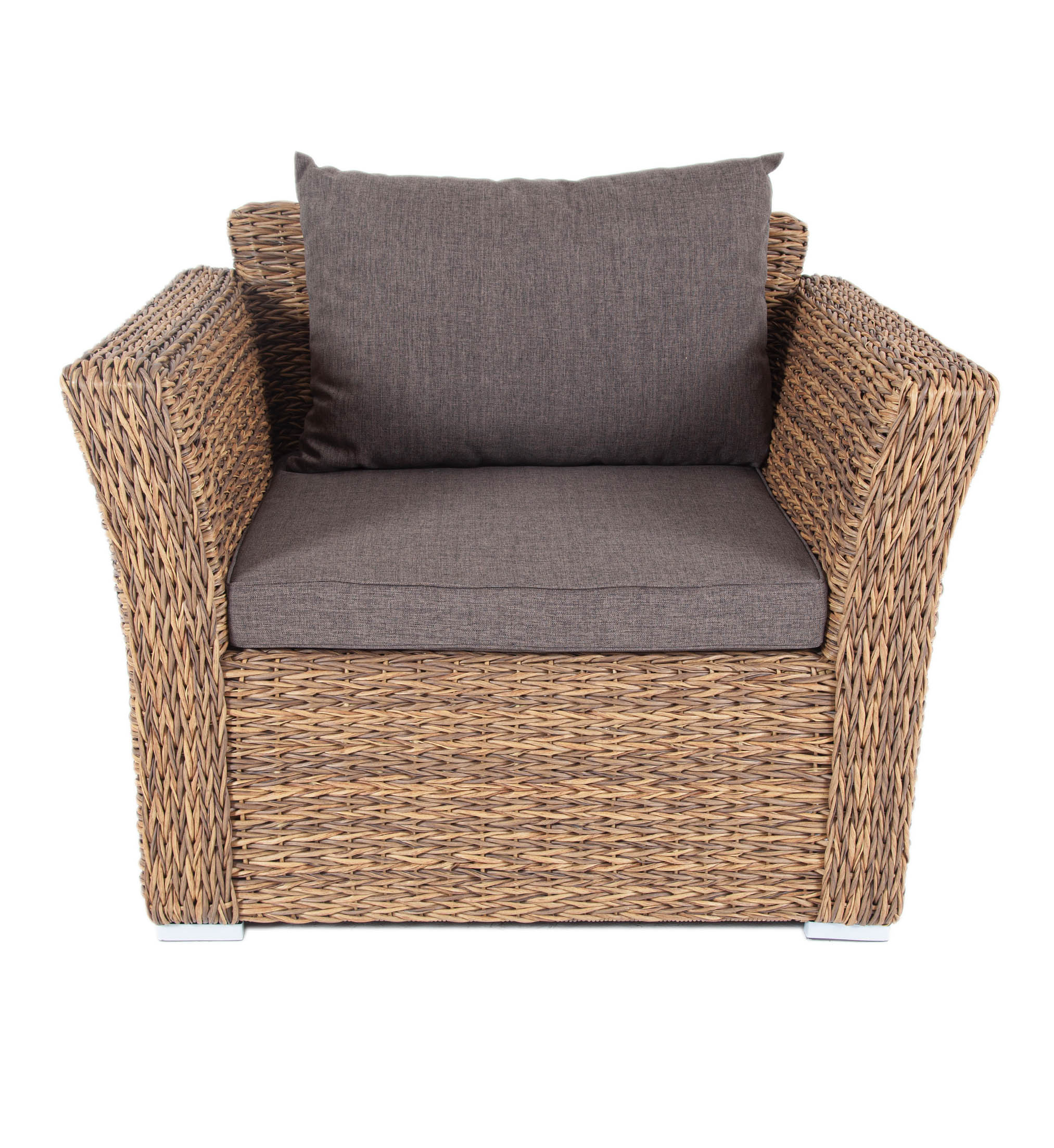 Каркас изготовлен из прочного алюминия, оплетенного вручную искусственным ротангом вида «гиацинт» соломенного оттенка.