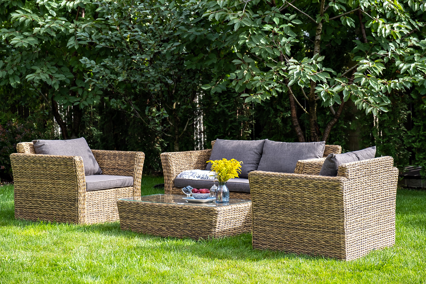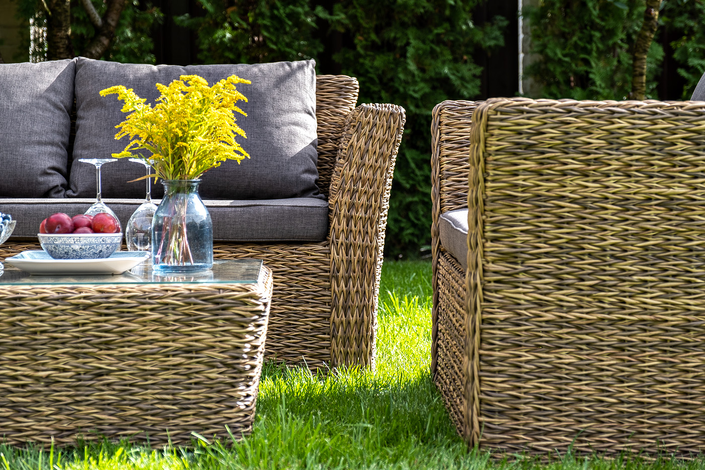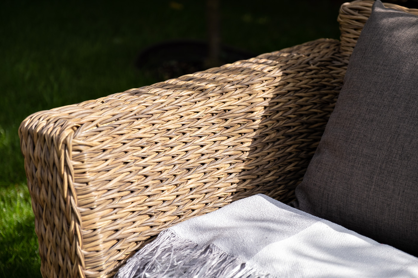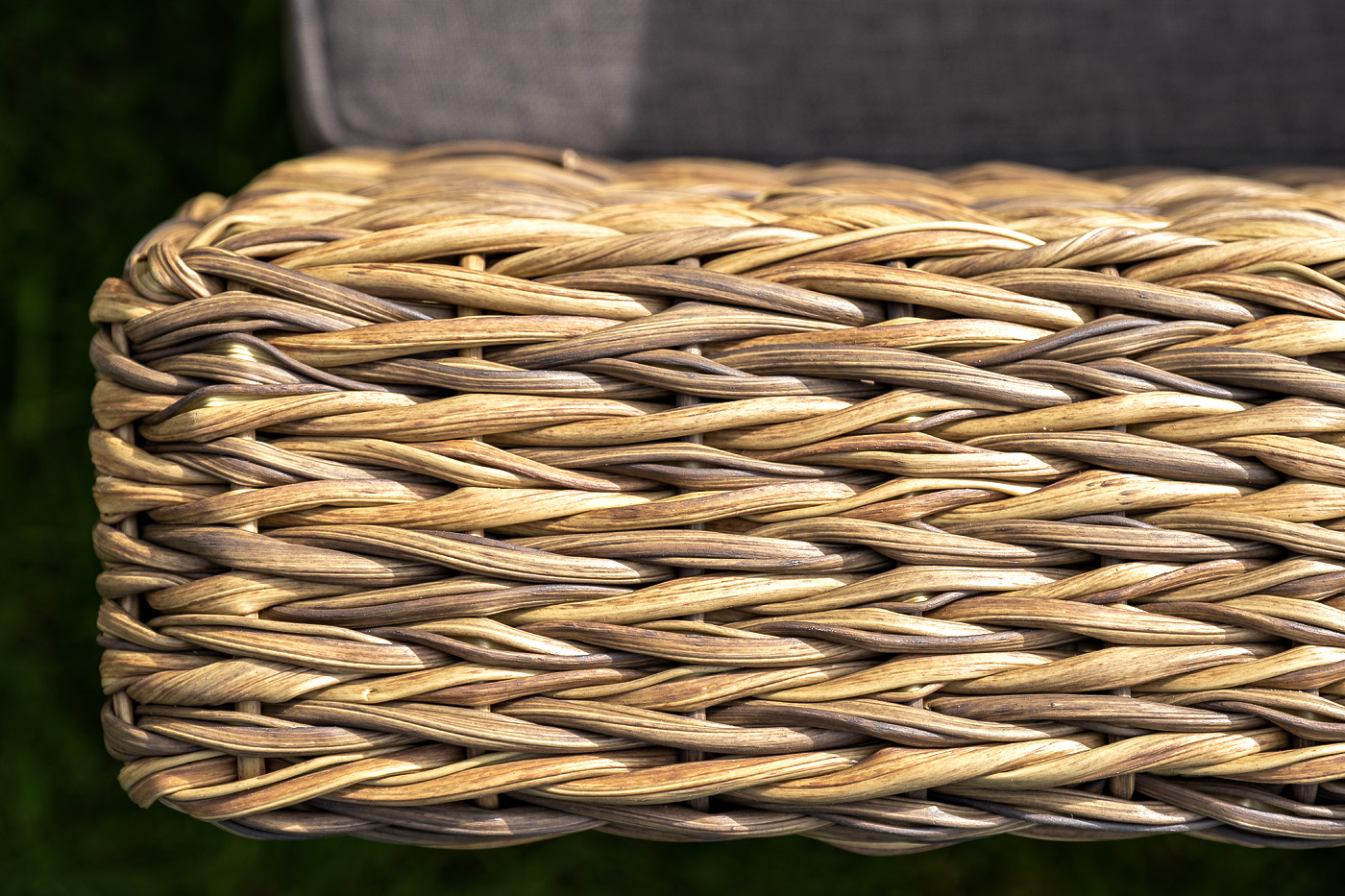 Каркас изготовлен из прочного алюминия, оплетенного вручную искусственным ротангом вида «гиацинт» соломенного оттенка.
