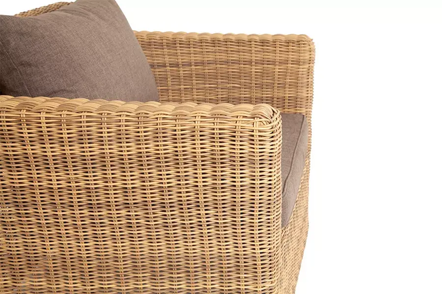 Ее отличает алюминиевый каркас высокой прочности. В качестве декоративной составляющей выступает ручное плетение на основе круглого искусственного ротанга. Оно выполнено в соломенном оттенке.