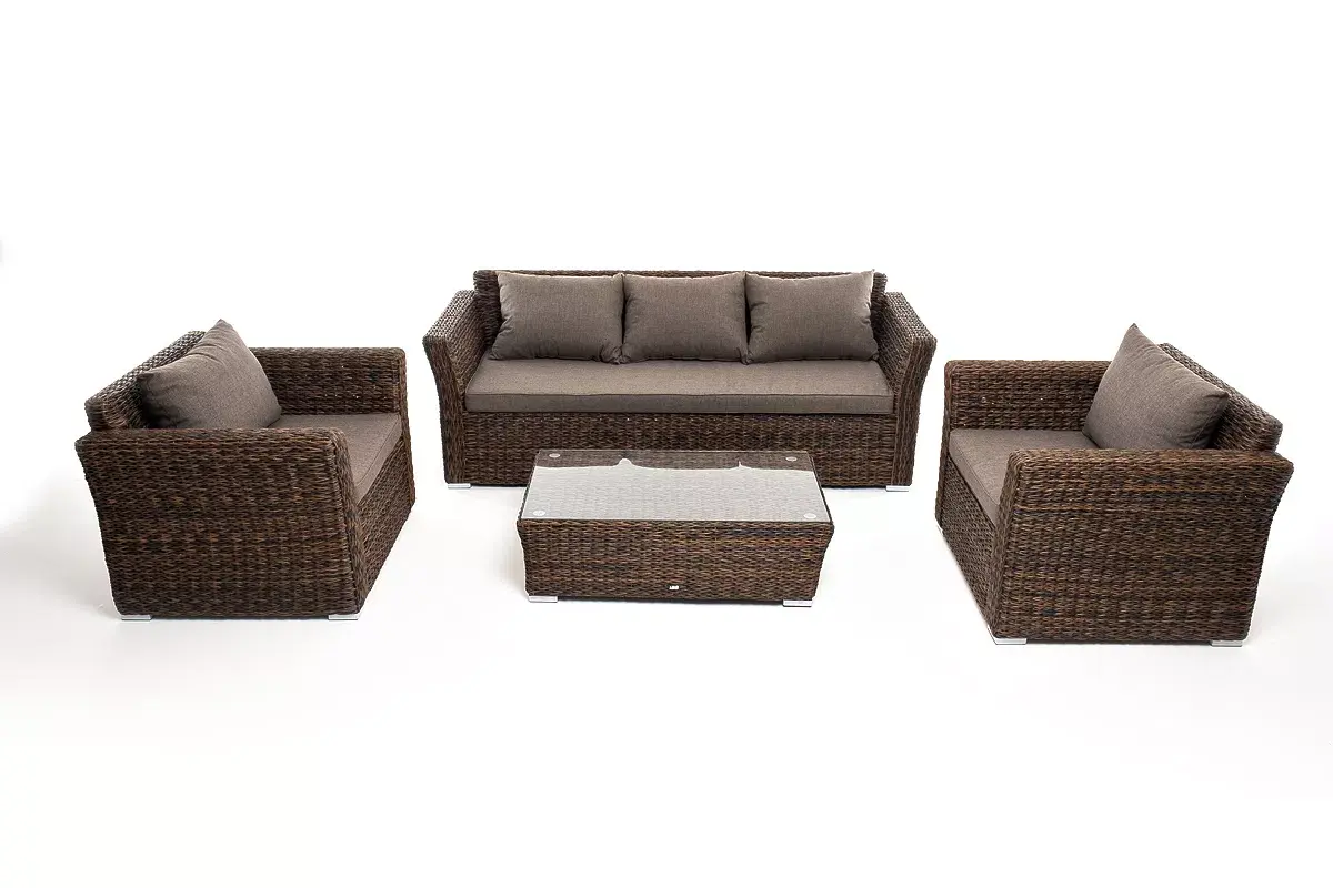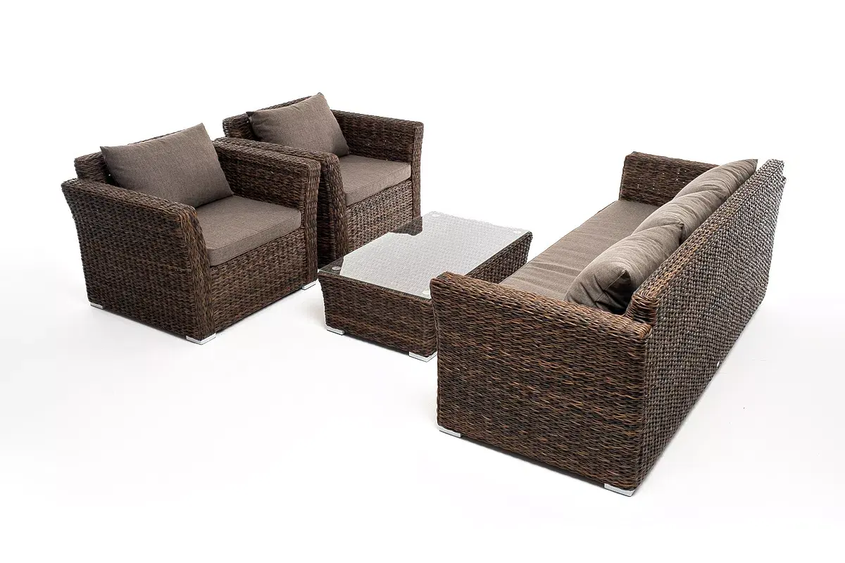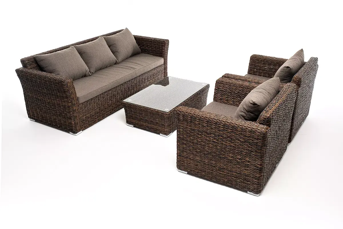 В качестве основы применяется алюминиевый каркас. Из искусственного ротанга вида "гиацинт" сделана ручная оплетка. Цвет комплекта – коричневый.