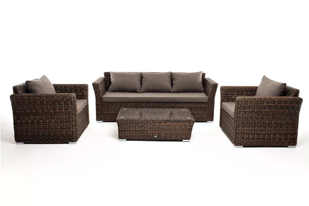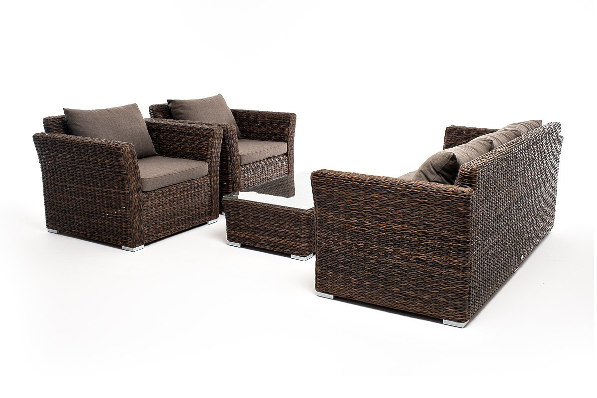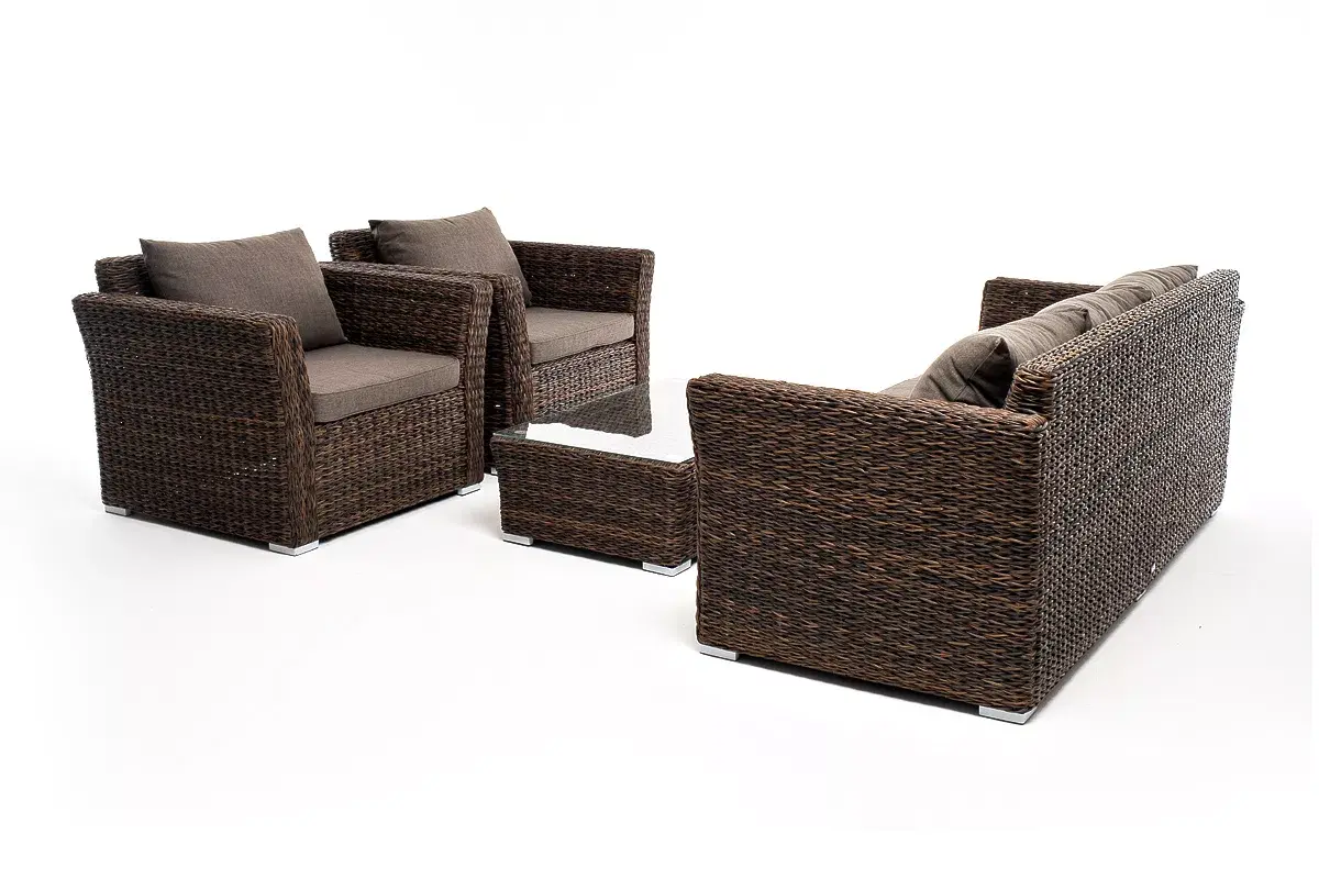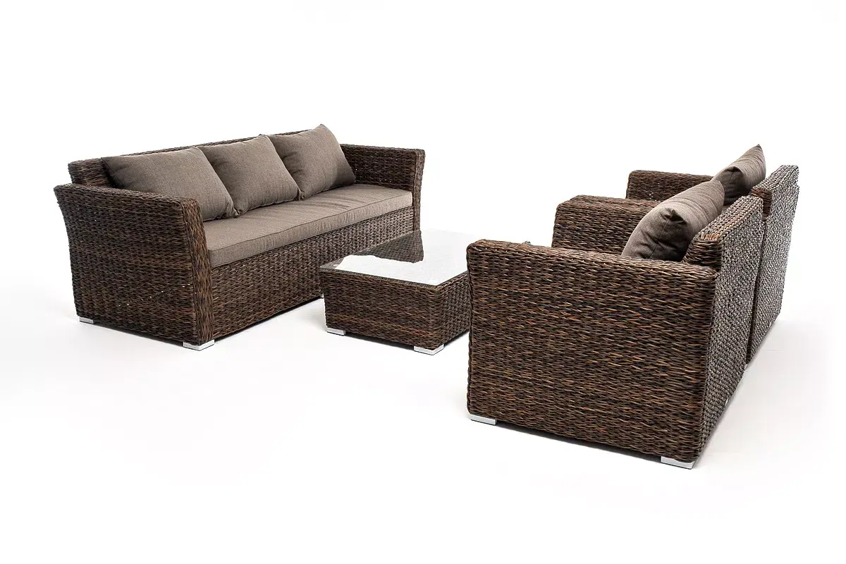 В качестве основы применяется алюминиевый каркас. Из искусственного ротанга вида "гиацинт" сделана ручная оплетка. Цвет комплекта – коричневый.