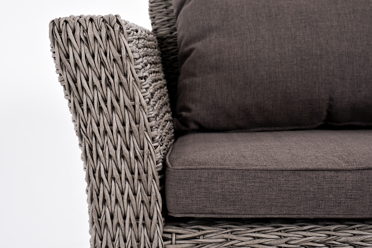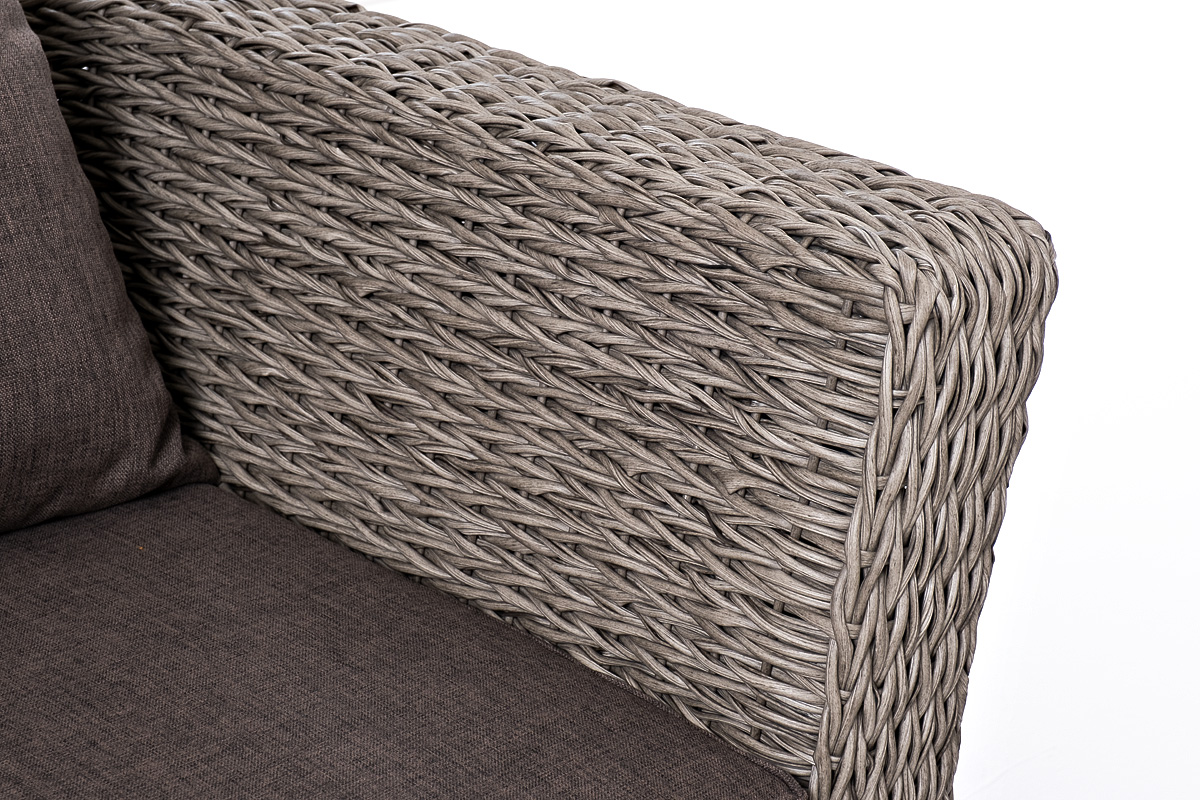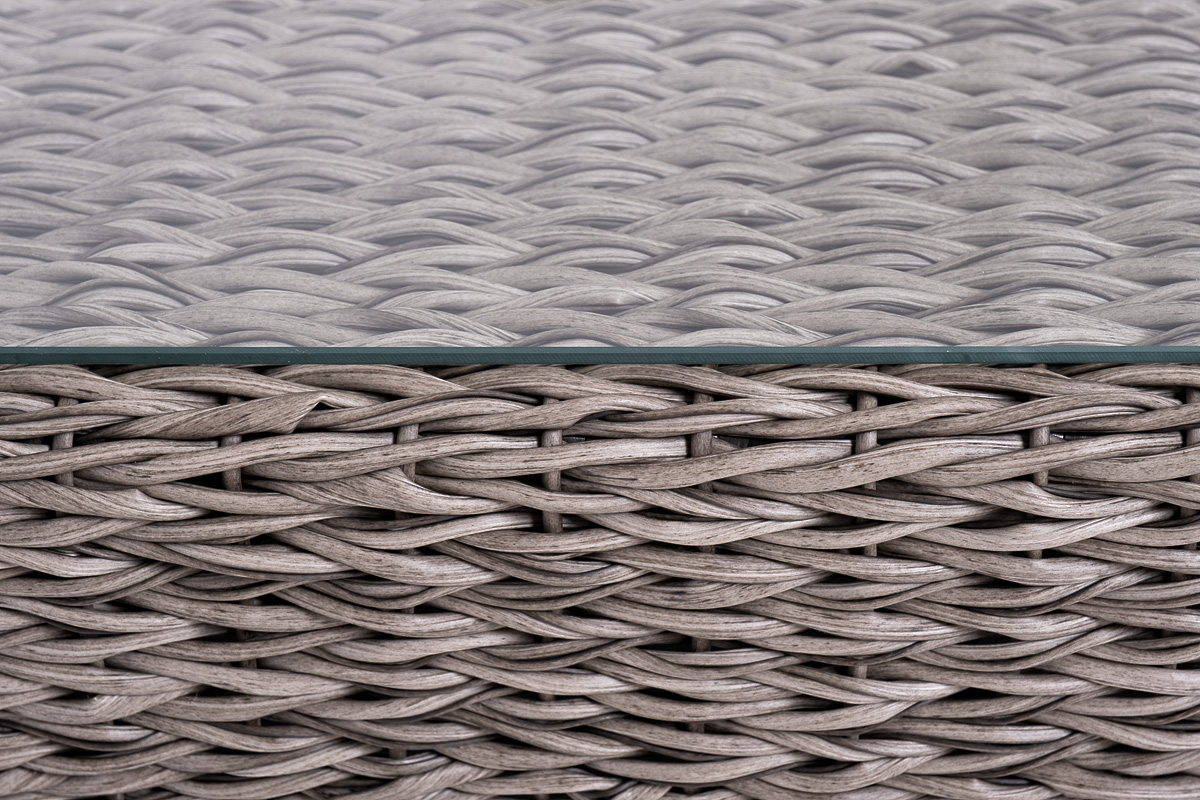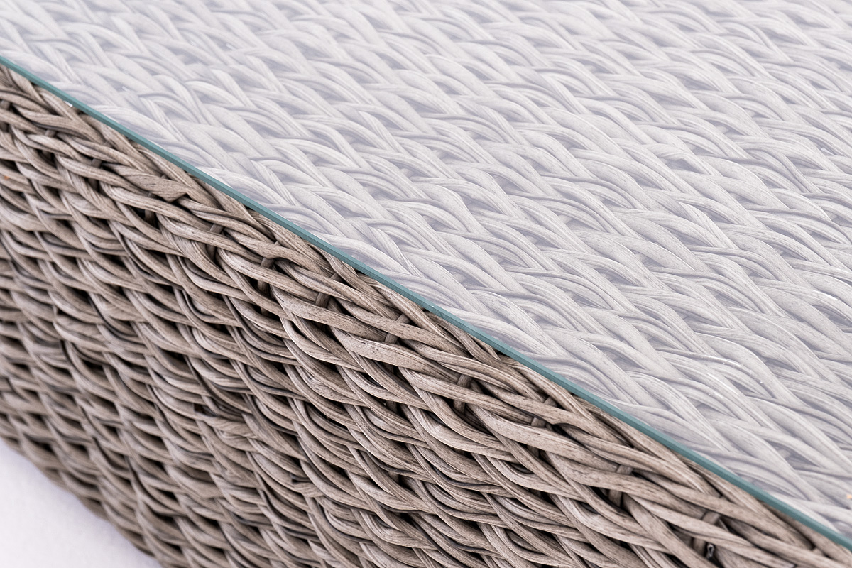 Из алюминия сделан устойчивый каркас мебели. Ее поверхность дополнена искусственным ротангом вида "гиацинт", из которого сделано ручное плетение серого цвета.