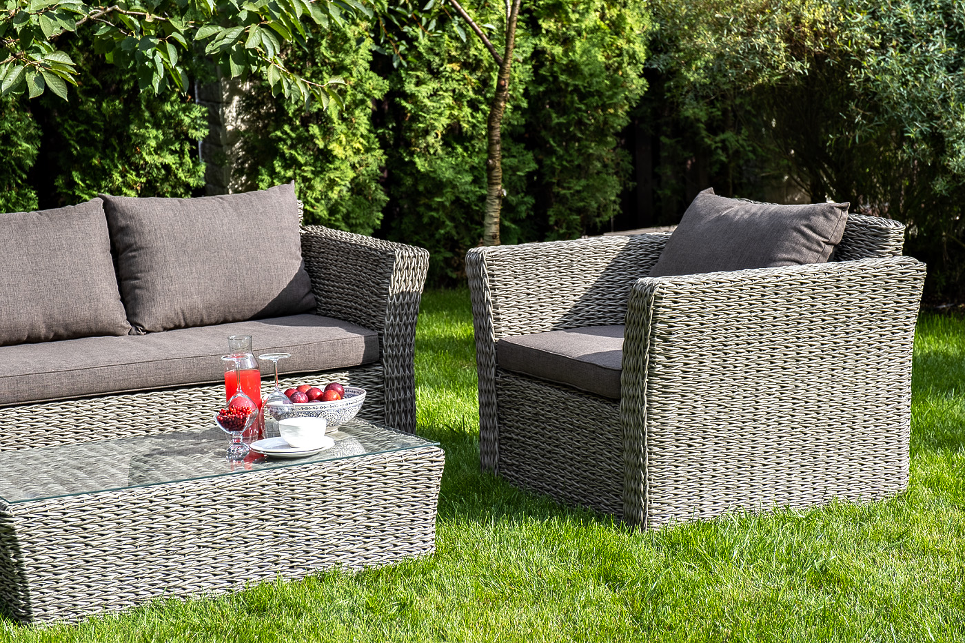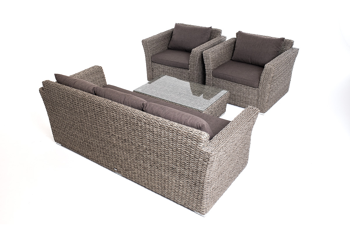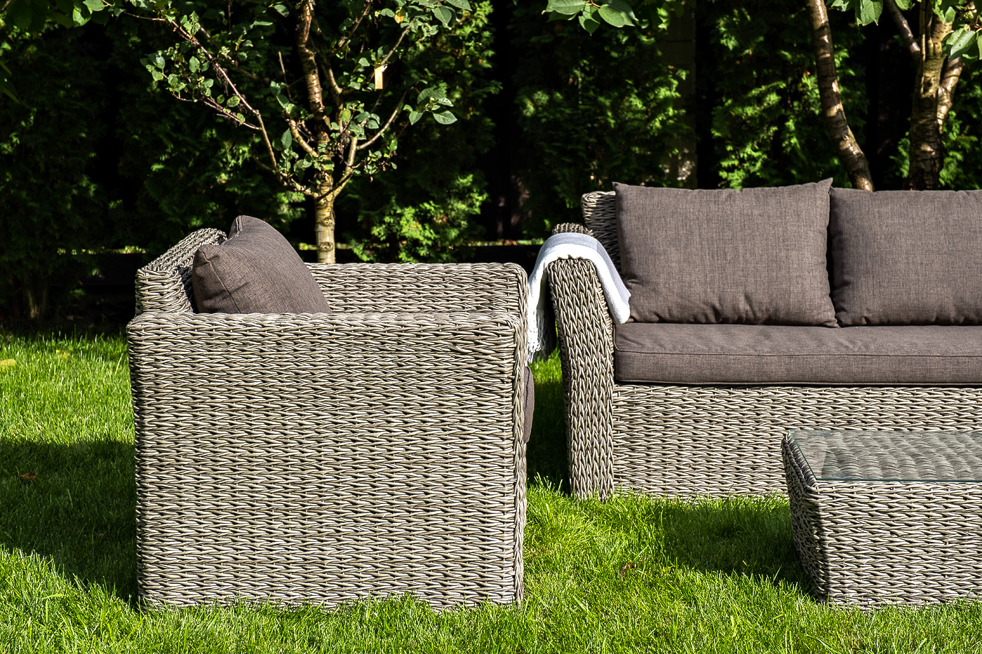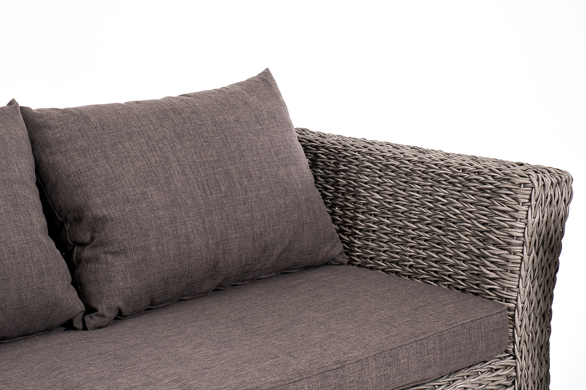 Из алюминия сделан устойчивый каркас мебели. Ее поверхность дополнена искусственным ротангом вида "гиацинт", из которого сделано ручное плетение серого цвета.