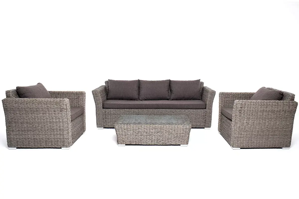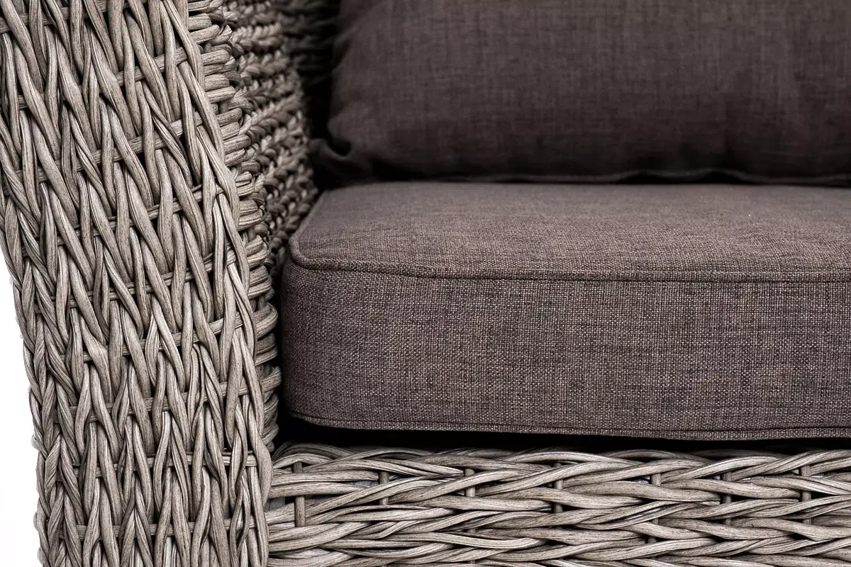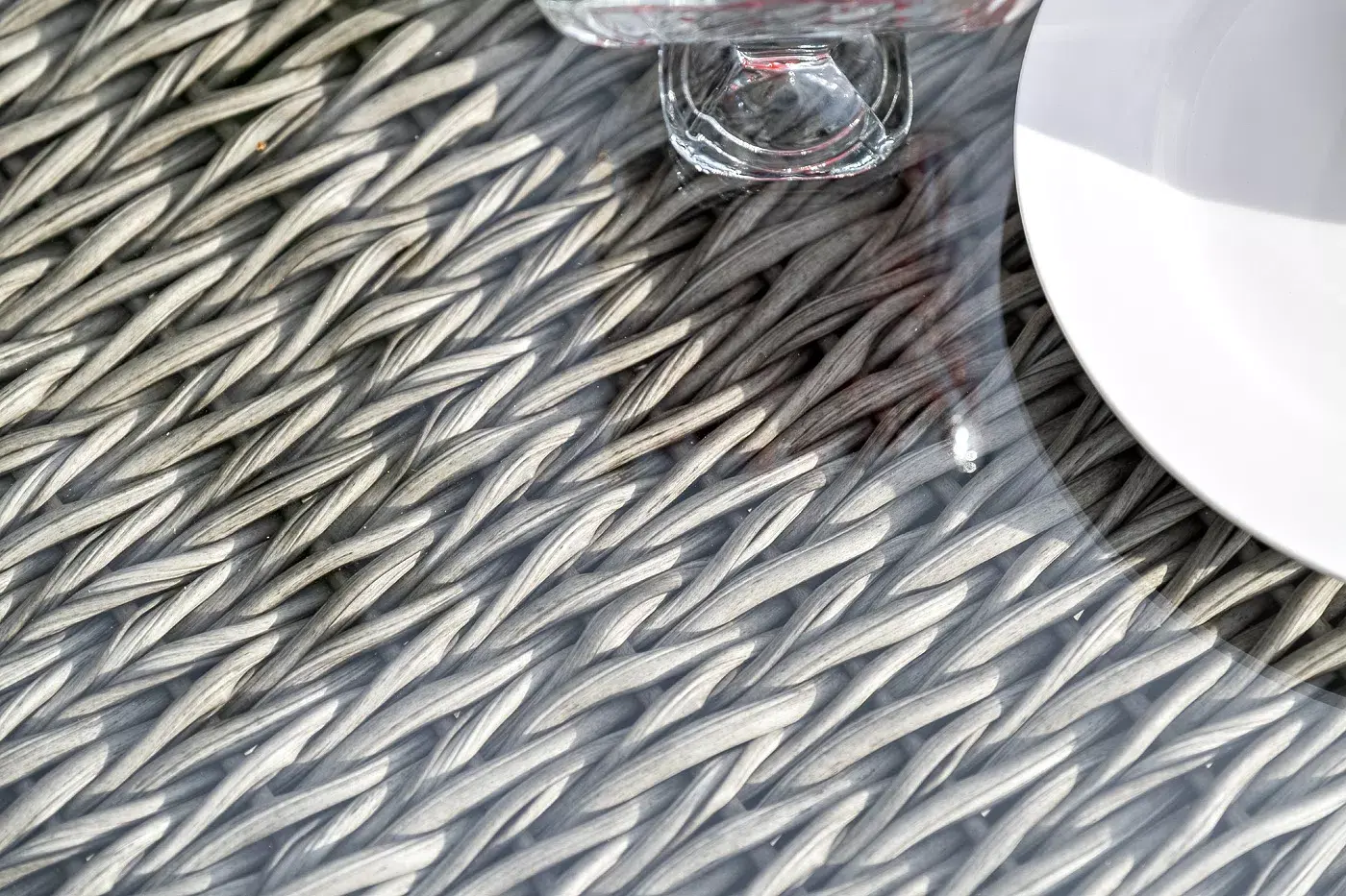 Из алюминия сделан устойчивый каркас мебели. Ее поверхность дополнена искусственным ротангом вида "гиацинт", из которого сделано ручное плетение серого цвета.