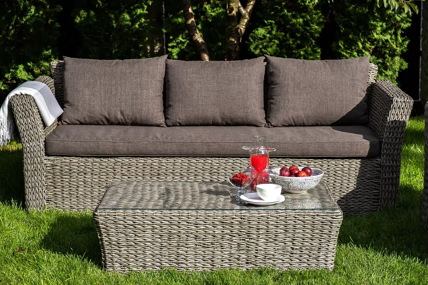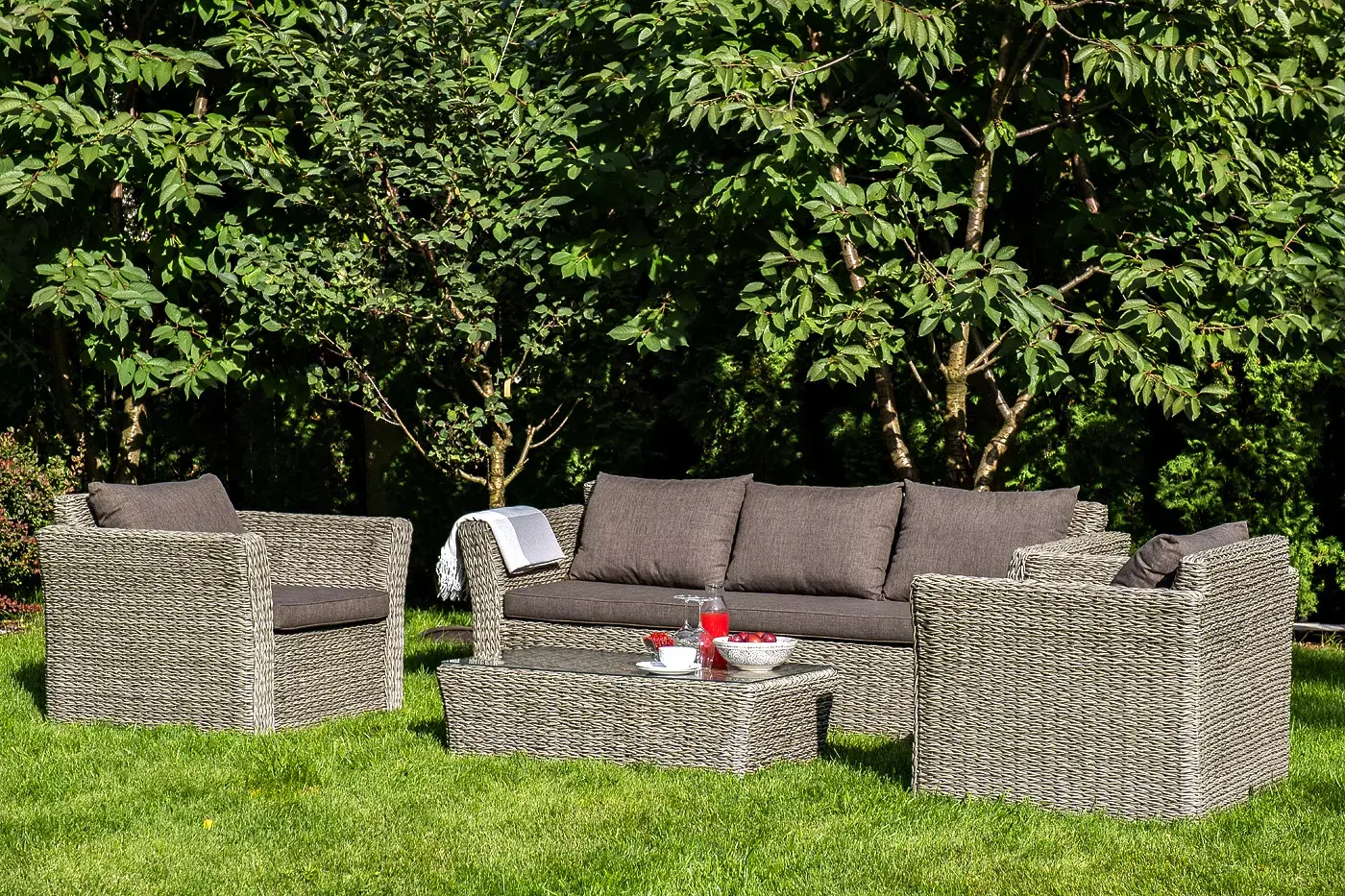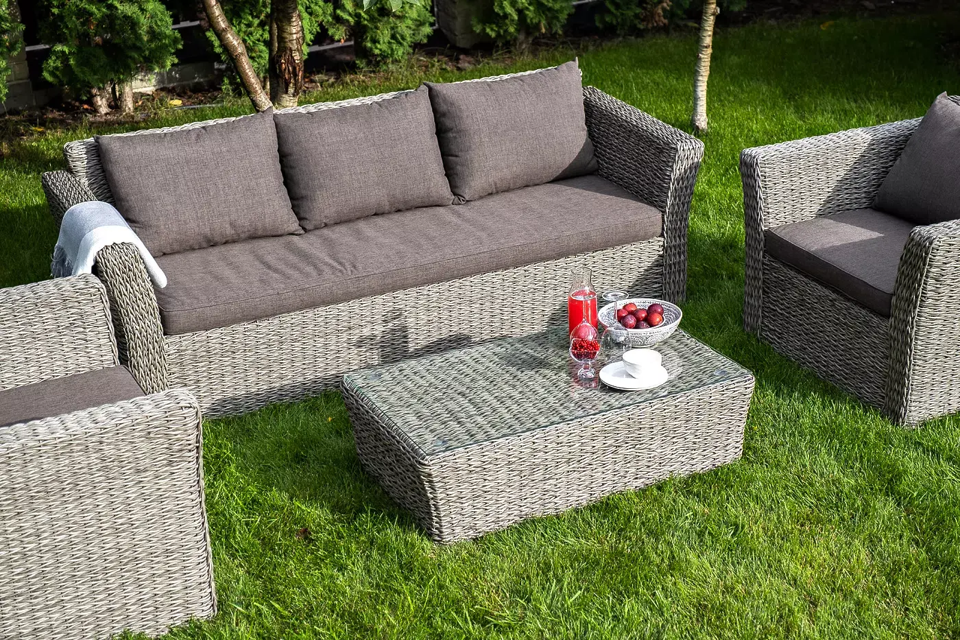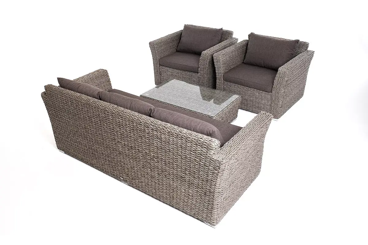 Кресла и диван идут в комплекте с подушками с серыми чехлами. Они пошиты из качественного полиэстера с плотностью 300гр/м2. Материал предварительно проходит обработку влагоотталкивающей пропиткой. Столик дополнен практичной столешницей из стекла толщиной 5 мм.