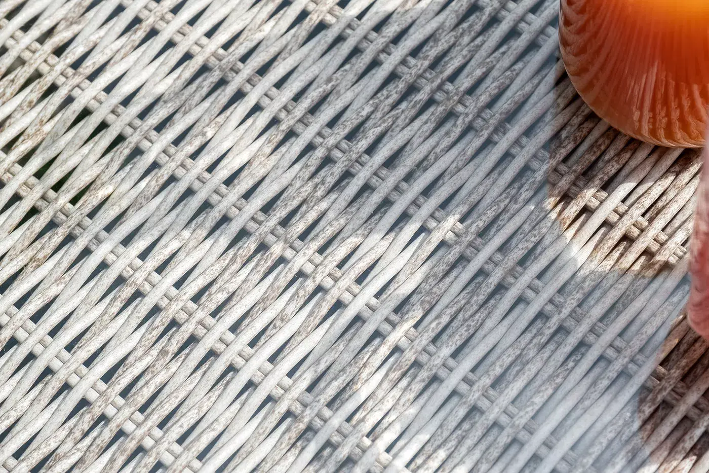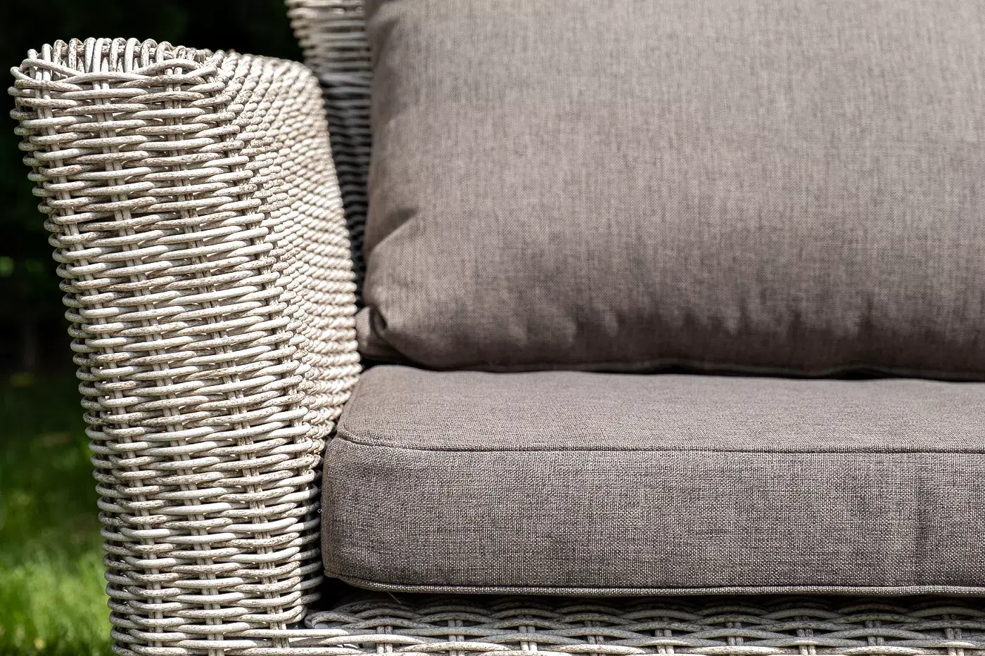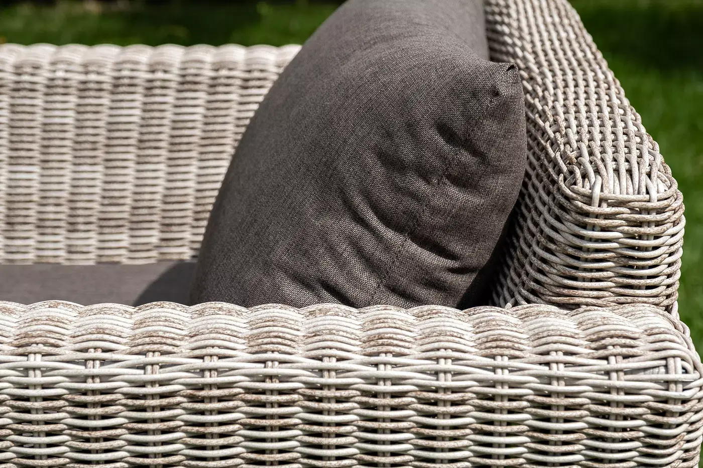 Из алюминия сделан устойчивый каркас мебели. Ее поверхность дополнена искусственным ротангом, из которого сделано ручное плетение, цвет бежевый.