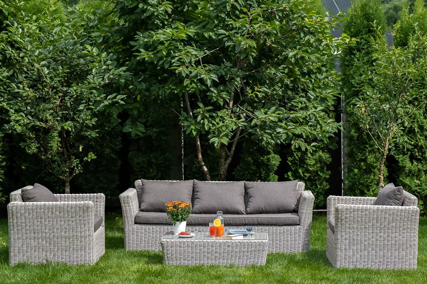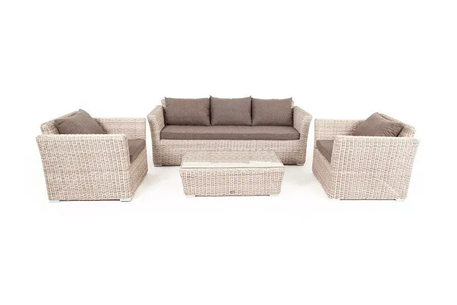 Кресла и диван идут в комплекте с подушками с серыми чехлами. Они пошиты из качественного полиэстера с плотностью 300гр/м2. Материал предварительно проходит обработку влагоотталкивающей пропиткой. Столик дополнен практичной столешницей из стекла толщиной 5 мм.
