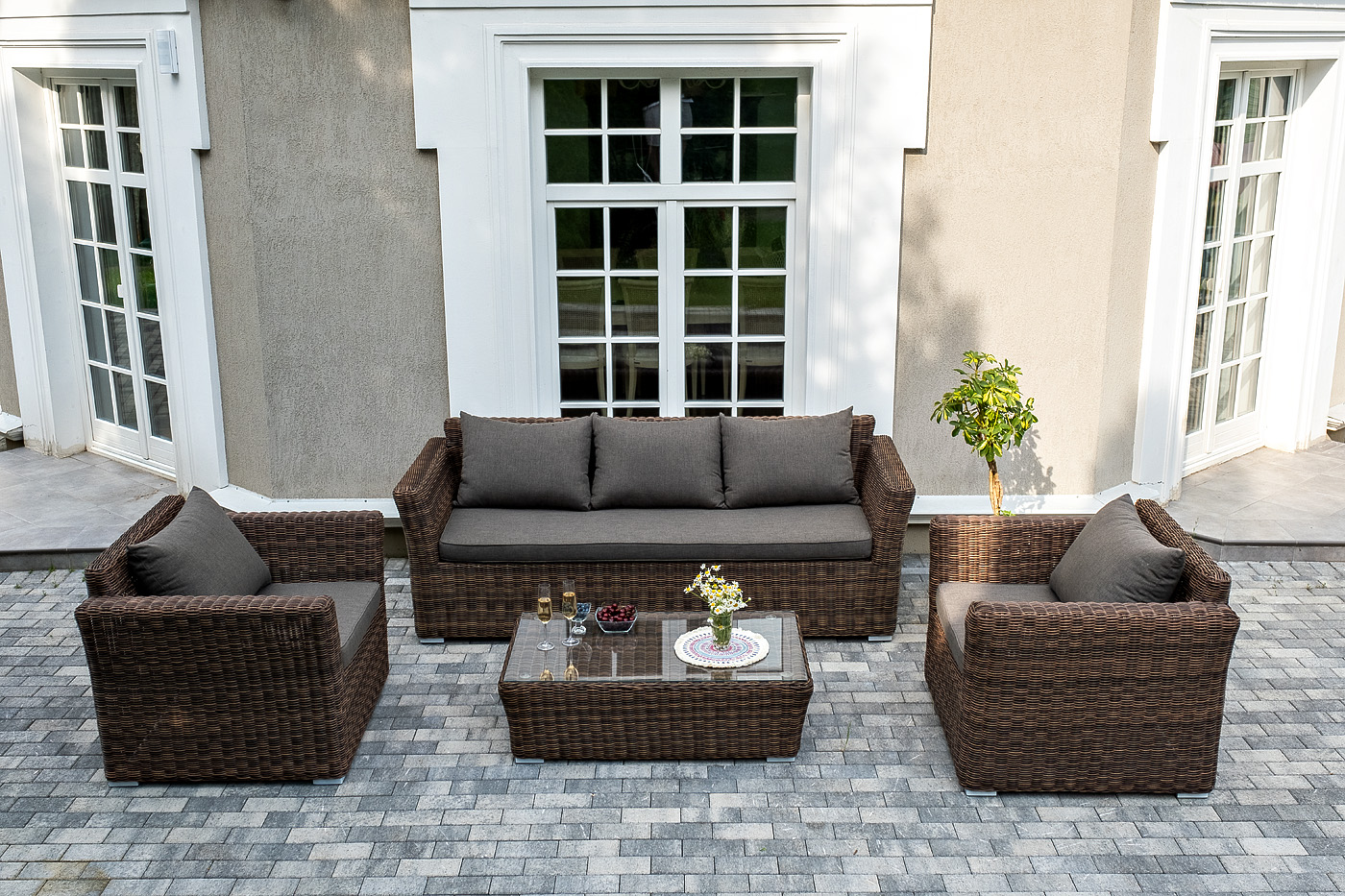 В качестве основы применяется алюминиевый каркас. Из круглого искусственного ротанга сделана ручная оплетка. Цвет комплекта – коричневый.