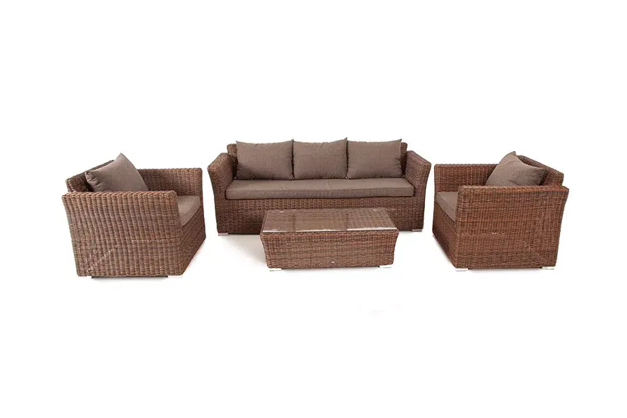В качестве основы применяется алюминиевый каркас. Из круглого искусственного ротанга сделана ручная оплетка. Цвет комплекта – коричневый.