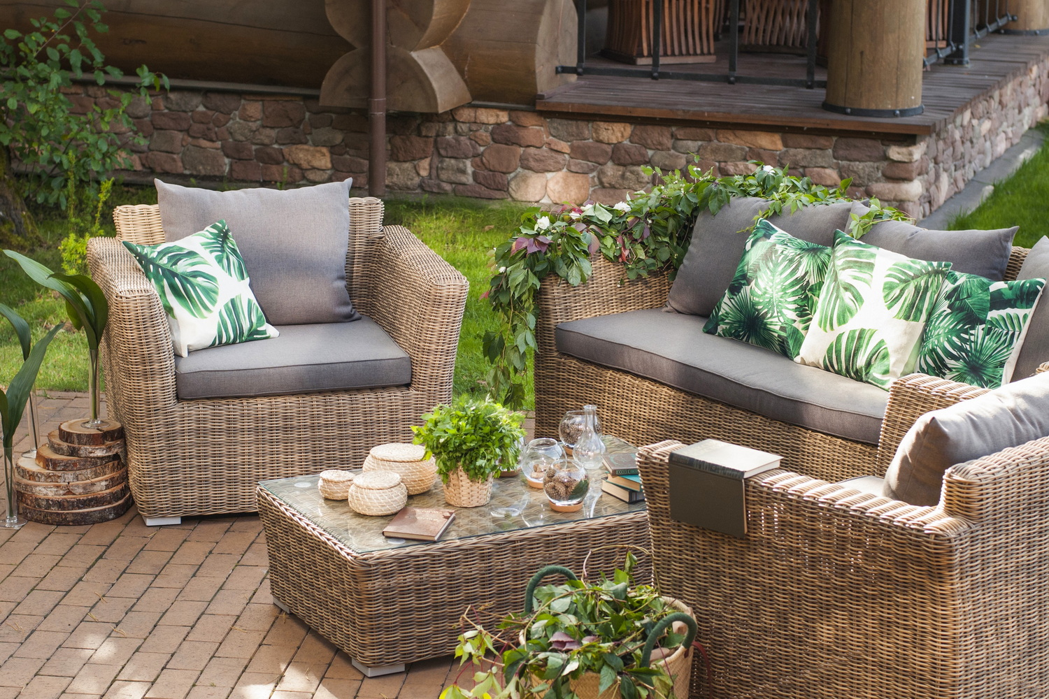 Кресла и диван идут в комплекте с подушками с серыми чехлами. Они пошиты из качественного полиэстера с плотностью 300гр/м2. Материал предварительно проходит обработку влагоотталкивающей пропиткой. Столик дополнен практичной столешницей из стекла толщиной 5 мм.