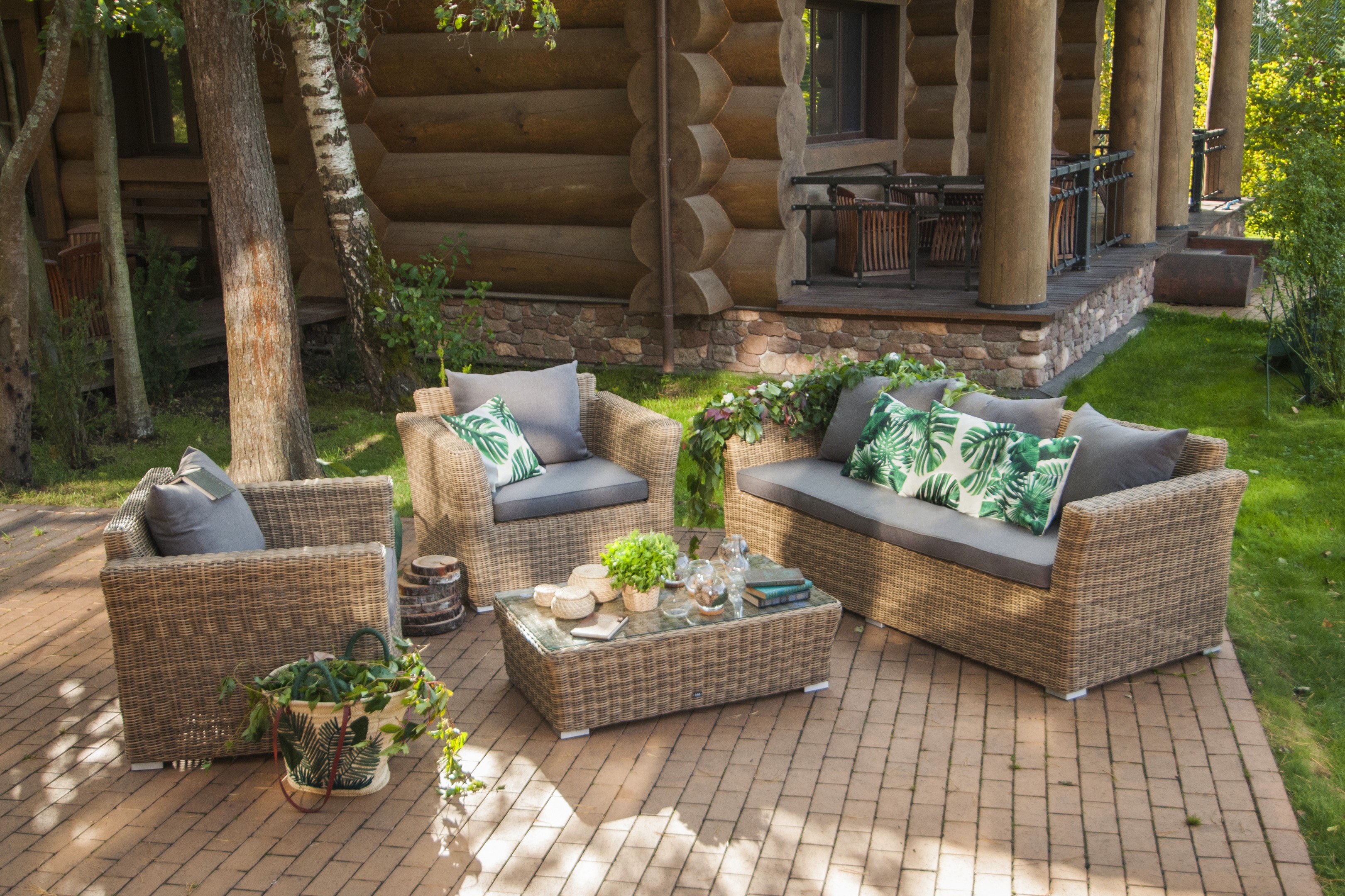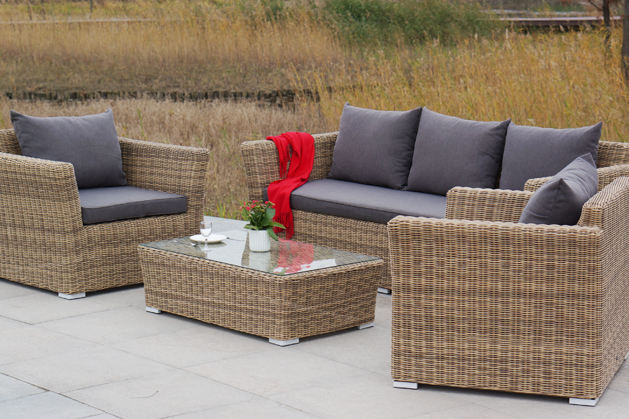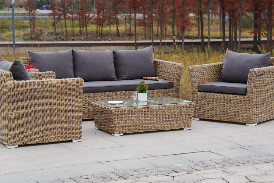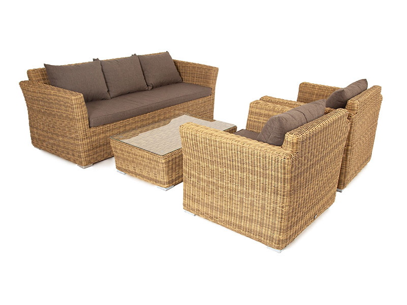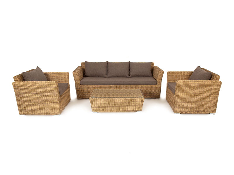 Из алюминия сделан устойчивый каркас мебели. Ее поверхность дополнена искусственным ротангом, из которого сделано ручное плетение, цвет соломенный.