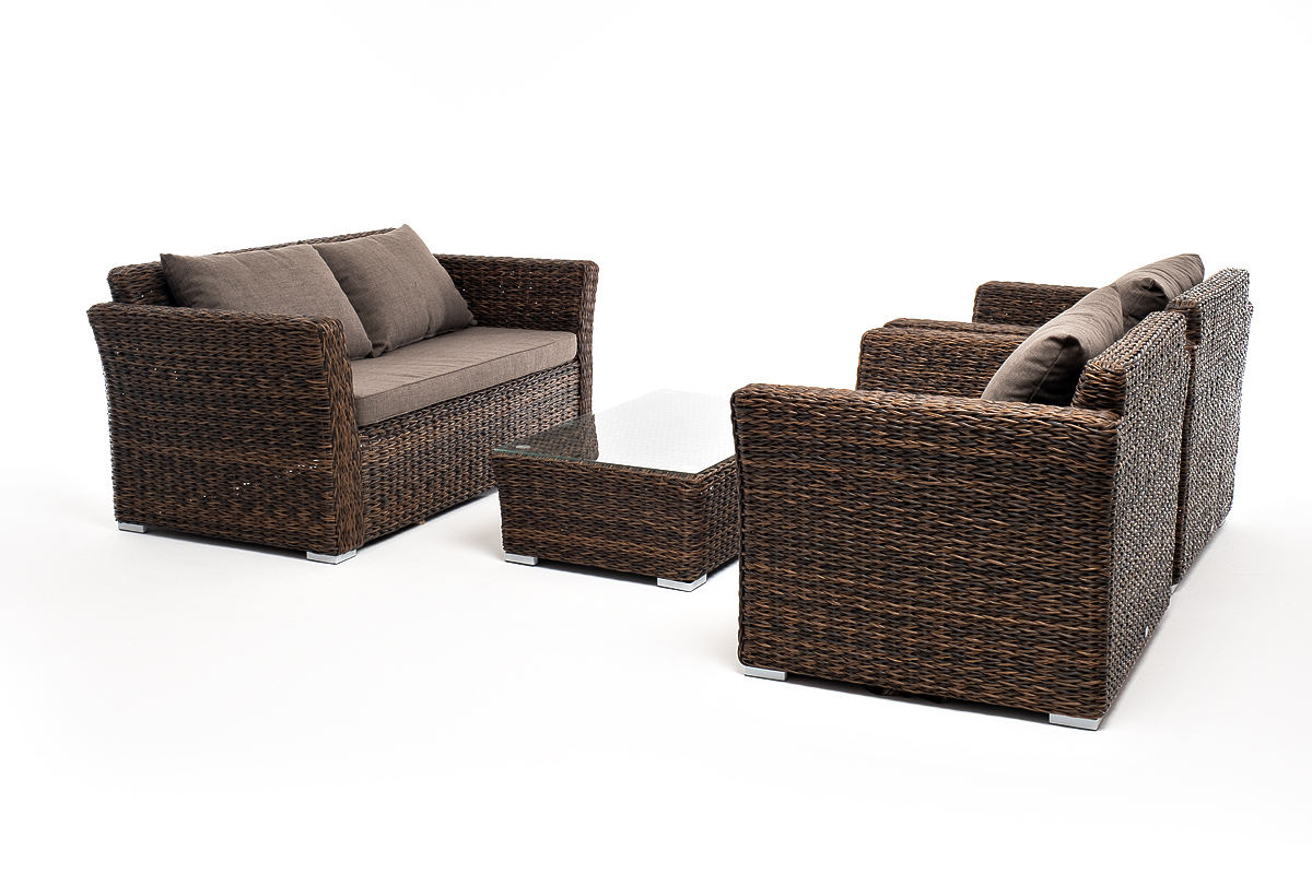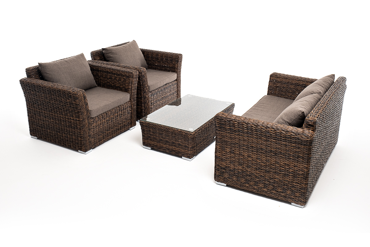 Мебель изготовлена из алюминиевого каркаса и круглого искусственного ротанга "вида гиацинт". Цвет комплекта – коричневый.