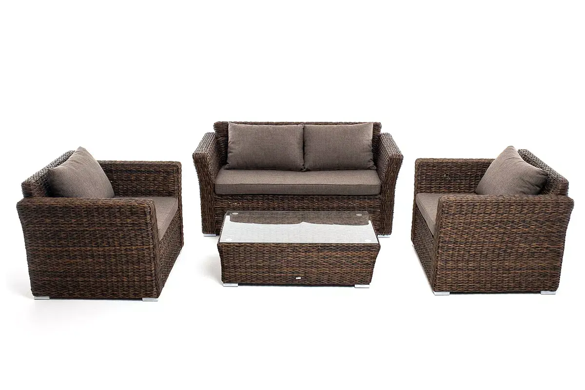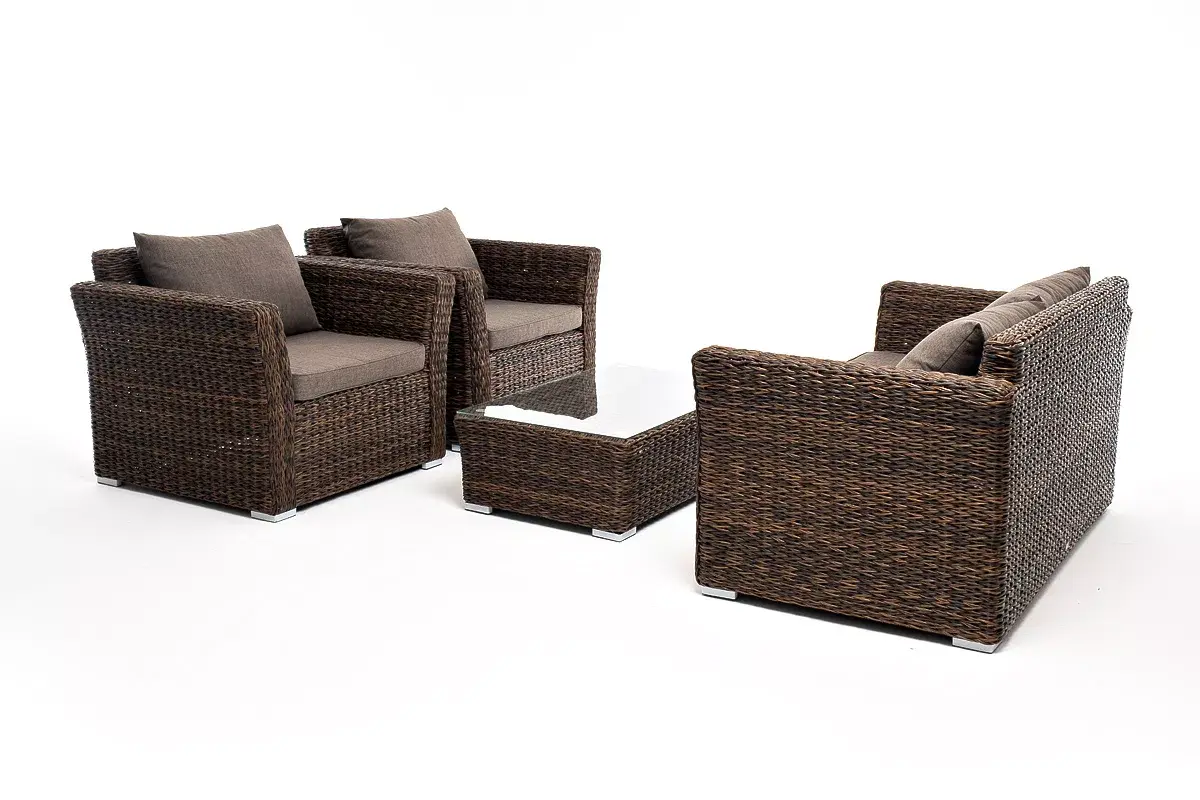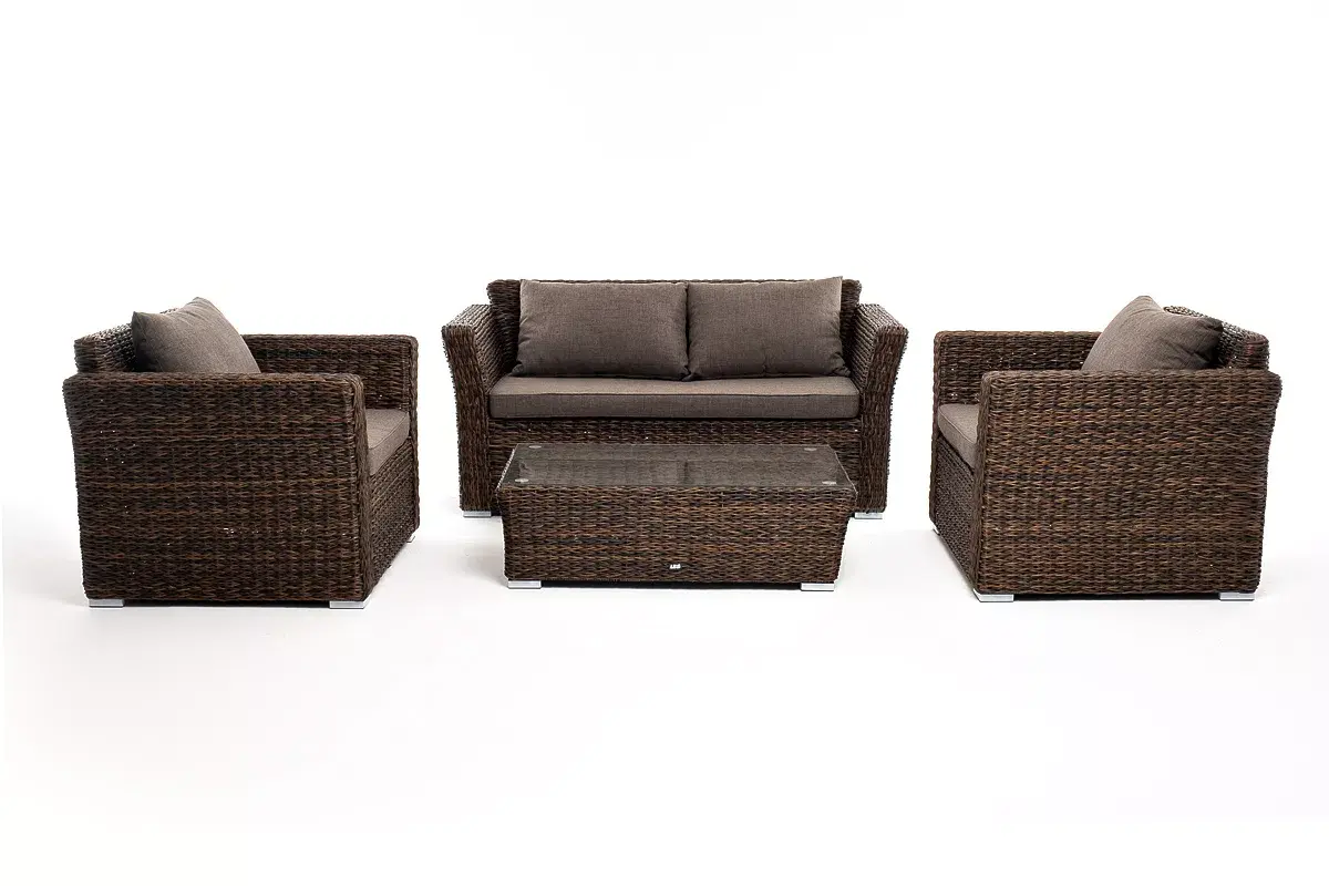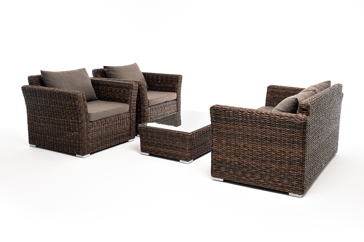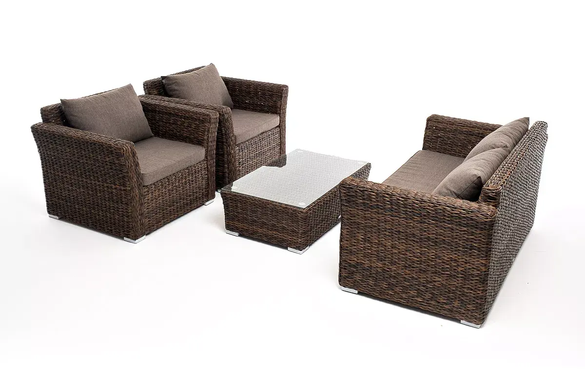 Мебель изготовлена из алюминиевого каркаса и круглого искусственного ротанга "вида гиацинт". Цвет комплекта – коричневый.